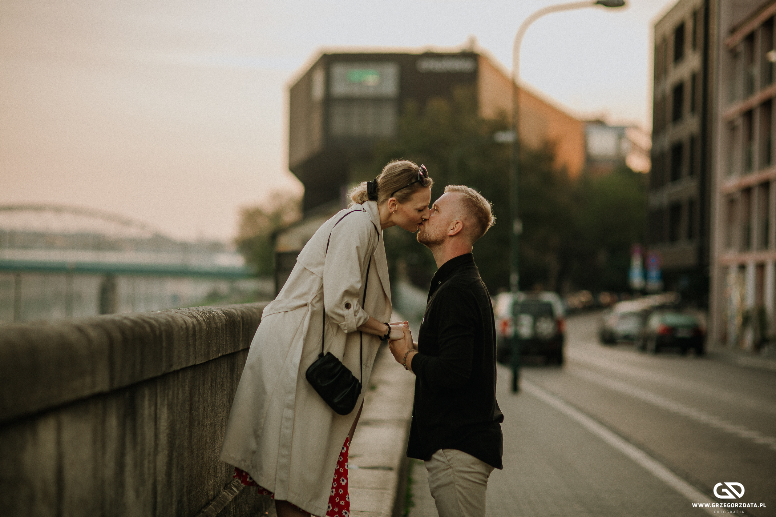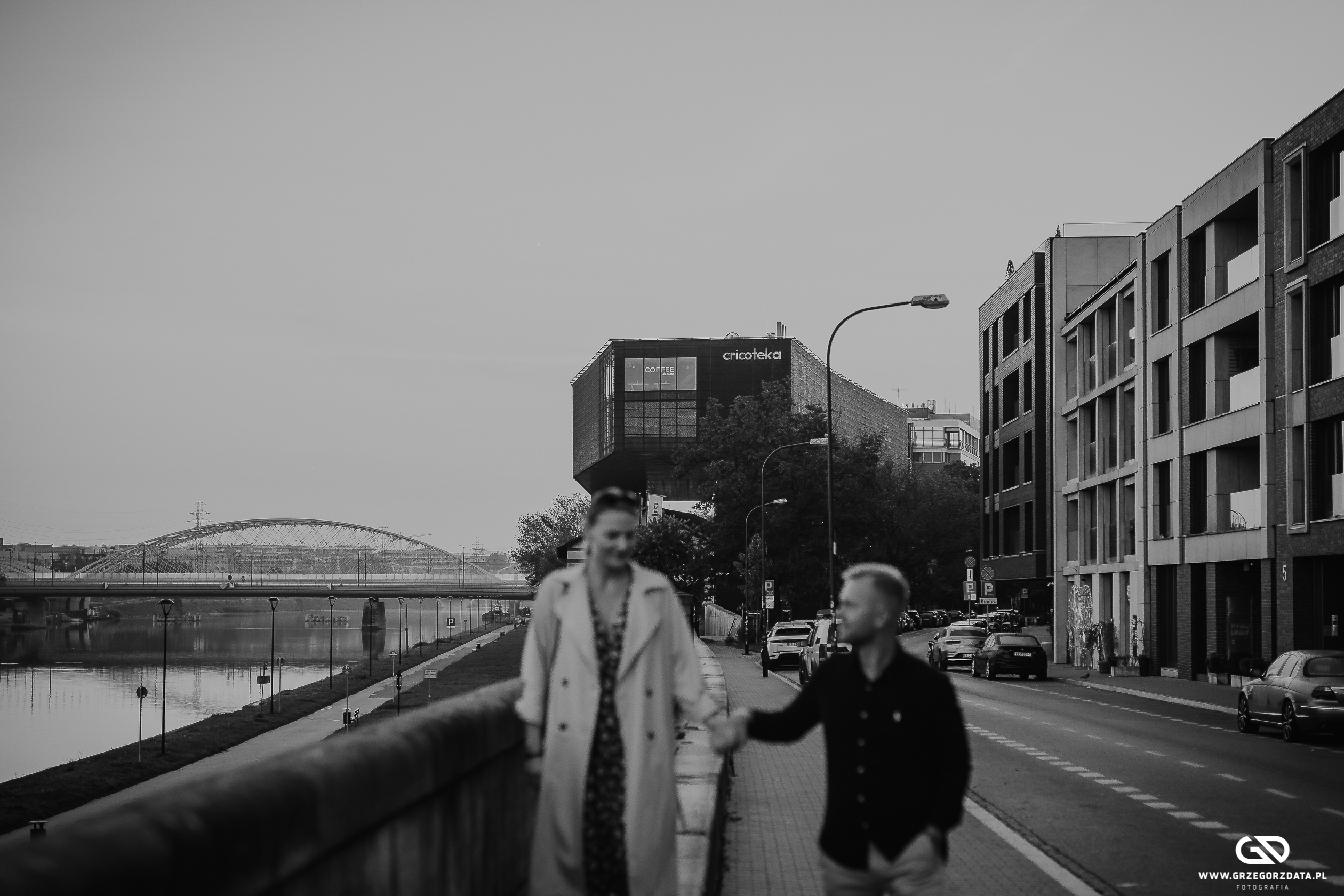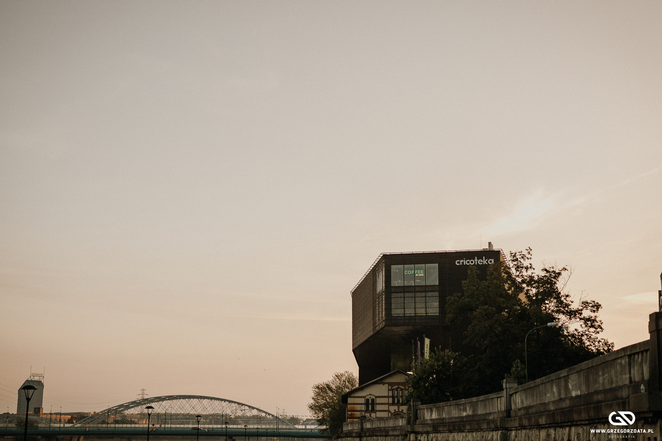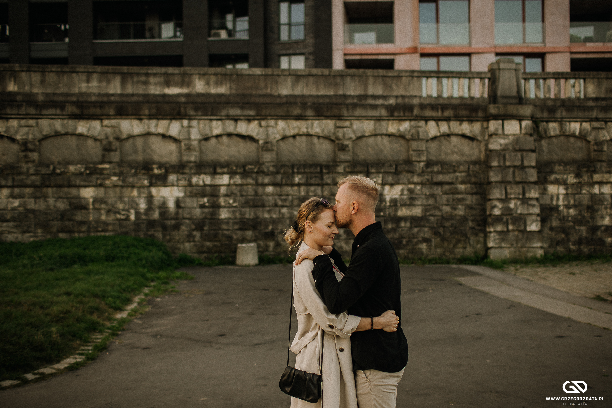 Gdziekolwiek prowadziły nas emocje, odkrywaliśmy nowe miejsca, wśród których warto było zrobić chociaż jedno, nierzadko spontaniczne zdjęcie. Zabłocie, którego nazwa pochodzi od słów „za błotem”, przyjęło nas z tym, co najpiękniejsze. W średniowieczu to tutaj rozwijał się przemysł i port rzeczny, który służył do spławiania soli z Wieliczki. Później to miejsce stało się idealnym terenem strategicznym. Aktualnie na zakolu Wisły można poczuć idealną do fotografowania przestrzeń w industrialnym klimacie. Podczas sesji zdjęciowej w tym miejscu nie zabrakło radości i delikatnych gestów miłości.
