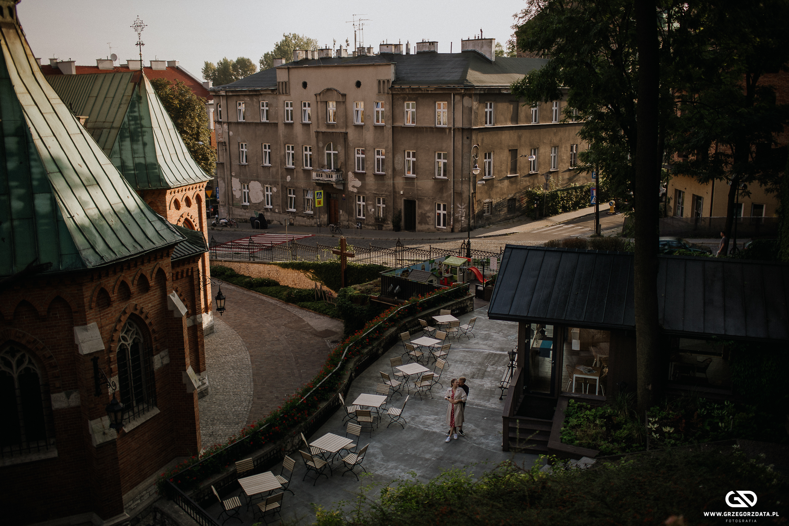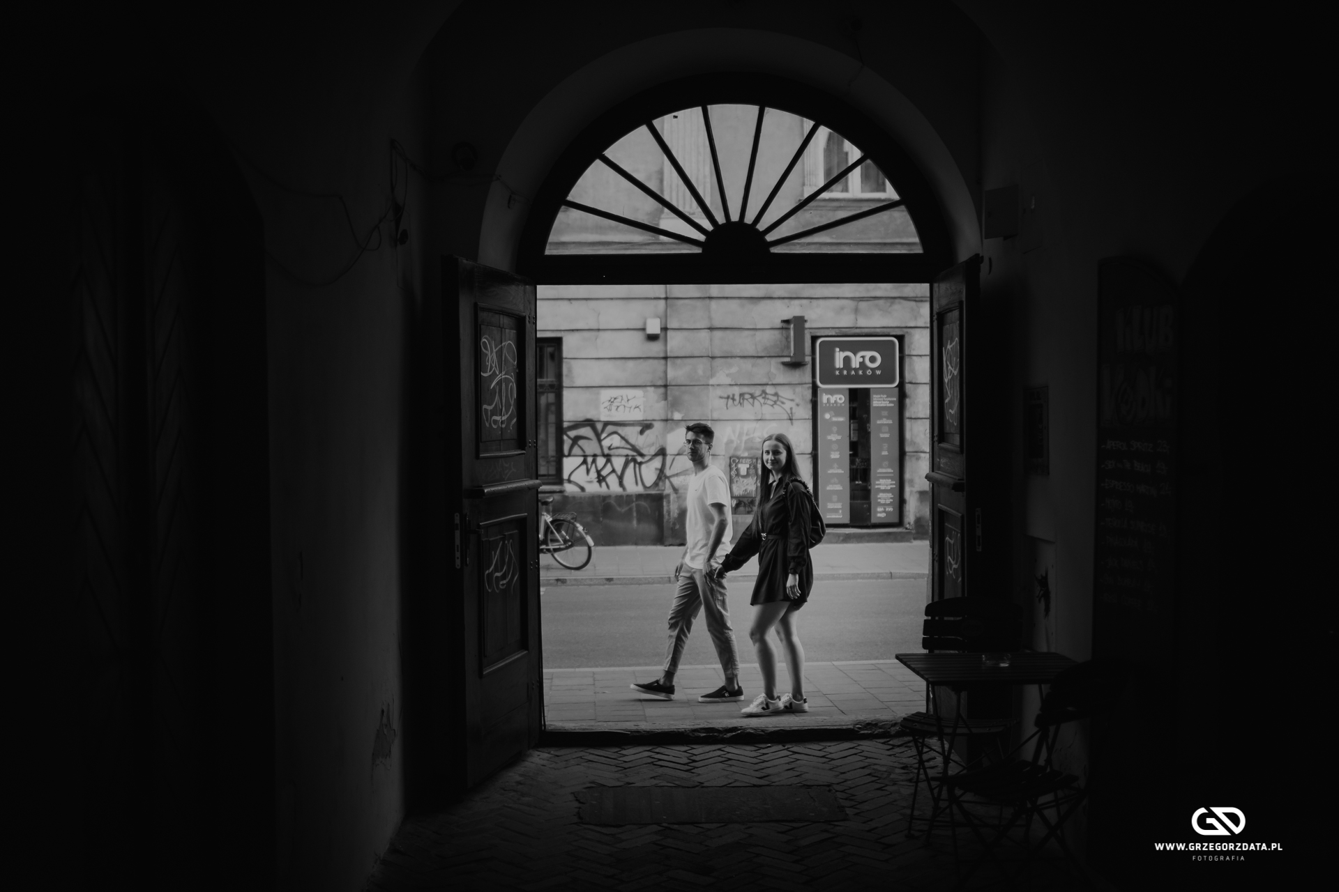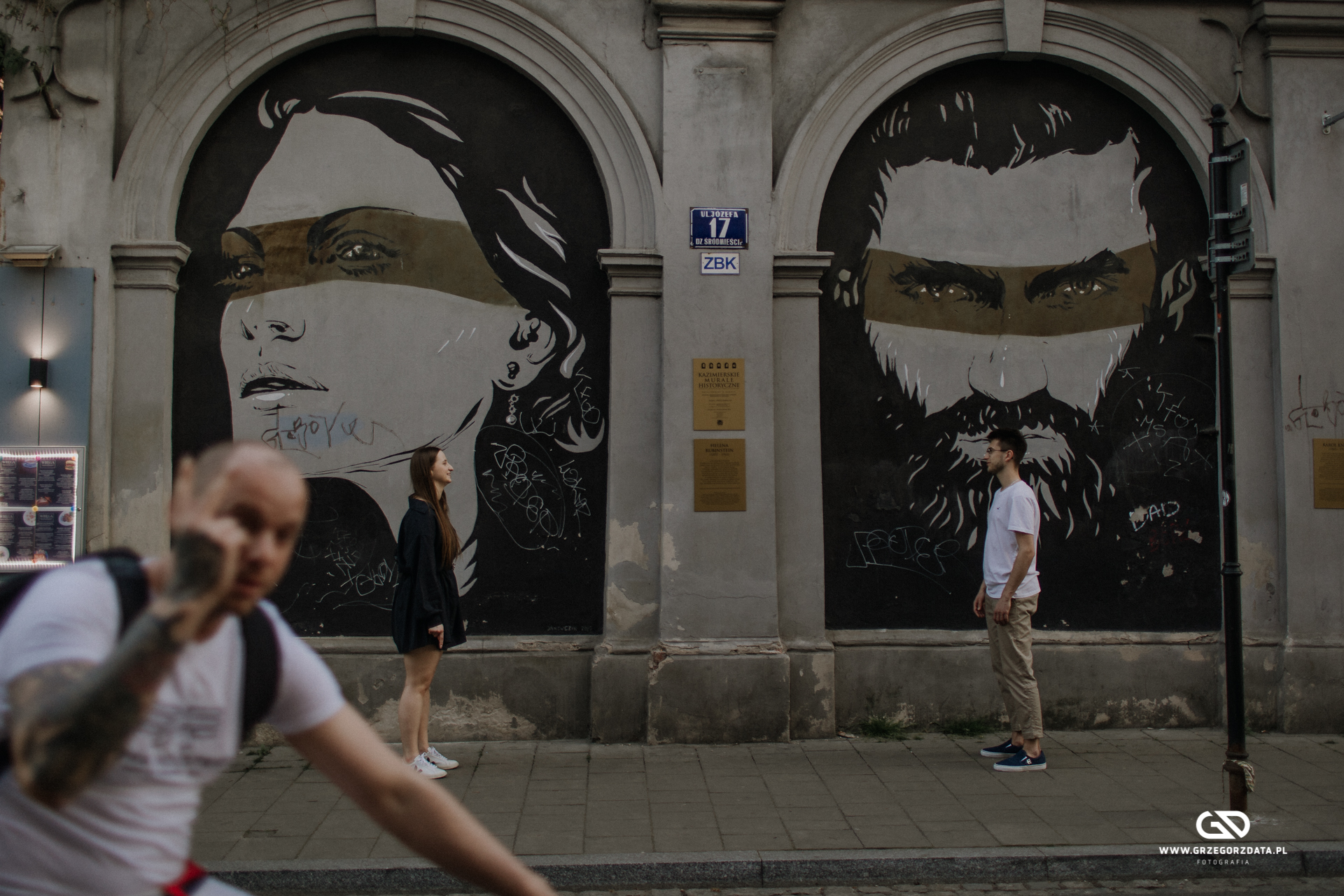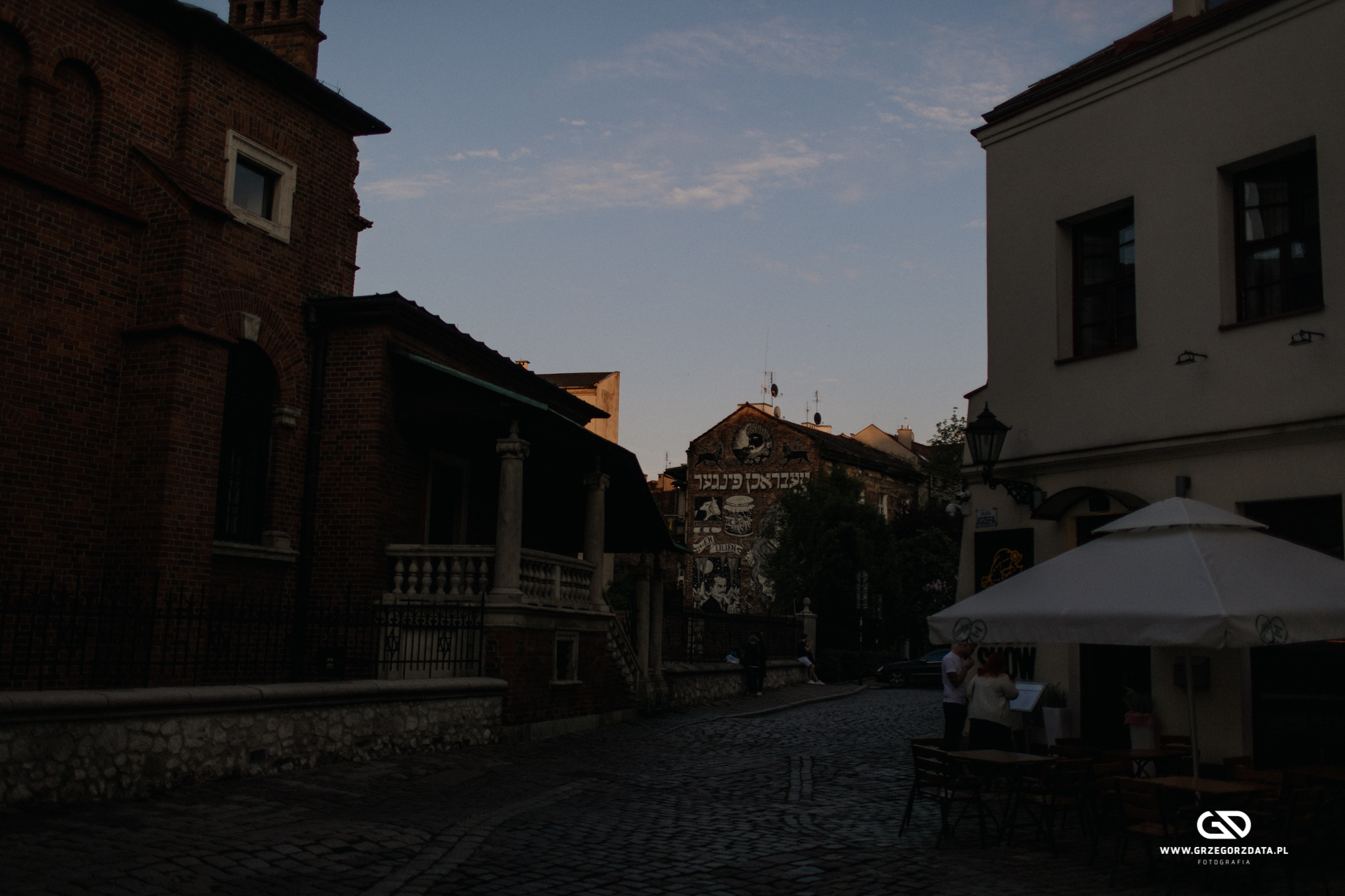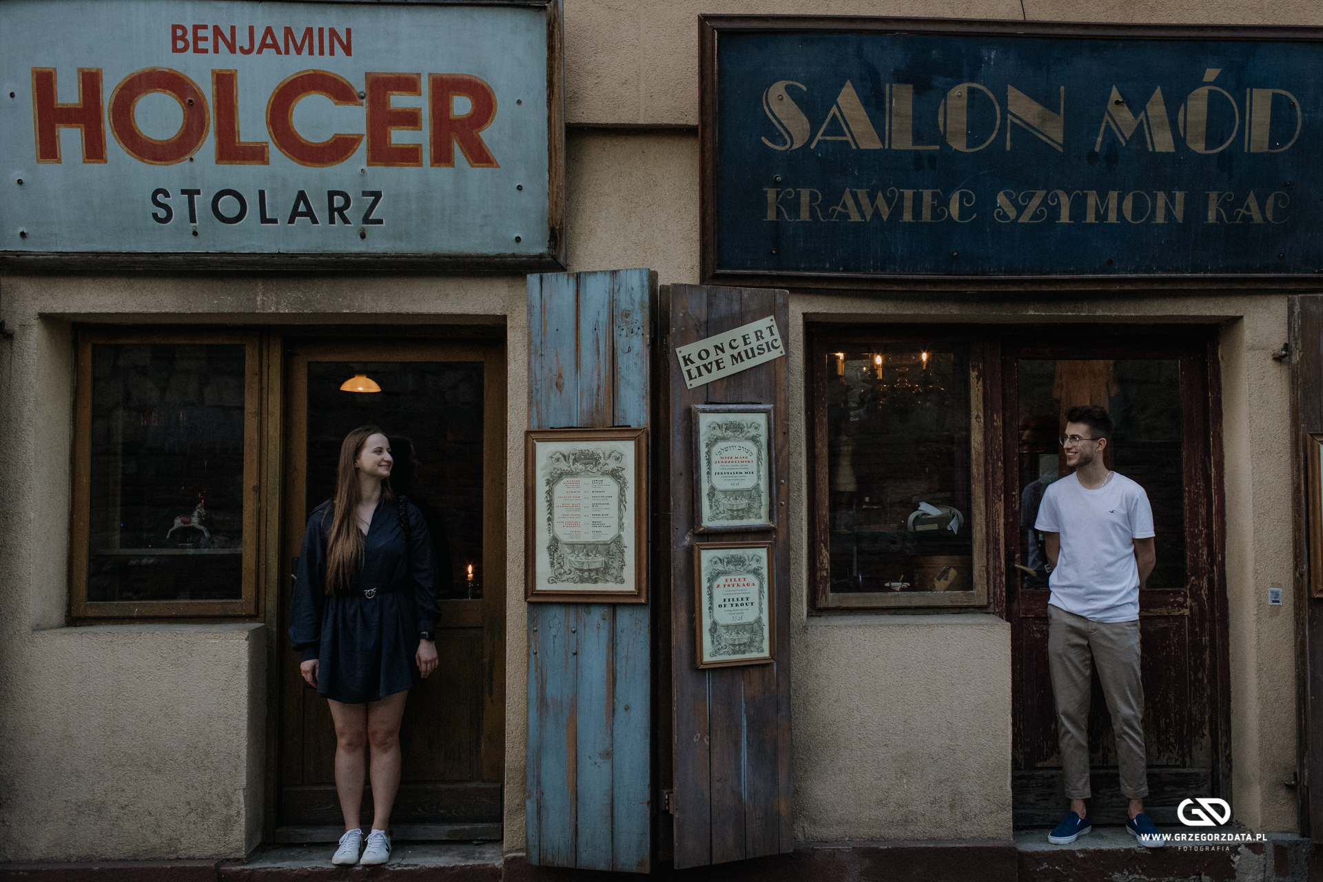 Kazimierz to jedna z dzielnic Krakowa, dawniej otoczona murem obronnym. To w tym miejscu w roku 1494 roku zostało stworzone getto, które odgradzało Żydów od reszty mieszkańców. Obecnie Kazimierz to miejsce, do którego chętnie przyjeżdżają turyści. Żydowskie synagogi, kulinarne przysmaki niespotykane nigdzie indziej, wyróżniająca się architektura, muzyka klezmerska - Żydzi zamieszkujący krakowski Kazimierz od połowy XIV wieku do początku XIX wieku, pozostawili po sobie idealne miejsca na nastrojową sesję zdjęciową. Klimatyczne uliczki pozwalają na chwile wytchnienia, a także zadumę i to wśród nich spacerowała Zuzanna z Mikołajem od czasu do czasu spoglądając w moją stronę.