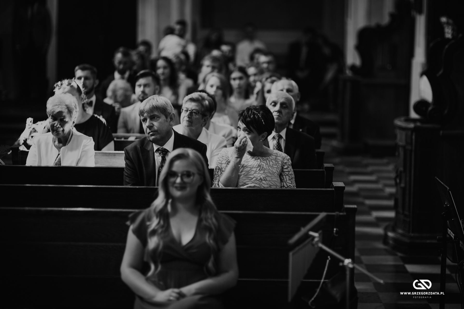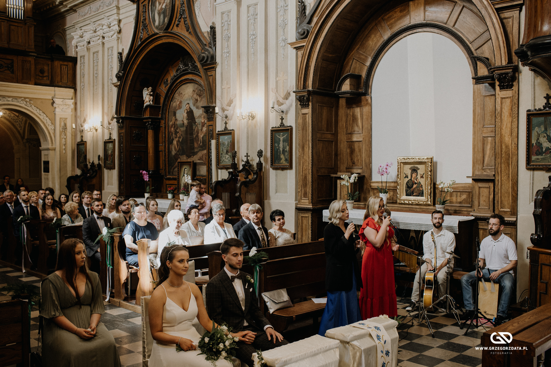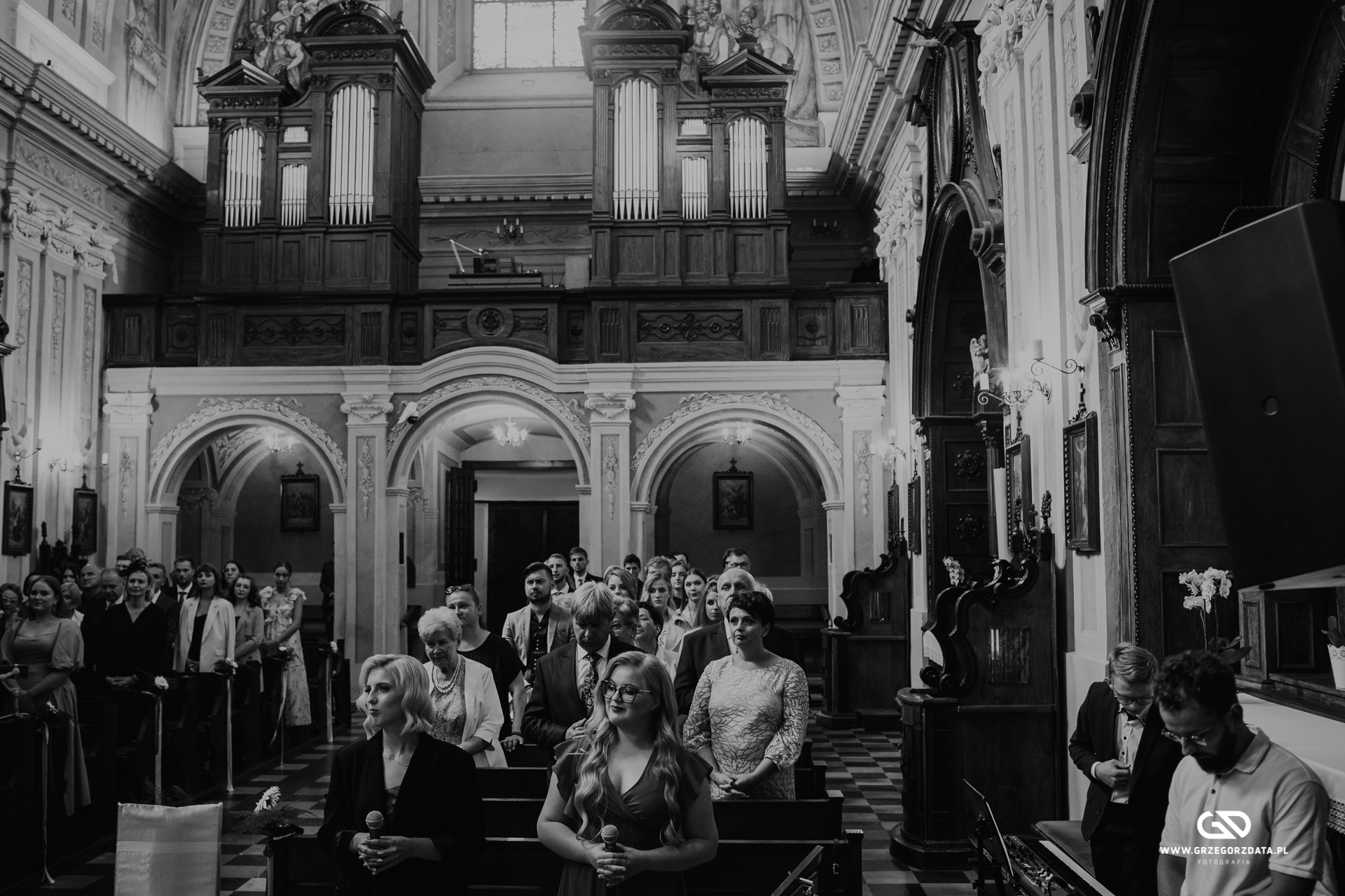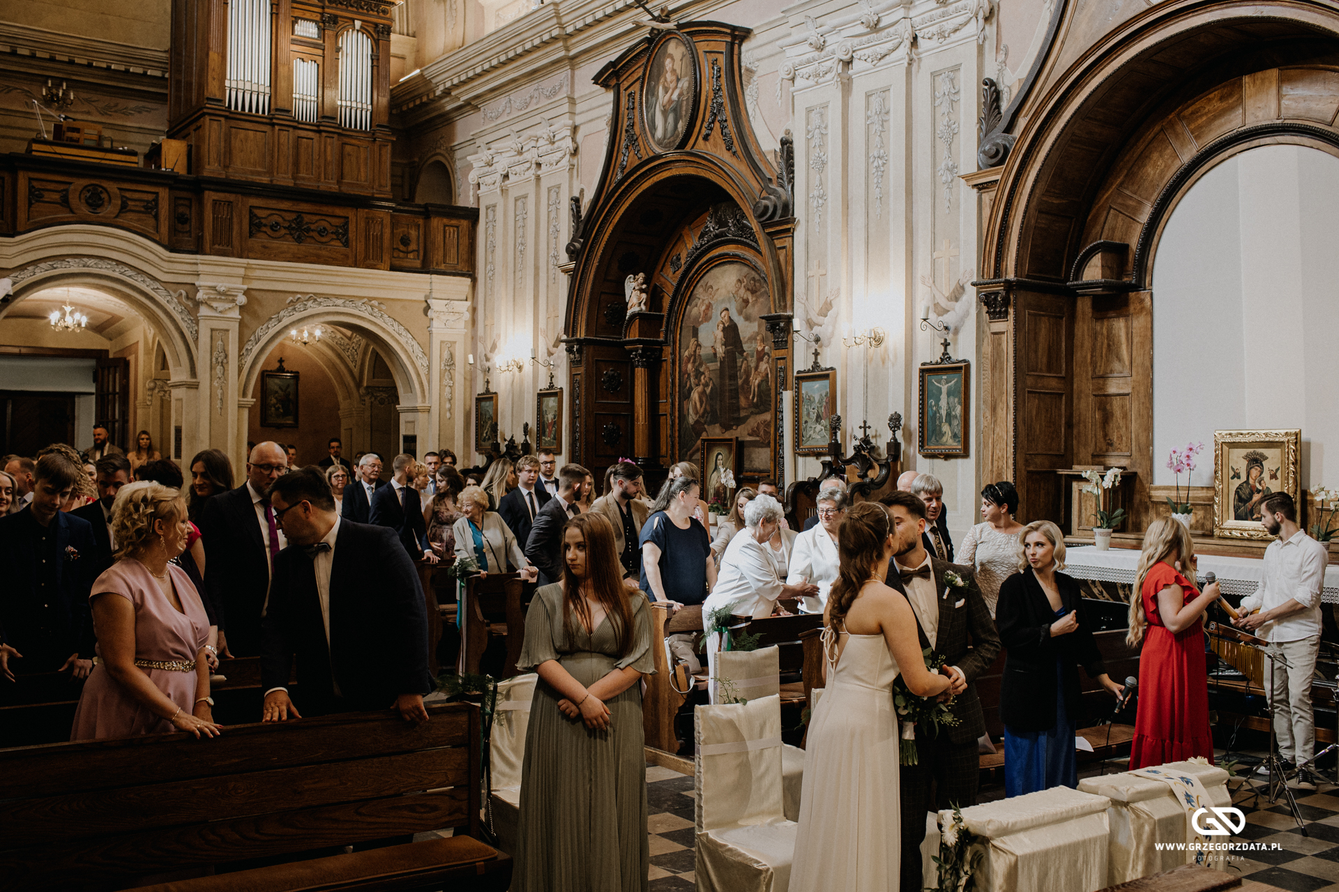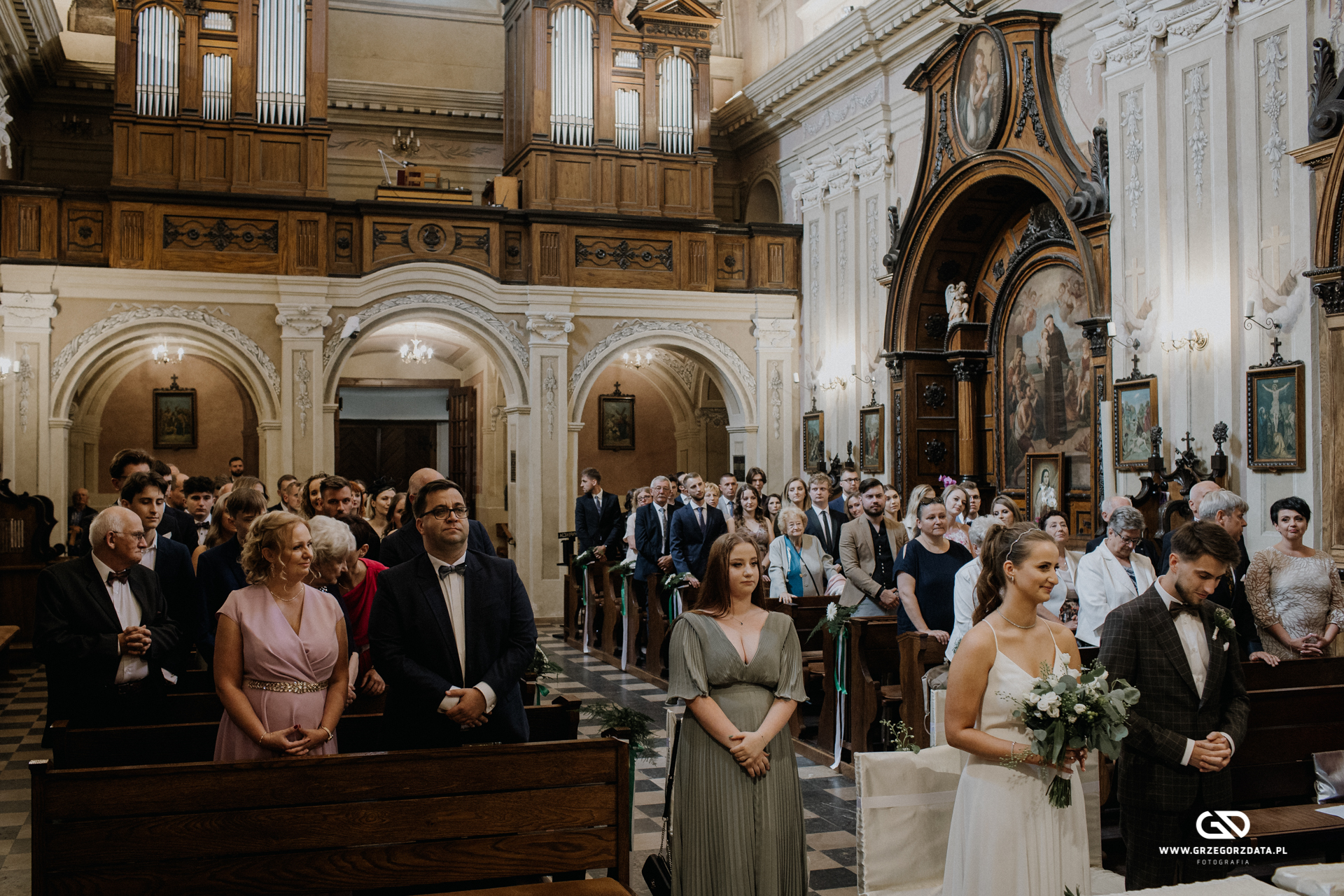 Chwilę później jechaliśmy już do kościoła. Prowadziła Zuzanna, a sama droga dostarczyła nam widoków pięknej panoramy Krosna. Na miejscu wszyscy w poruszeniu czekali na młodych. Dużo emocji, szczególnie u rodziców. Tutaj wszystko grało – światło, kameralność, a wreszcie i muzyka. Ta było wyjątkowa, bo w kościelnym zespole udzielały się siostry pana młodego. Miałem ciarki - fajnie kiedy po kilkunastu sezonach ślubnych nadal czujesz takie emocje na ślubie!