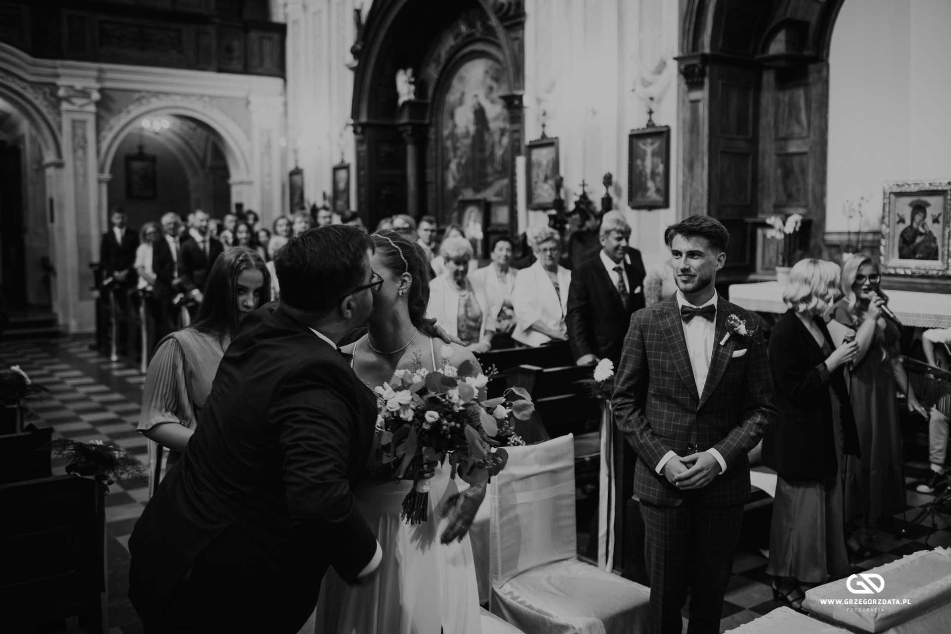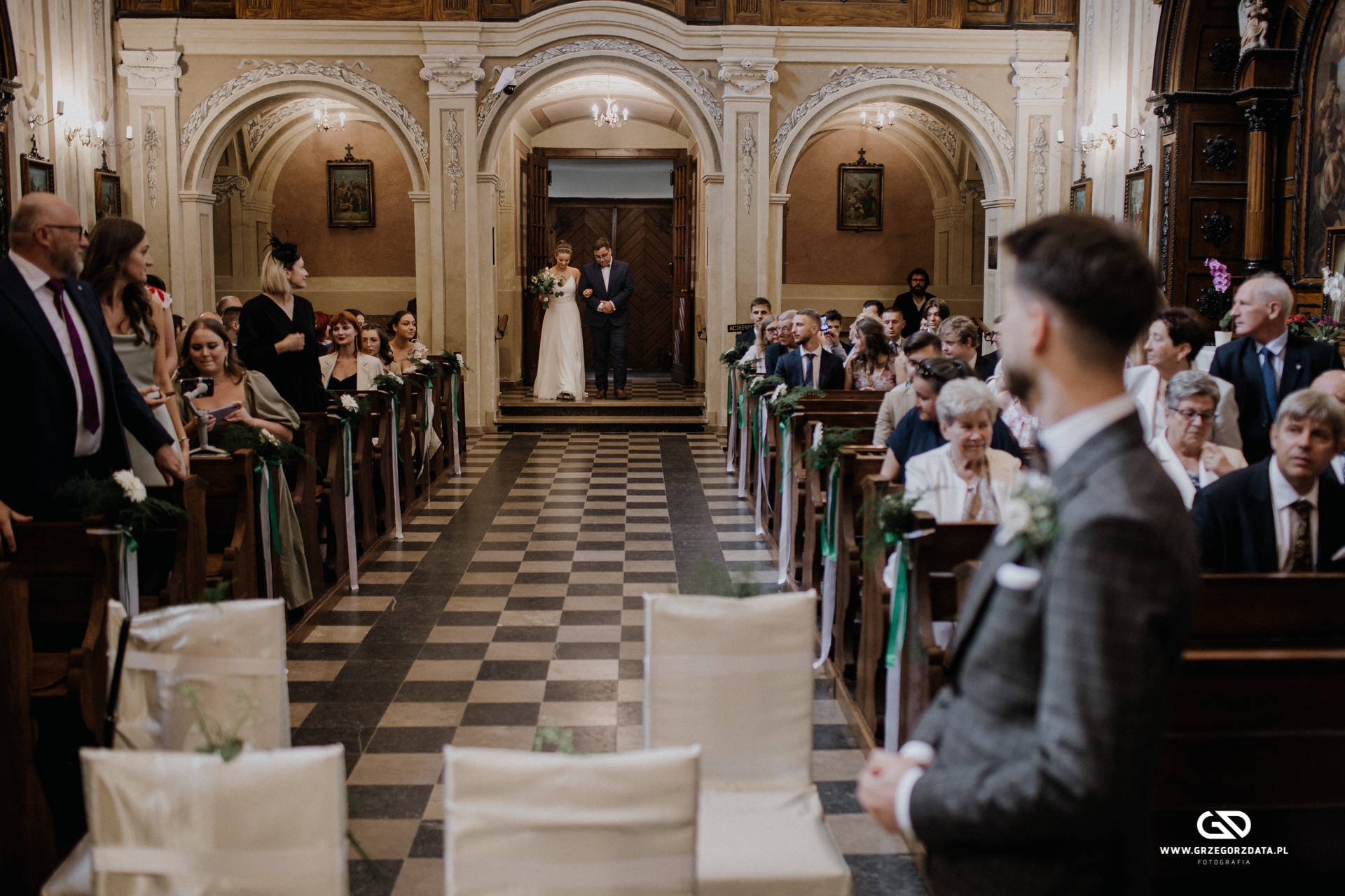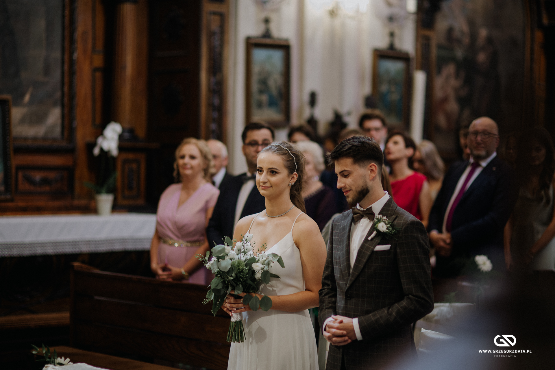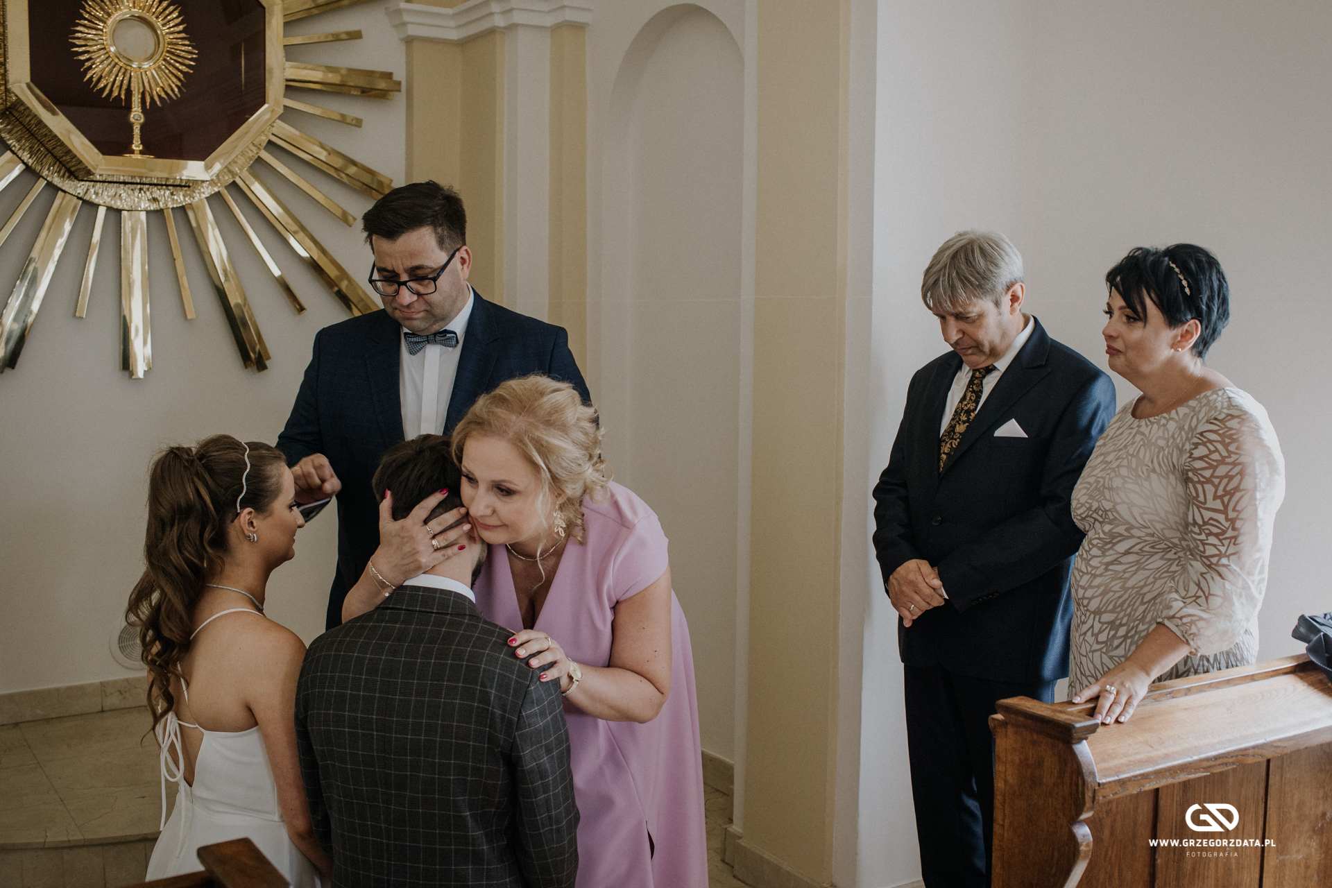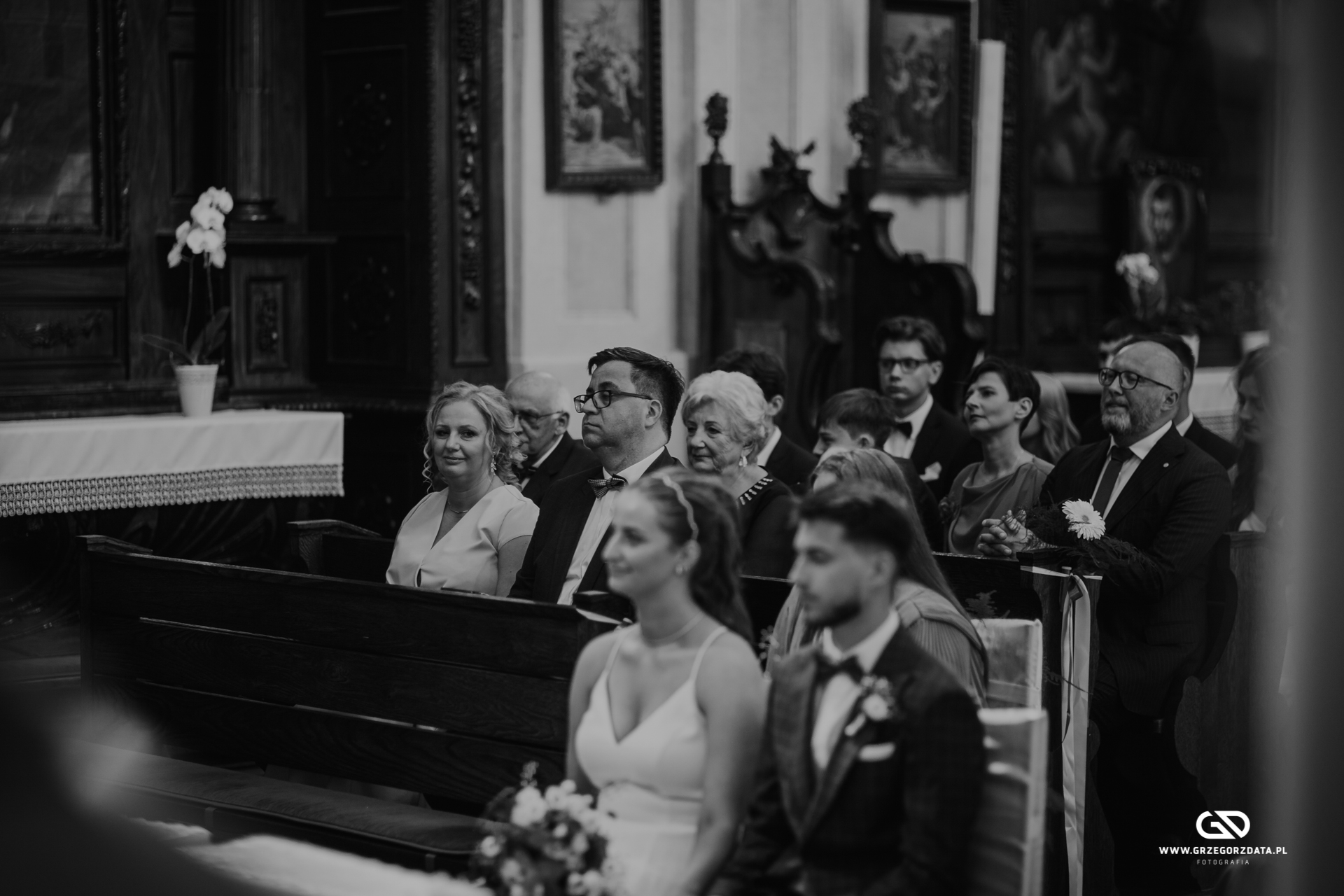 Chwilę później jechaliśmy już do kościoła. Prowadziła Zuzanna, a sama droga dostarczyła nam widoków pięknej panoramy Krosna. Na miejscu wszyscy w poruszeniu czekali na młodych. Dużo emocji, szczególnie u rodziców. Tutaj wszystko grało – światło, kameralność, a wreszcie i muzyka. Ta było wyjątkowa, bo w kościelnym zespole udzielały się siostry pana młodego. Miałem ciarki - fajnie kiedy po kilkunastu sezonach ślubnych nadal czujesz takie emocje na ślubie!