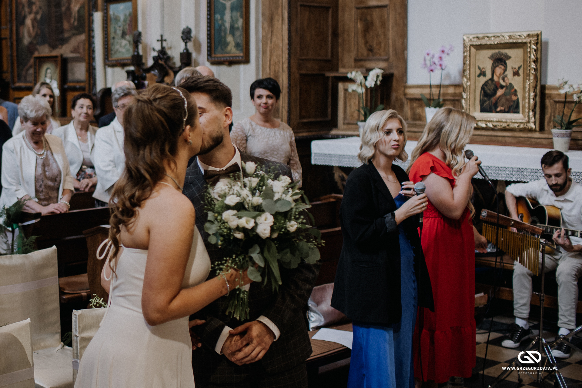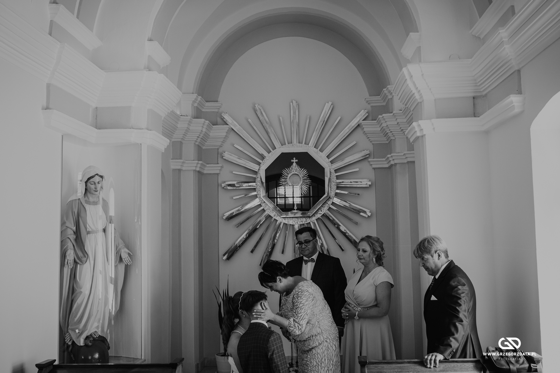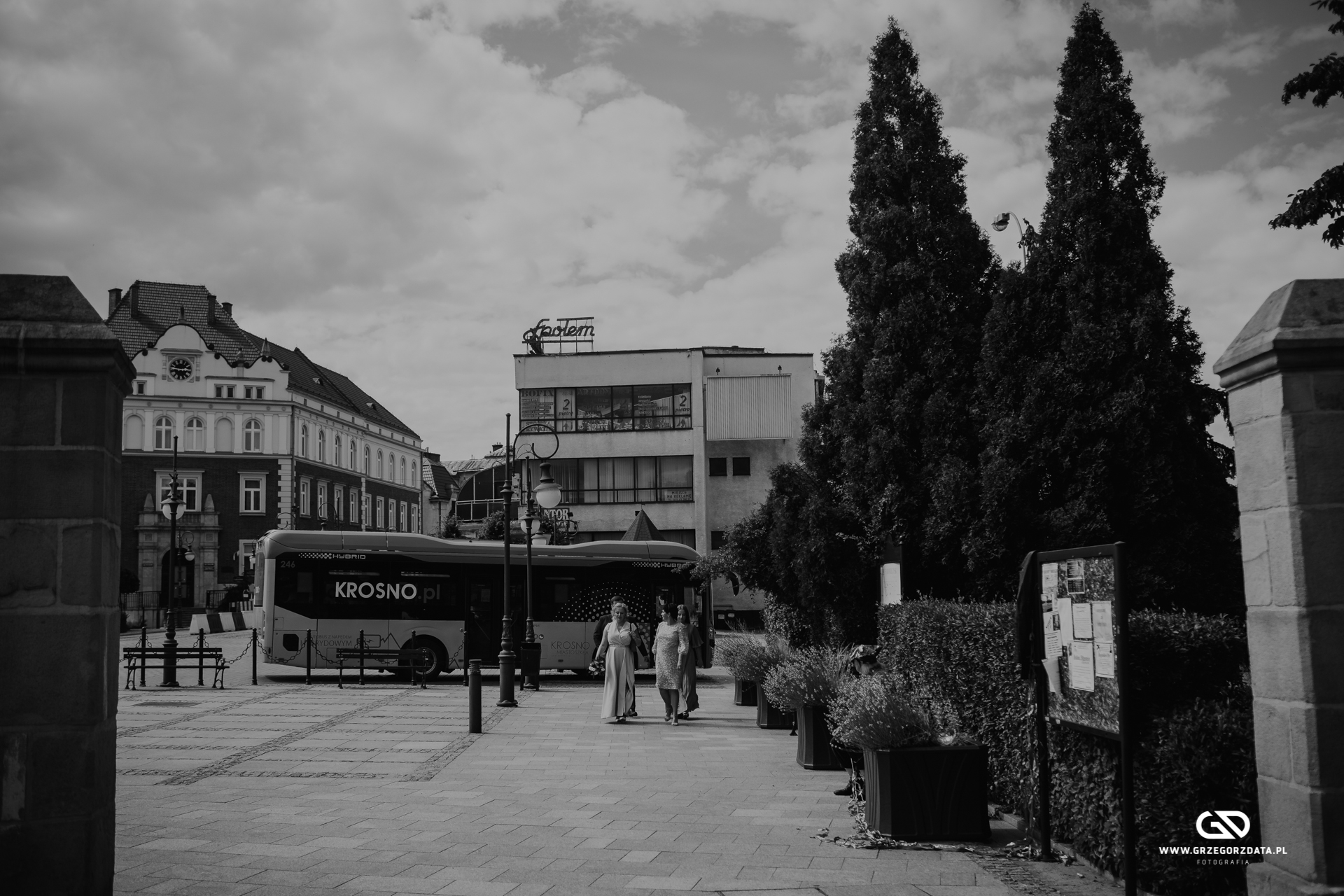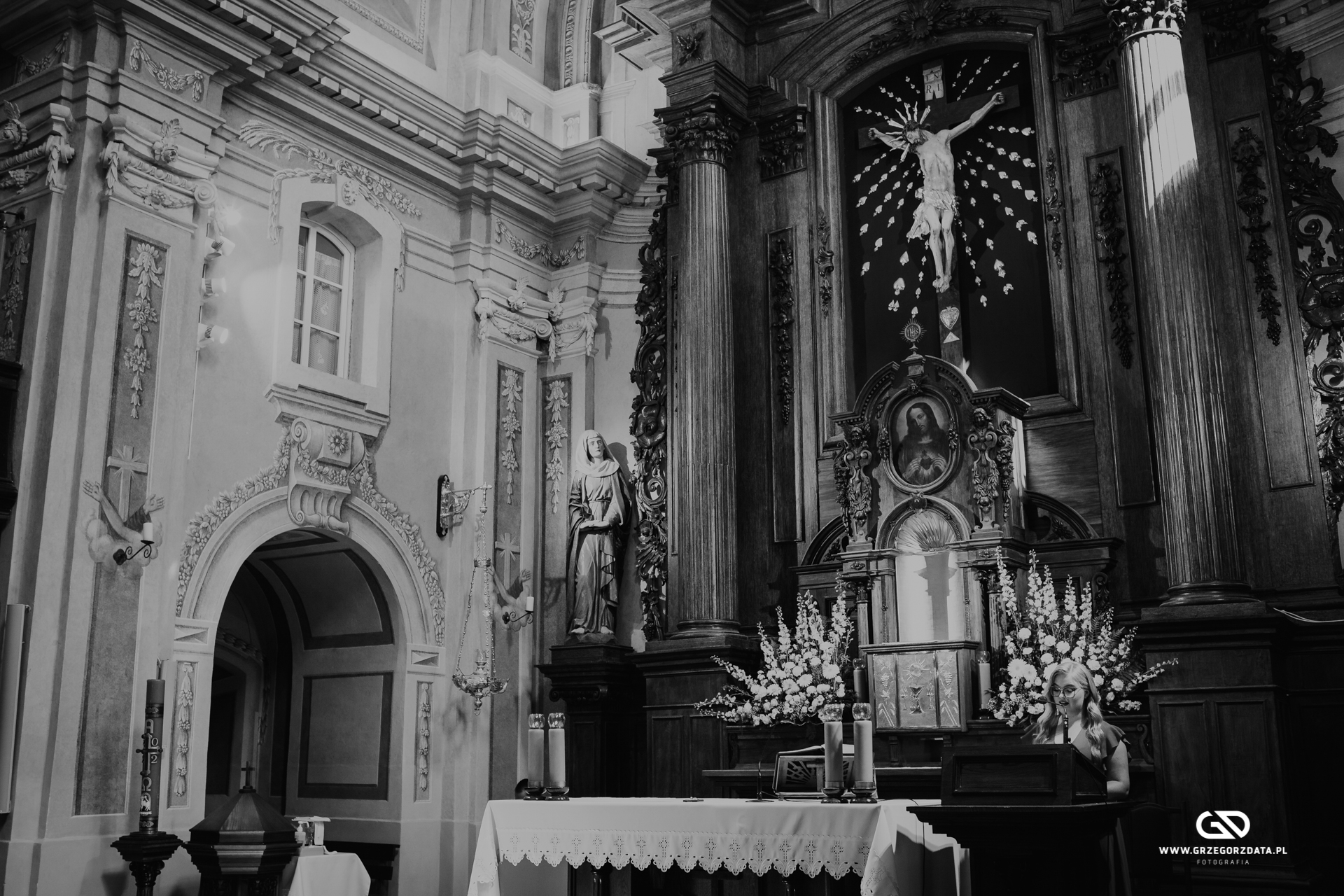 Chwilę później jechaliśmy już do kościoła. Prowadziła Zuzanna, a sama droga dostarczyła nam widoków pięknej panoramy Krosna. Na miejscu wszyscy w poruszeniu czekali na młodych. Dużo emocji, szczególnie u rodziców. Tutaj wszystko grało – światło, kameralność, a wreszcie i muzyka. Ta było wyjątkowa, bo w kościelnym zespole udzielały się siostry pana młodego. Miałem ciarki - fajnie kiedy po kilkunastu sezonach ślubnych nadal czujesz takie emocje na ślubie!