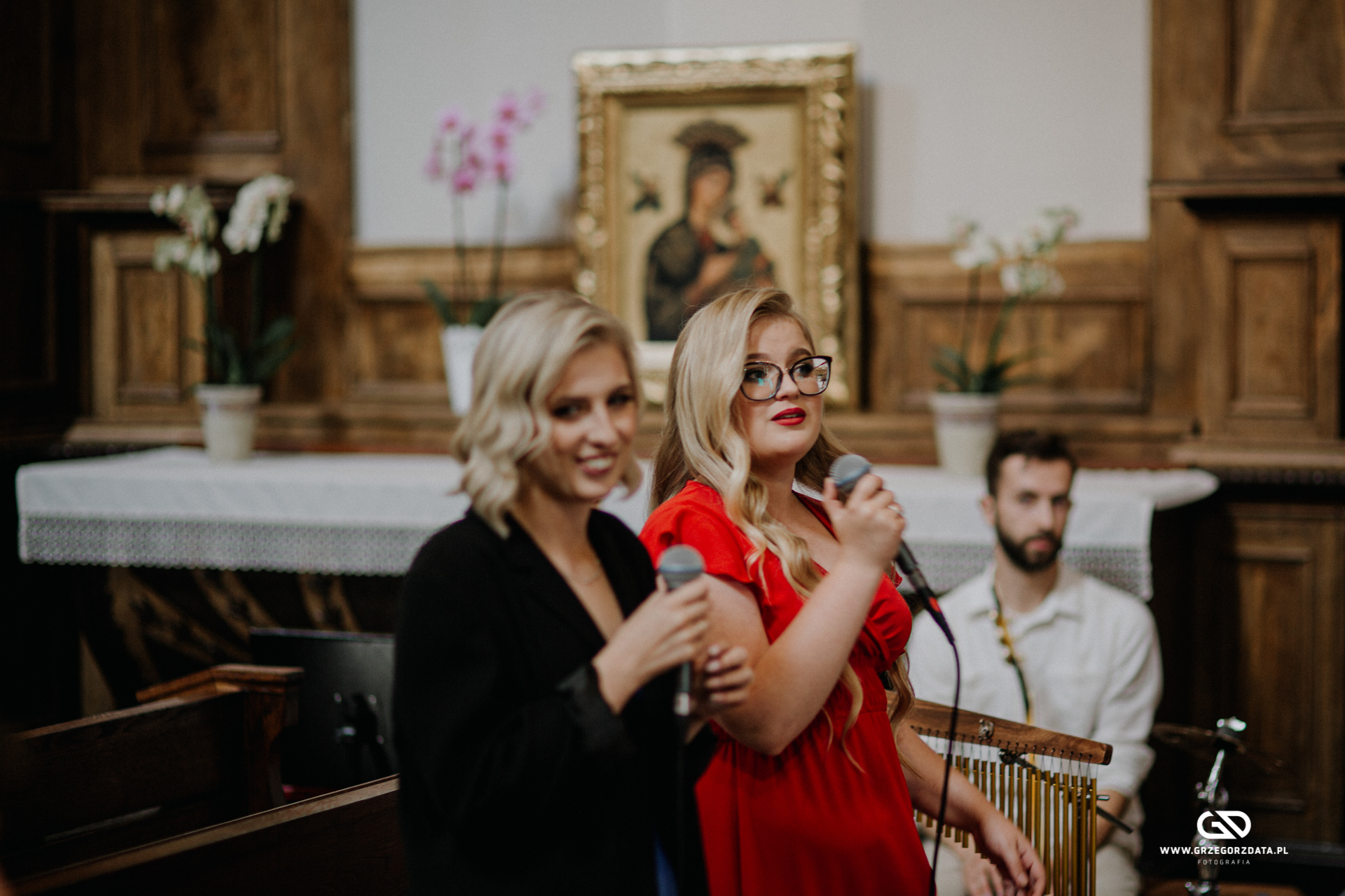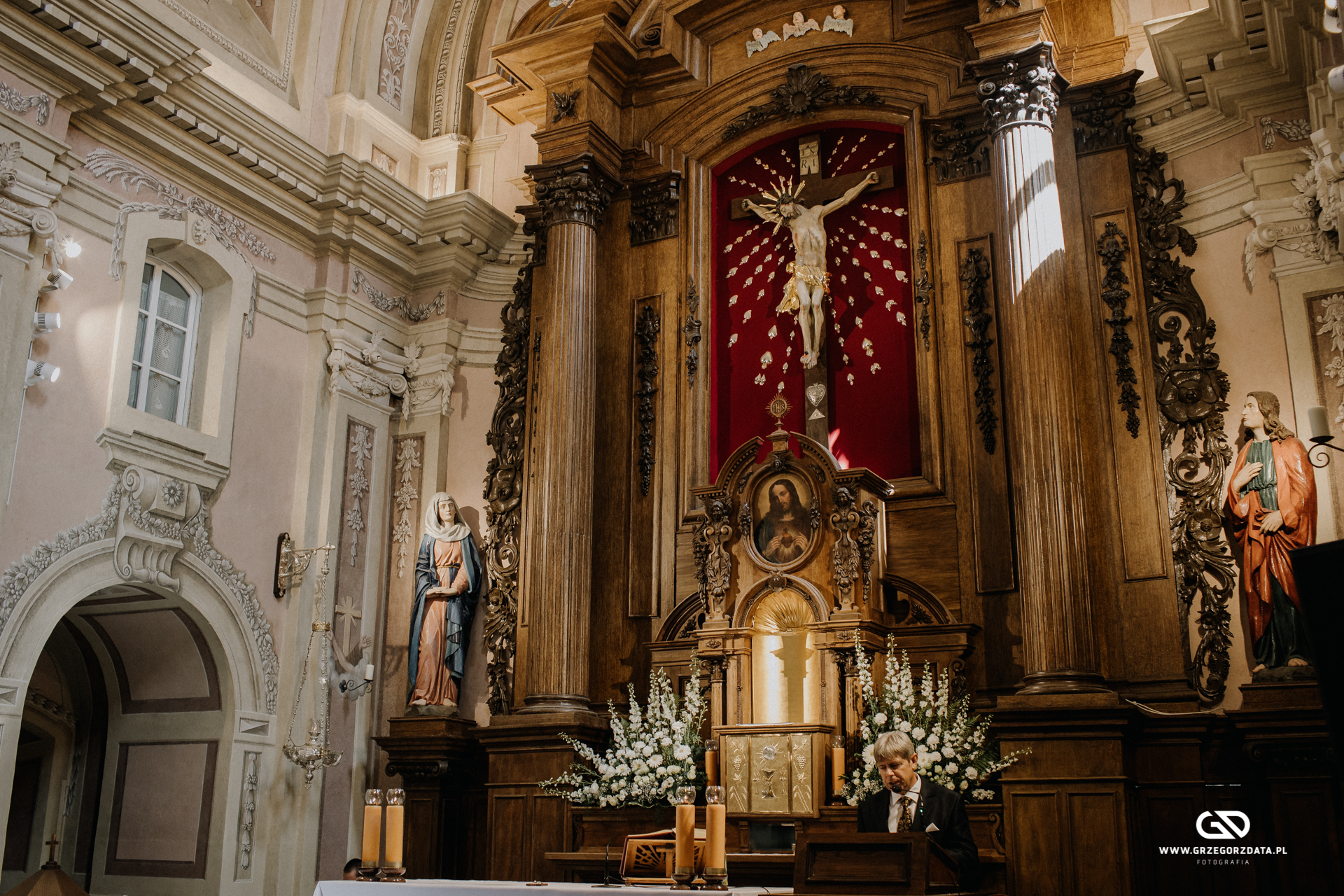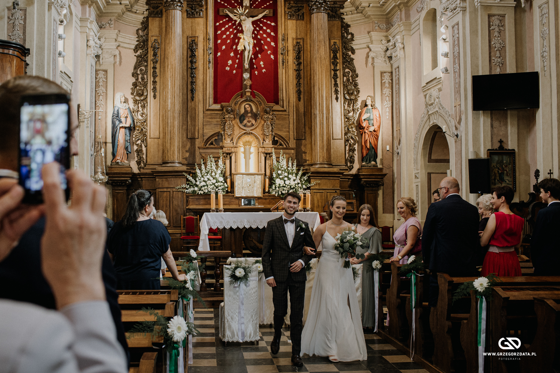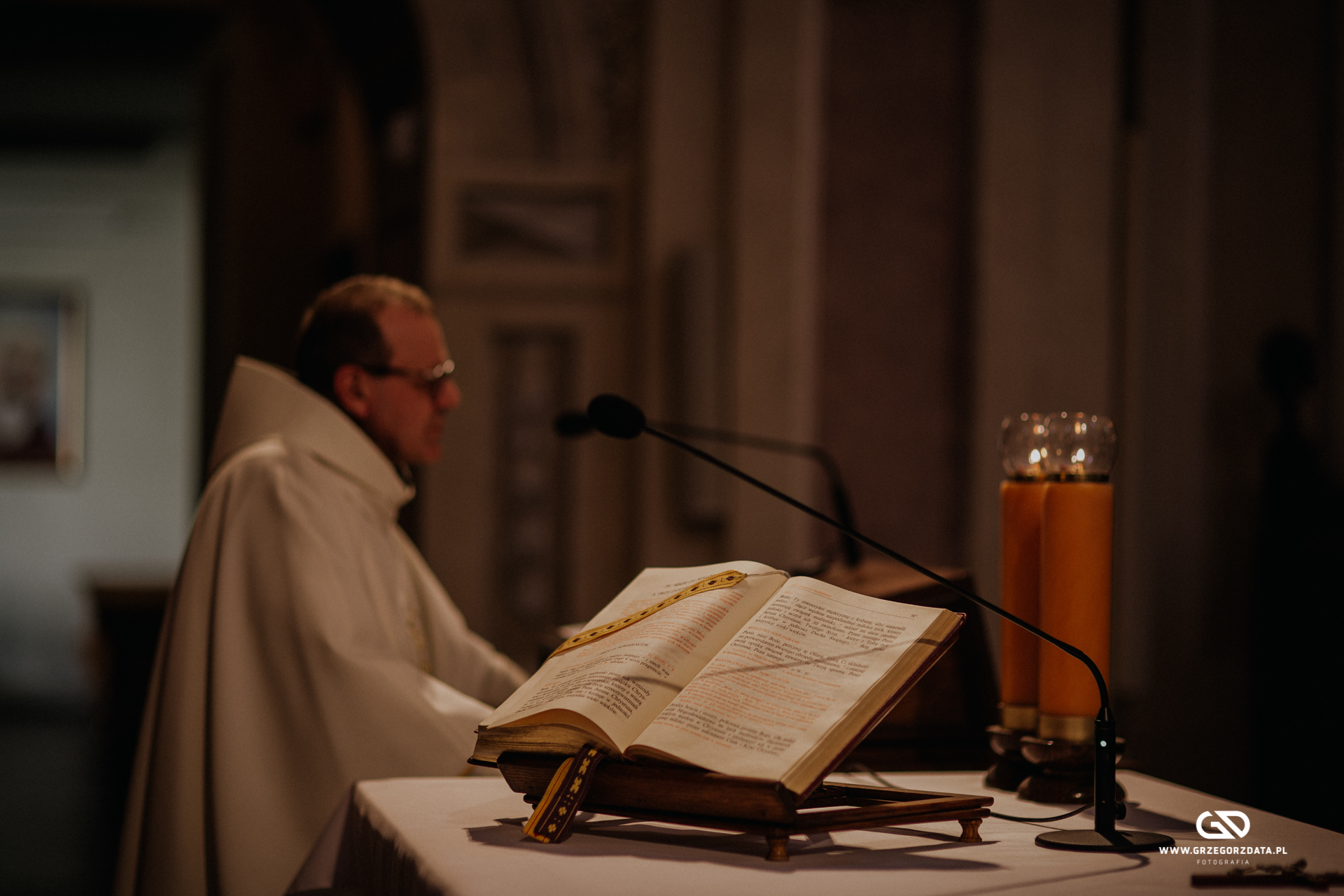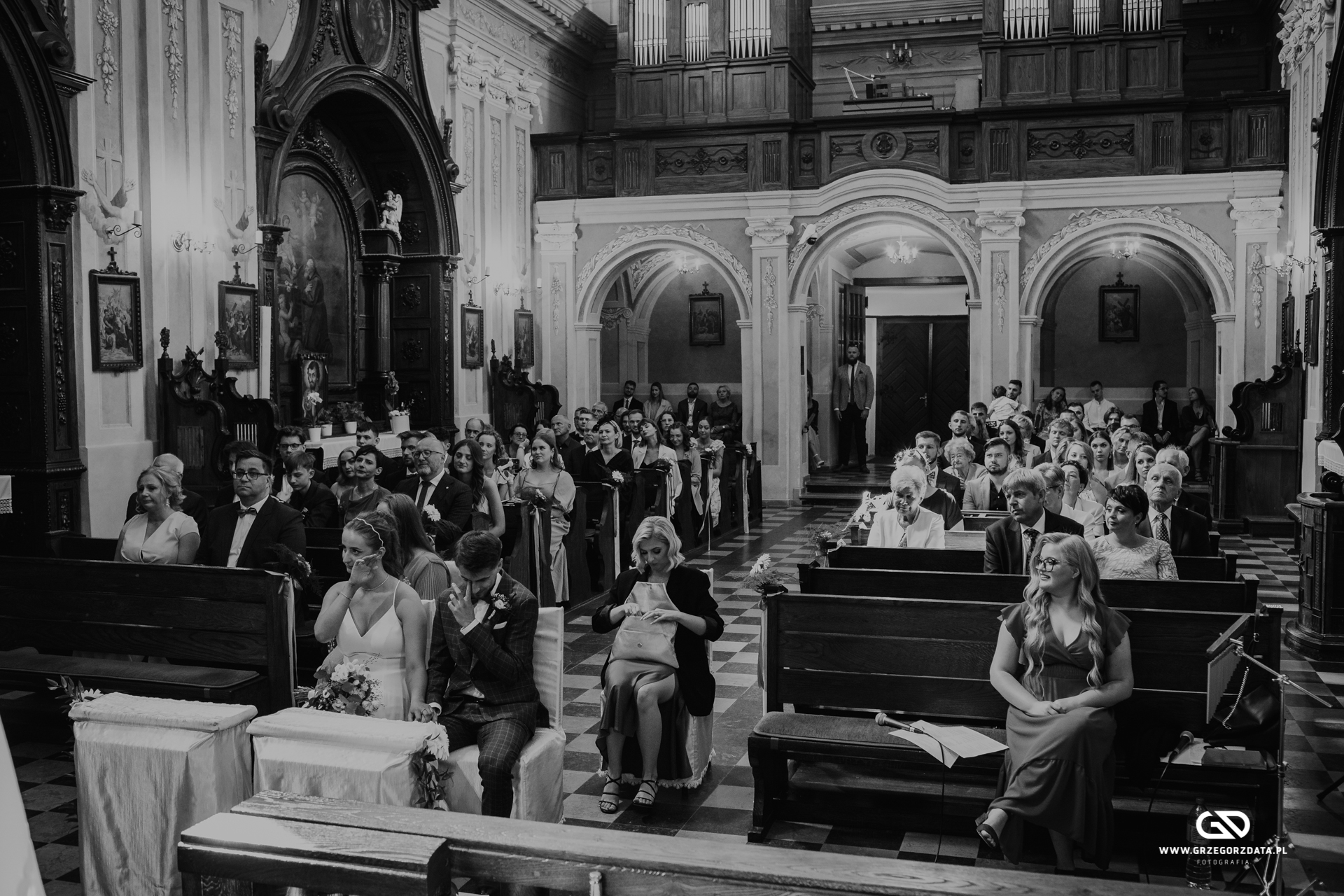 Chwilę później jechaliśmy już do kościoła. Prowadziła Zuzanna, a sama droga dostarczyła nam widoków pięknej panoramy Krosna. Na miejscu wszyscy w poruszeniu czekali na młodych. Dużo emocji, szczególnie u rodziców. Tutaj wszystko grało – światło, kameralność, a wreszcie i muzyka. Ta było wyjątkowa, bo w kościelnym zespole udzielały się siostry pana młodego. Miałem ciarki - fajnie kiedy po kilkunastu sezonach ślubnych nadal czujesz takie emocje na ślubie!