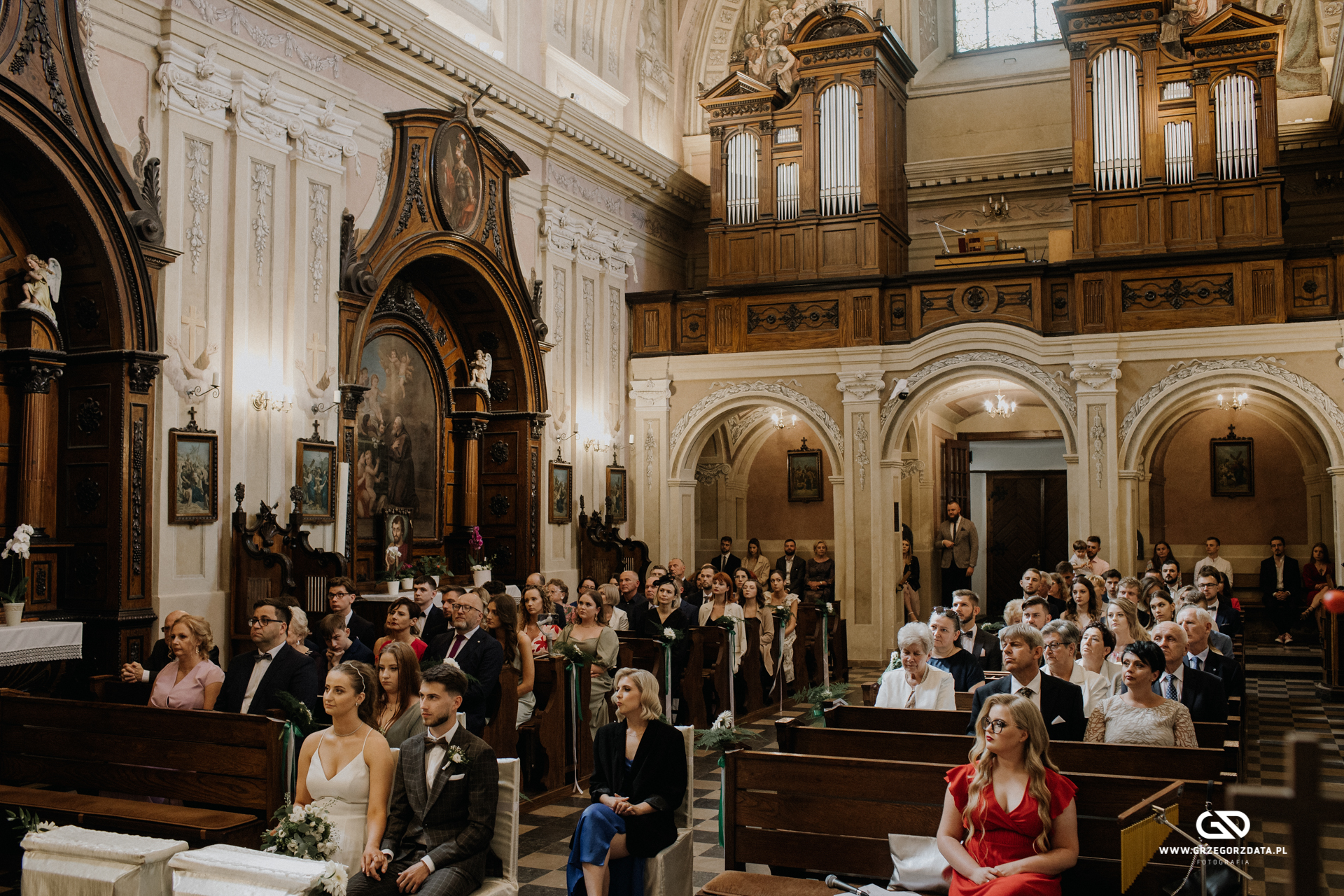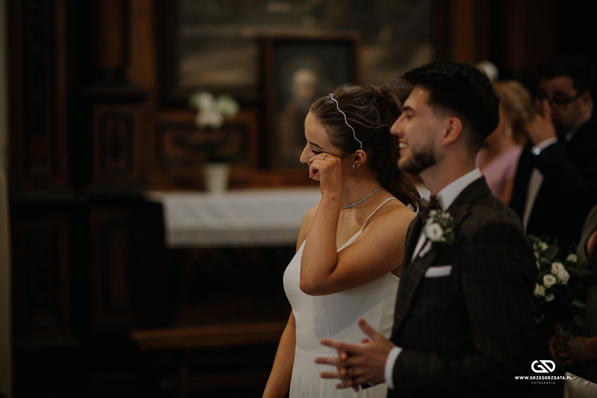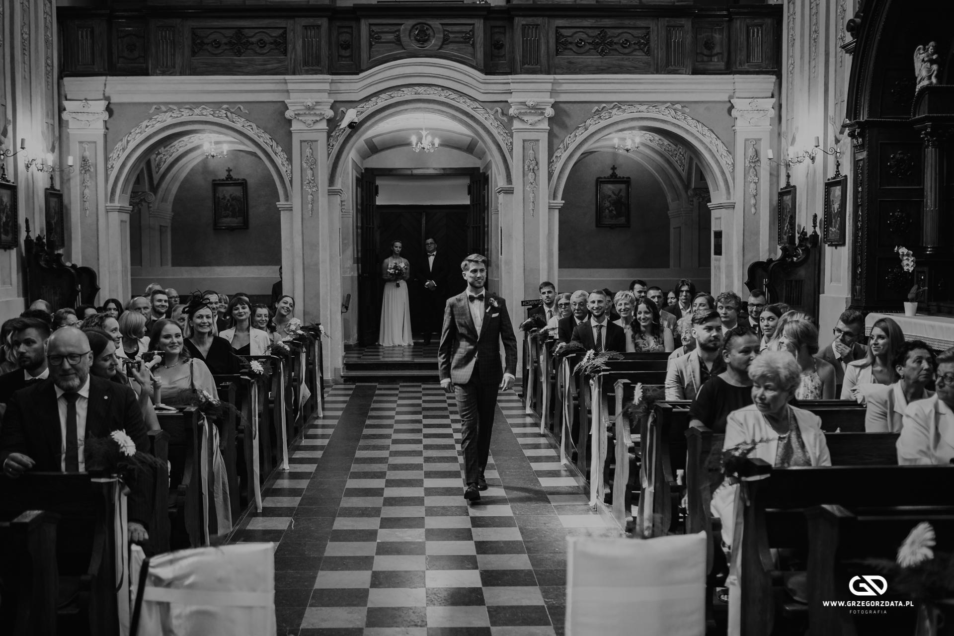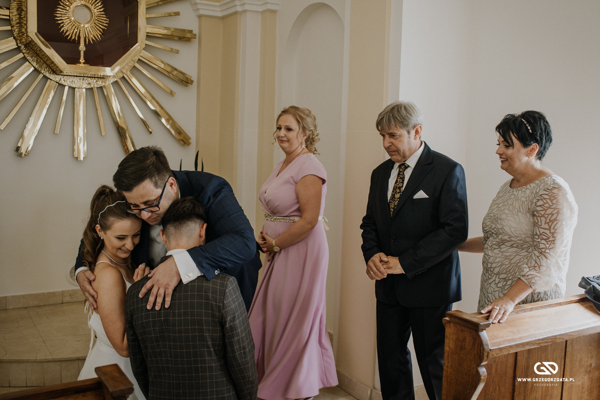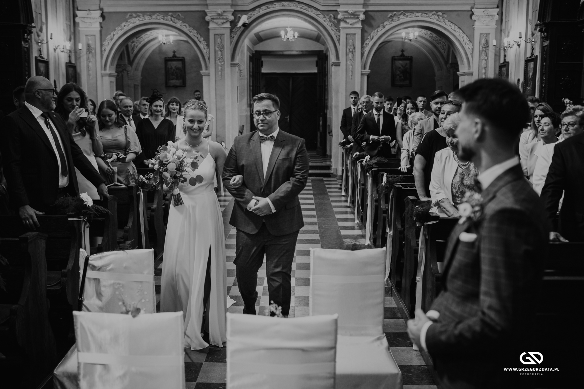 Chwilę później jechaliśmy już do kościoła. Prowadziła Zuzanna, a sama droga dostarczyła nam widoków pięknej panoramy Krosna. Na miejscu wszyscy w poruszeniu czekali na młodych. Dużo emocji, szczególnie u rodziców. Tutaj wszystko grało – światło, kameralność, a wreszcie i muzyka. Ta było wyjątkowa, bo w kościelnym zespole udzielały się siostry pana młodego. Miałem ciarki - fajnie kiedy po kilkunastu sezonach ślubnych nadal czujesz takie emocje na ślubie!