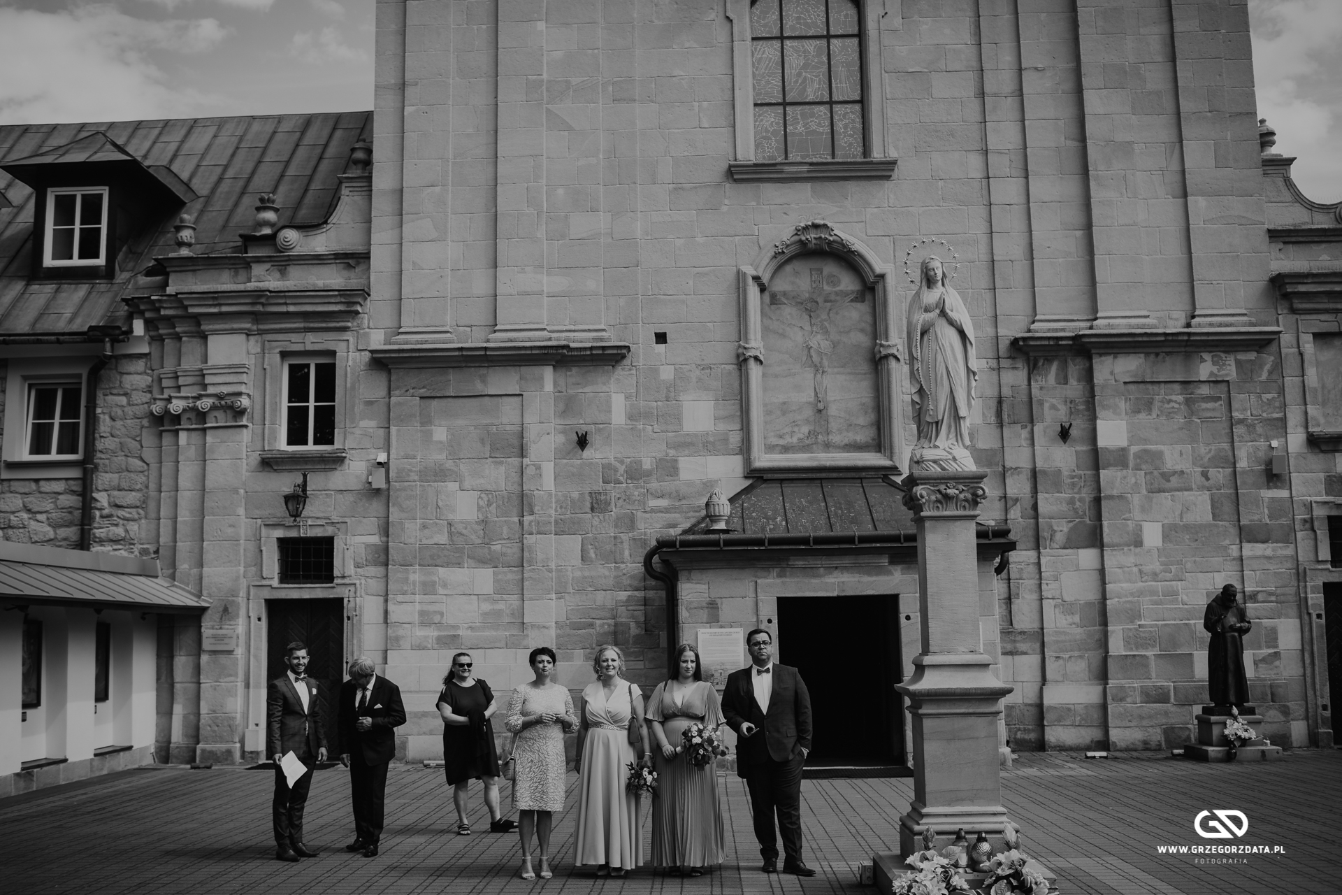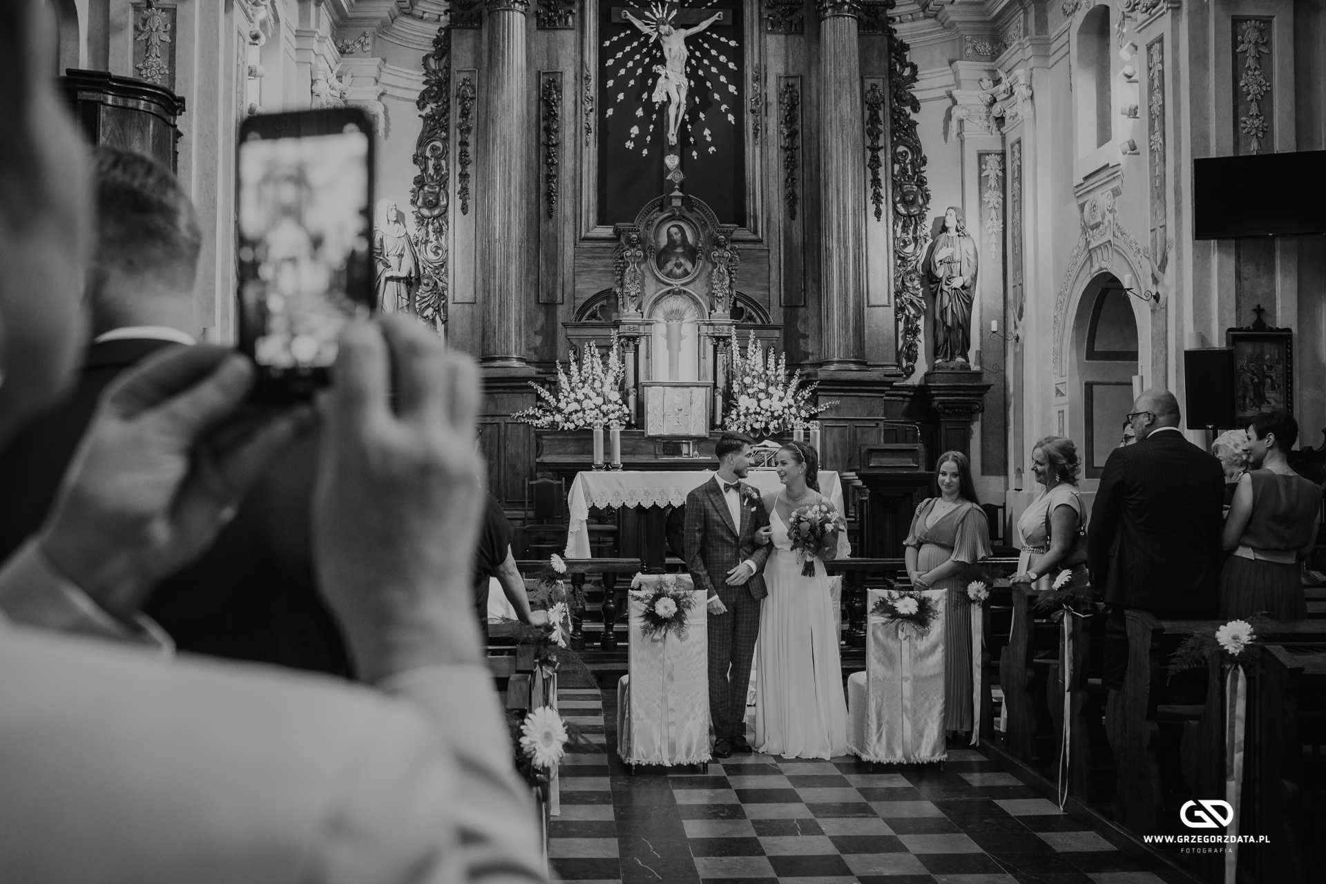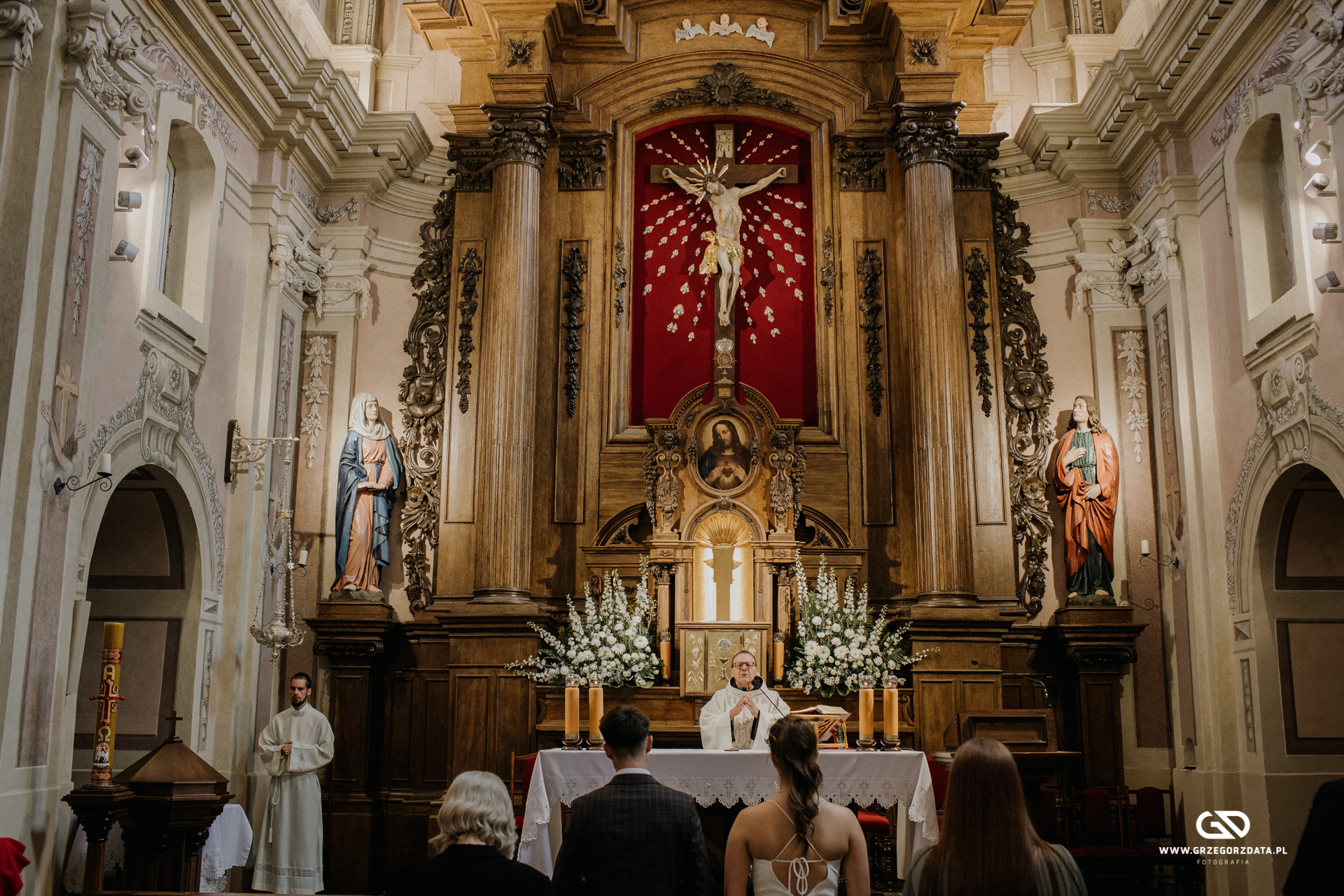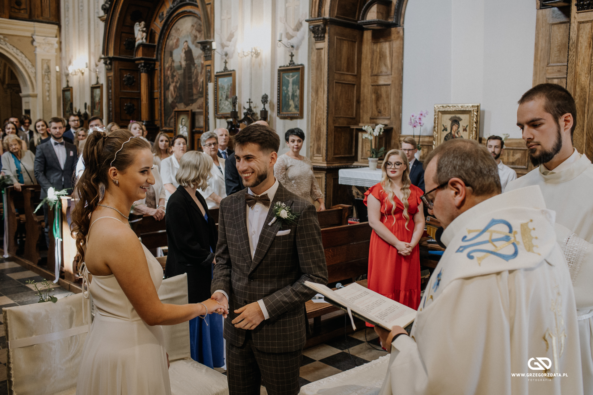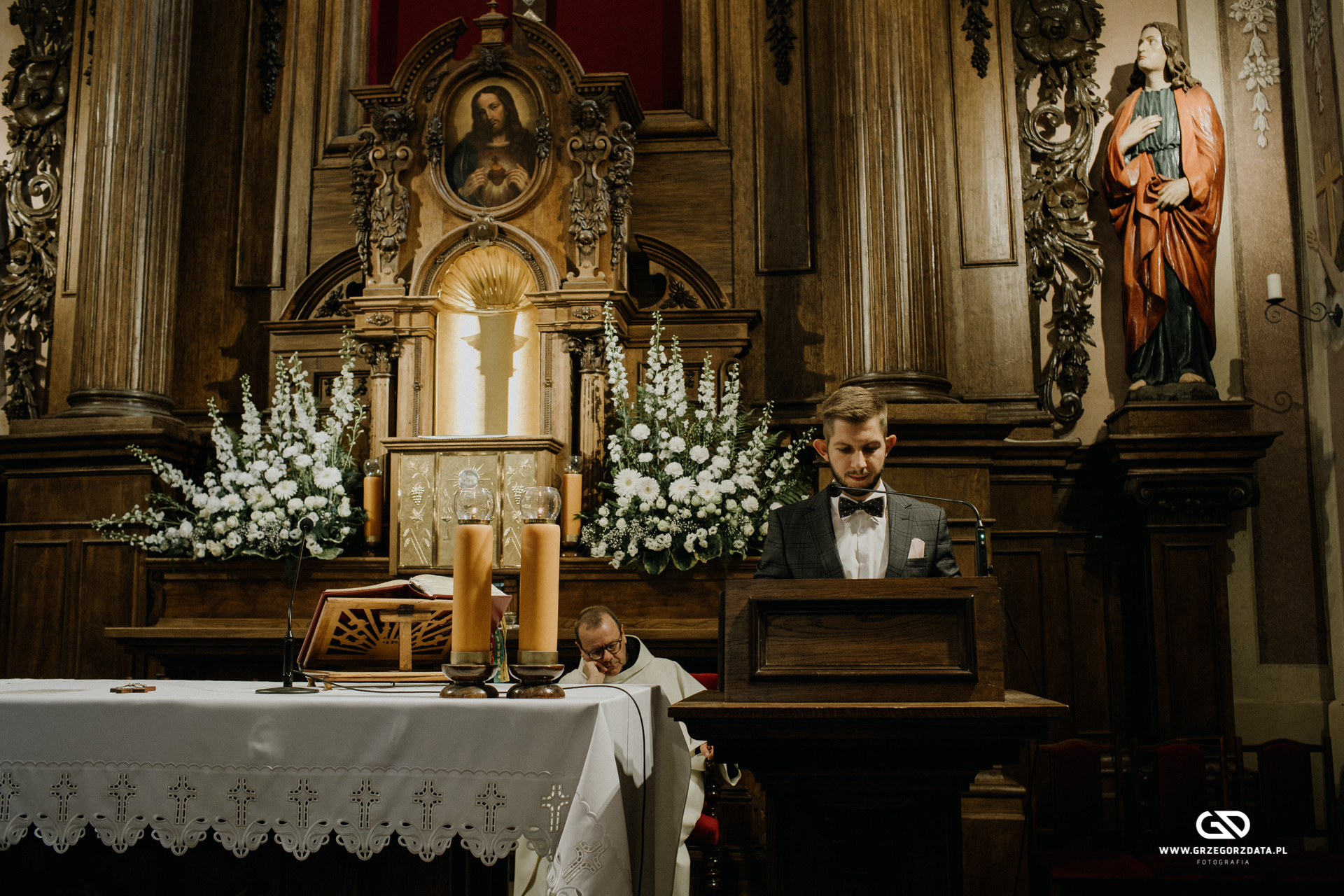 Chwilę później jechaliśmy już do kościoła. Prowadziła Zuzanna, a sama droga dostarczyła nam widoków pięknej panoramy Krosna. Na miejscu wszyscy w poruszeniu czekali na młodych. Dużo emocji, szczególnie u rodziców. Tutaj wszystko grało – światło, kameralność, a wreszcie i muzyka. Ta było wyjątkowa, bo w kościelnym zespole udzielały się siostry pana młodego. Miałem ciarki - fajnie kiedy po kilkunastu sezonach ślubnych nadal czujesz takie emocje na ślubie!