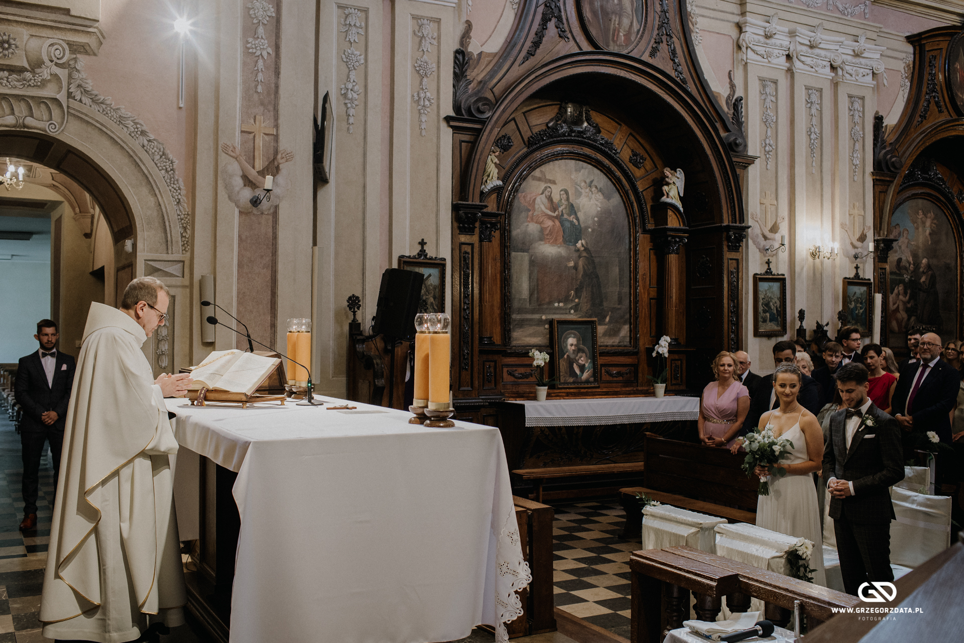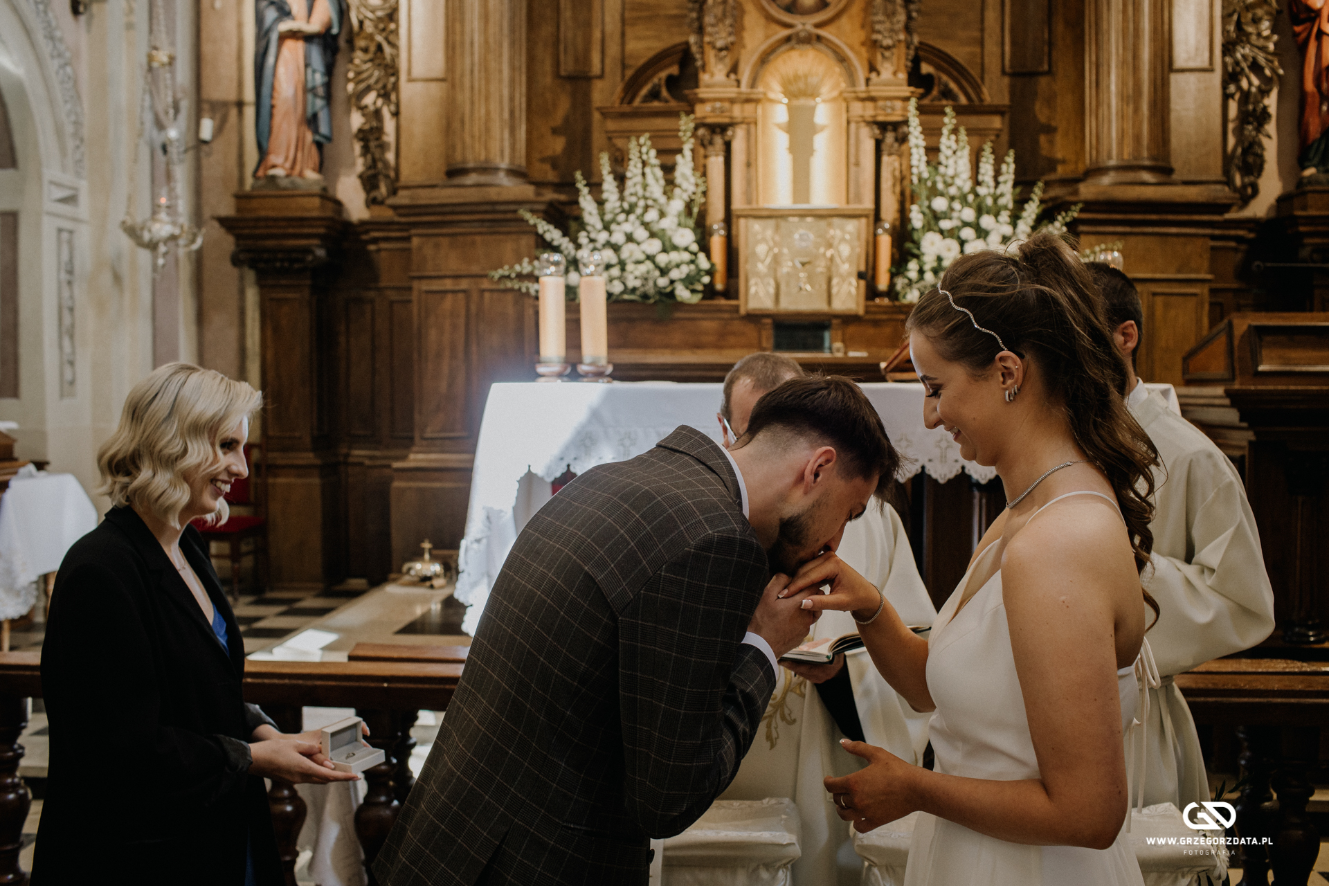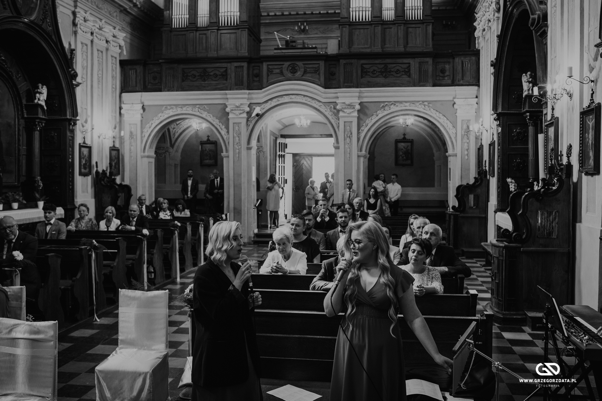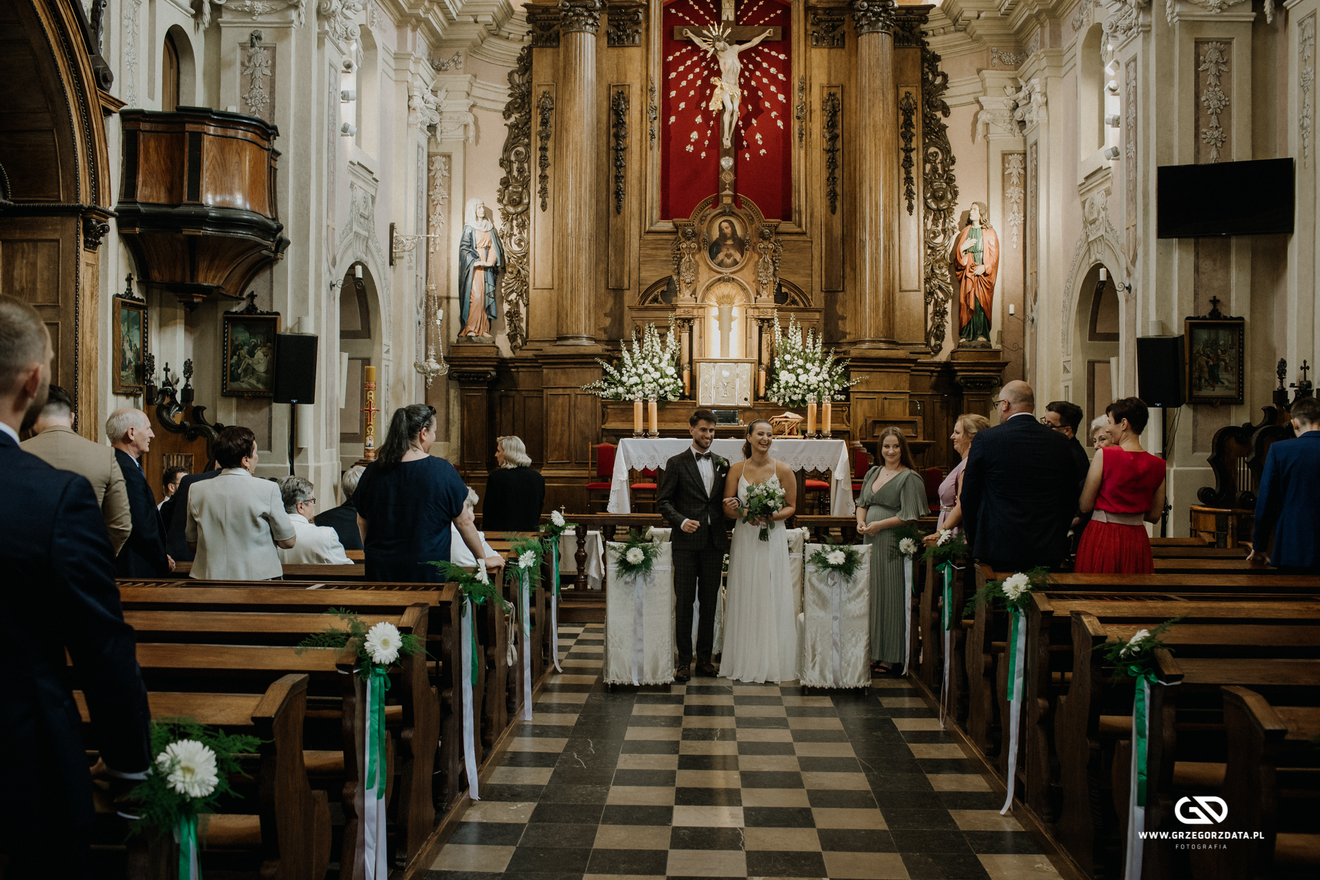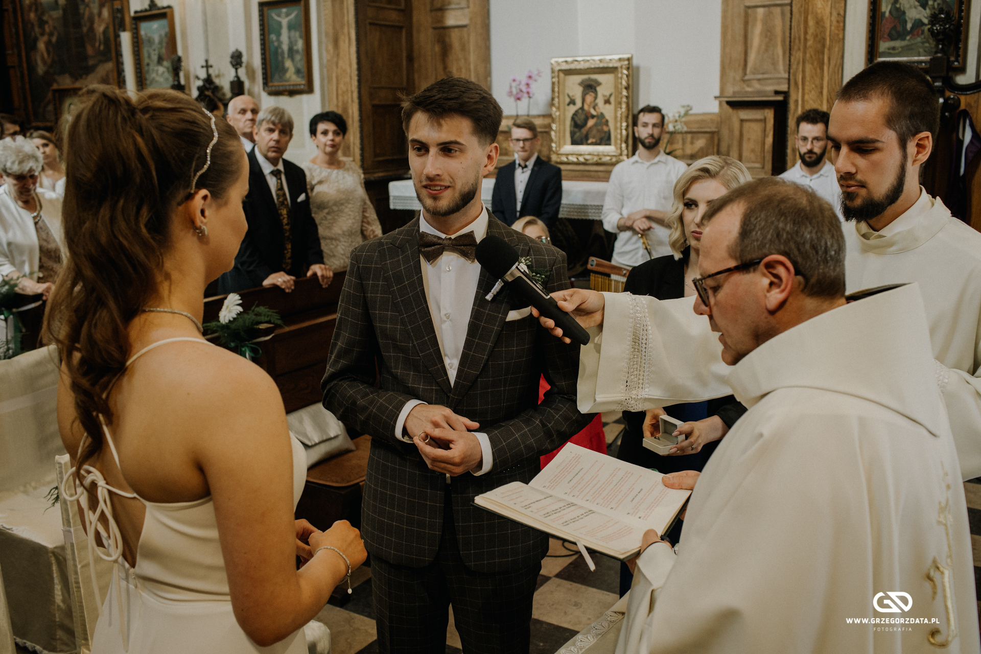 Chwilę później jechaliśmy już do kościoła. Prowadziła Zuzanna, a sama droga dostarczyła nam widoków pięknej panoramy Krosna. Na miejscu wszyscy w poruszeniu czekali na młodych. Dużo emocji, szczególnie u rodziców. Tutaj wszystko grało – światło, kameralność, a wreszcie i muzyka. Ta było wyjątkowa, bo w kościelnym zespole udzielały się siostry pana młodego. Miałem ciarki - fajnie kiedy po kilkunastu sezonach ślubnych nadal czujesz takie emocje na ślubie!
