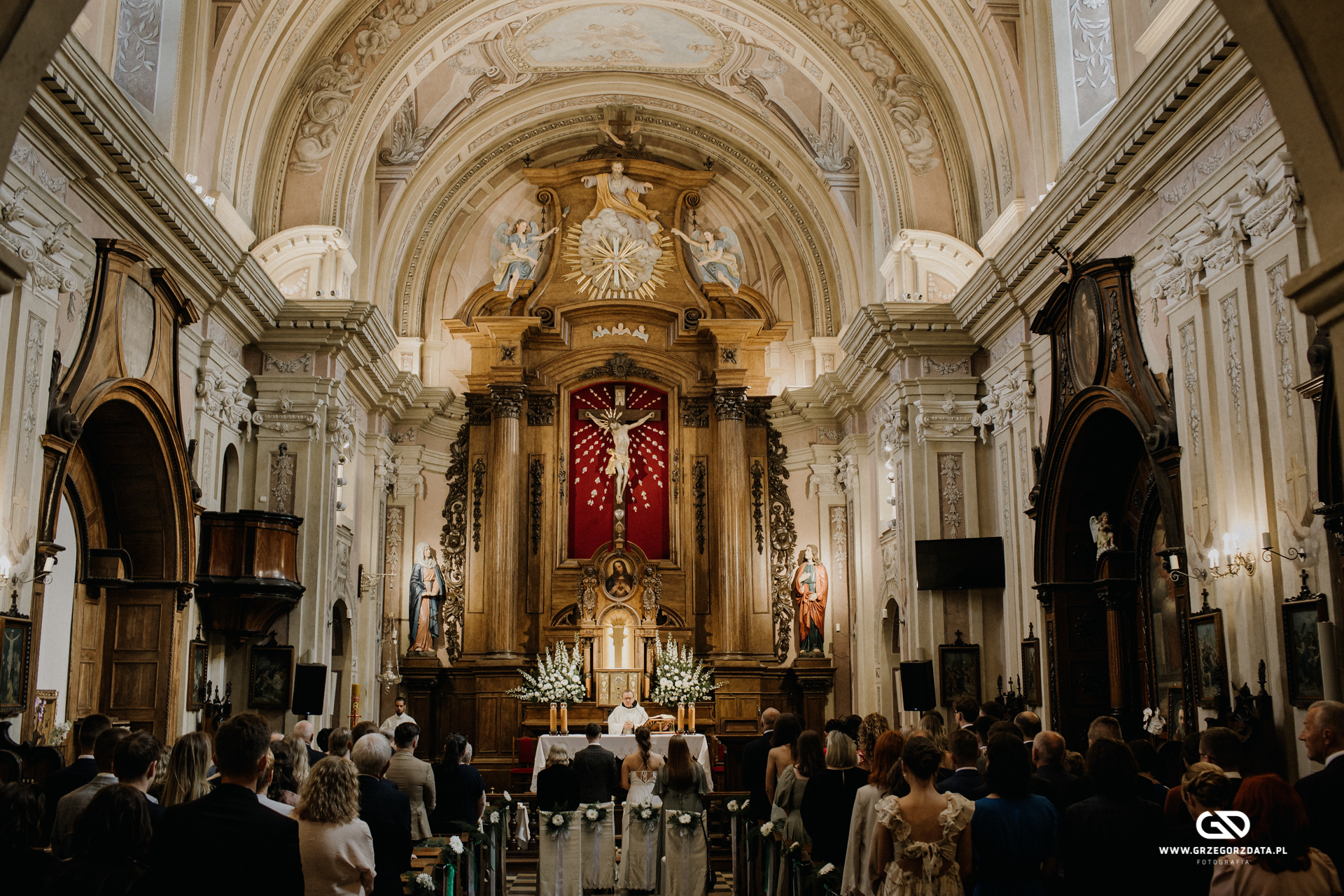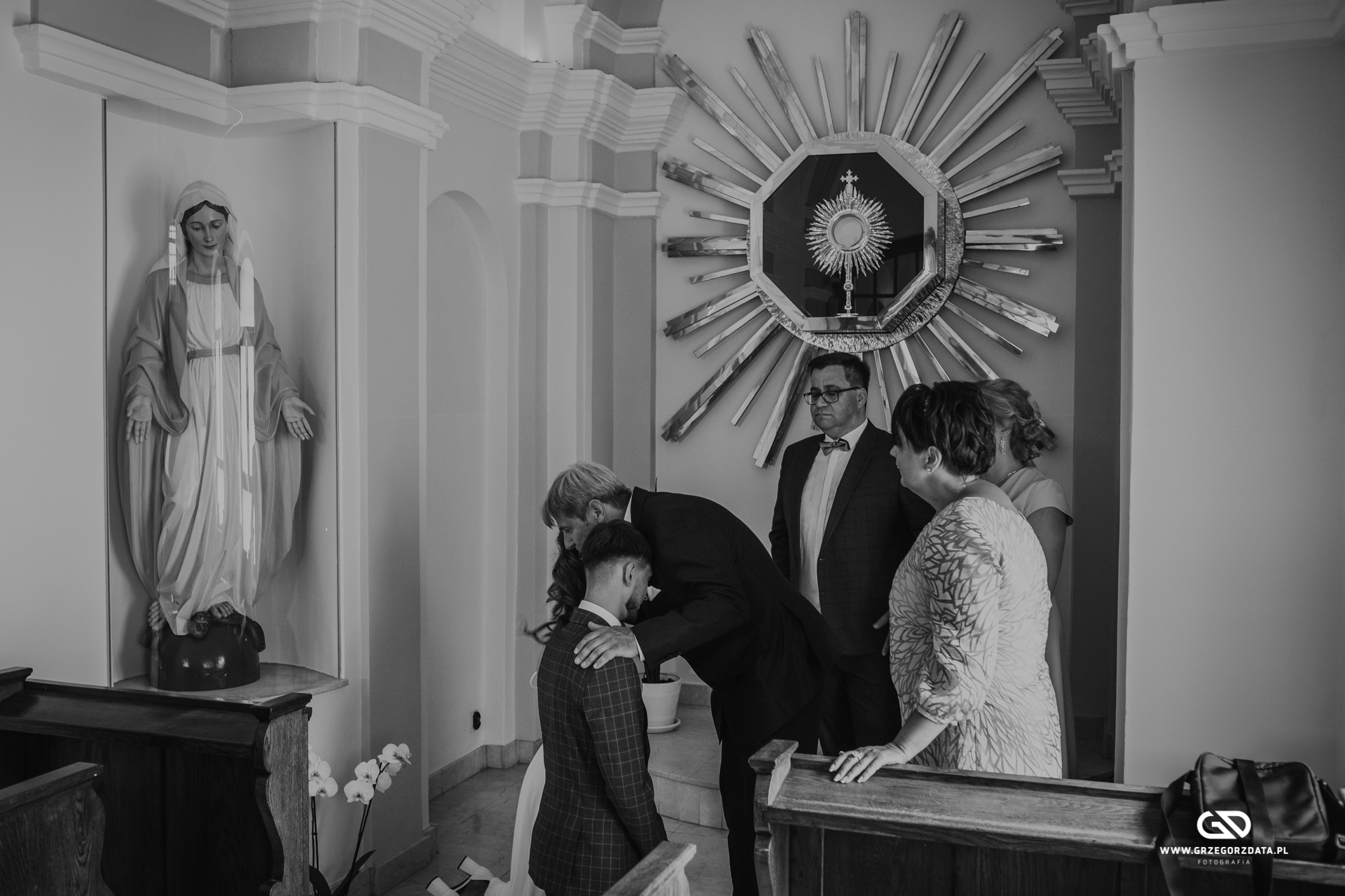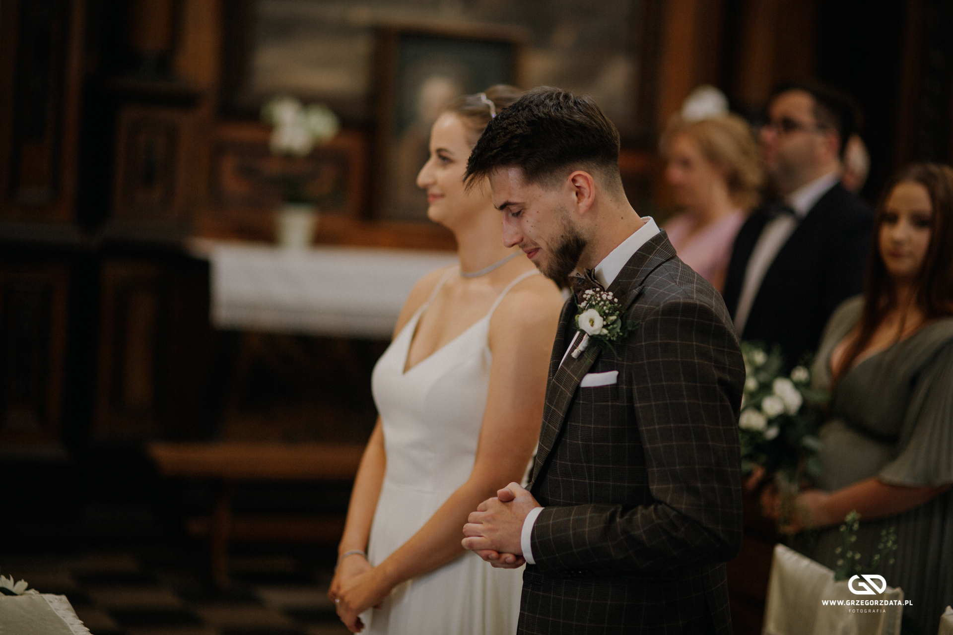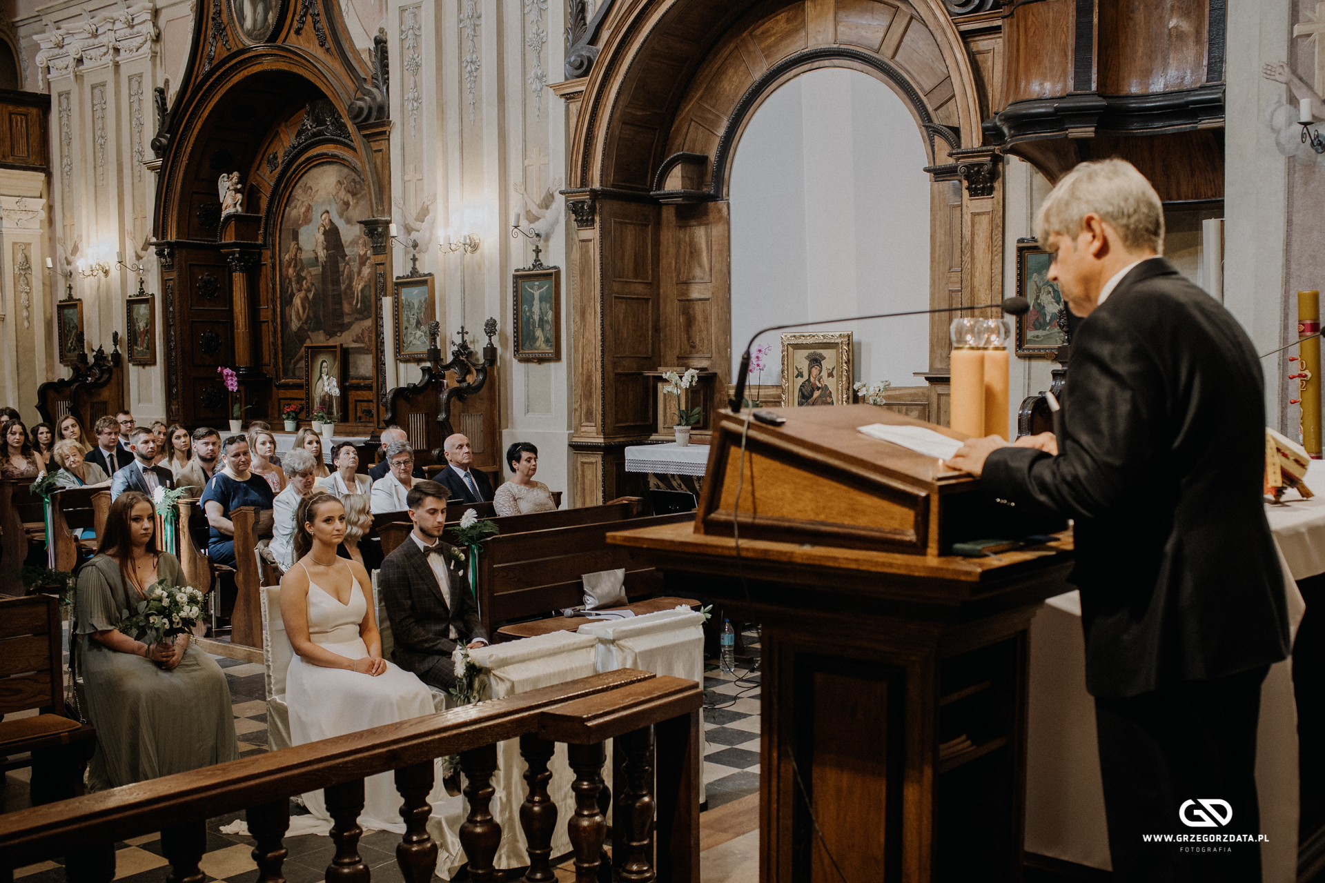 Chwilę później jechaliśmy już do kościoła. Prowadziła Zuzanna, a sama droga dostarczyła nam widoków pięknej panoramy Krosna. Na miejscu wszyscy w poruszeniu czekali na młodych. Dużo emocji, szczególnie u rodziców. Tutaj wszystko grało – światło, kameralność, a wreszcie i muzyka. Ta było wyjątkowa, bo w kościelnym zespole udzielały się siostry pana młodego. Miałem ciarki - fajnie kiedy po kilkunastu sezonach ślubnych nadal czujesz takie emocje na ślubie!