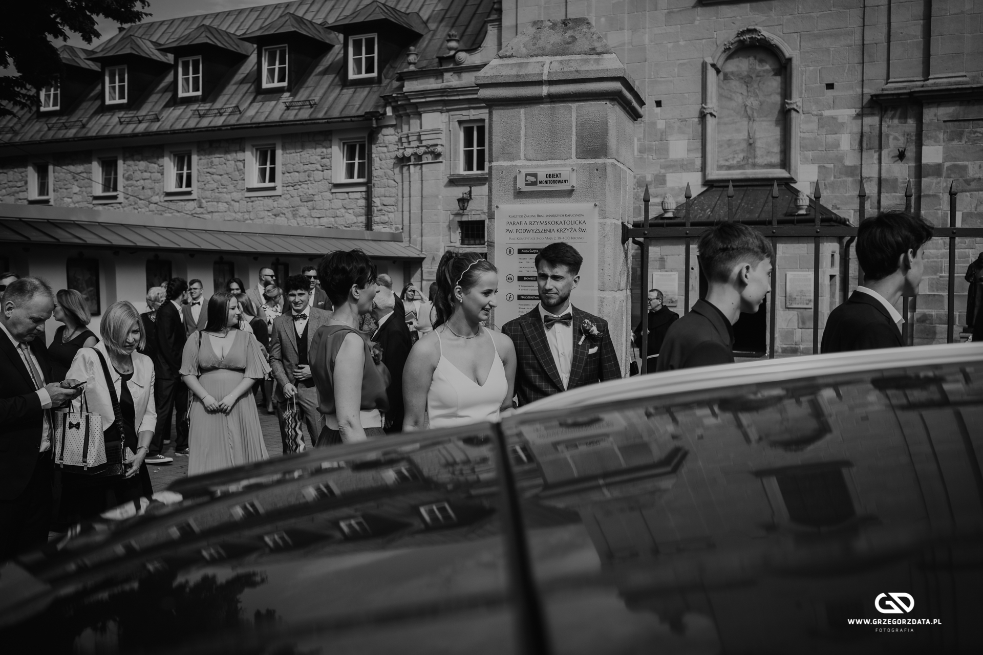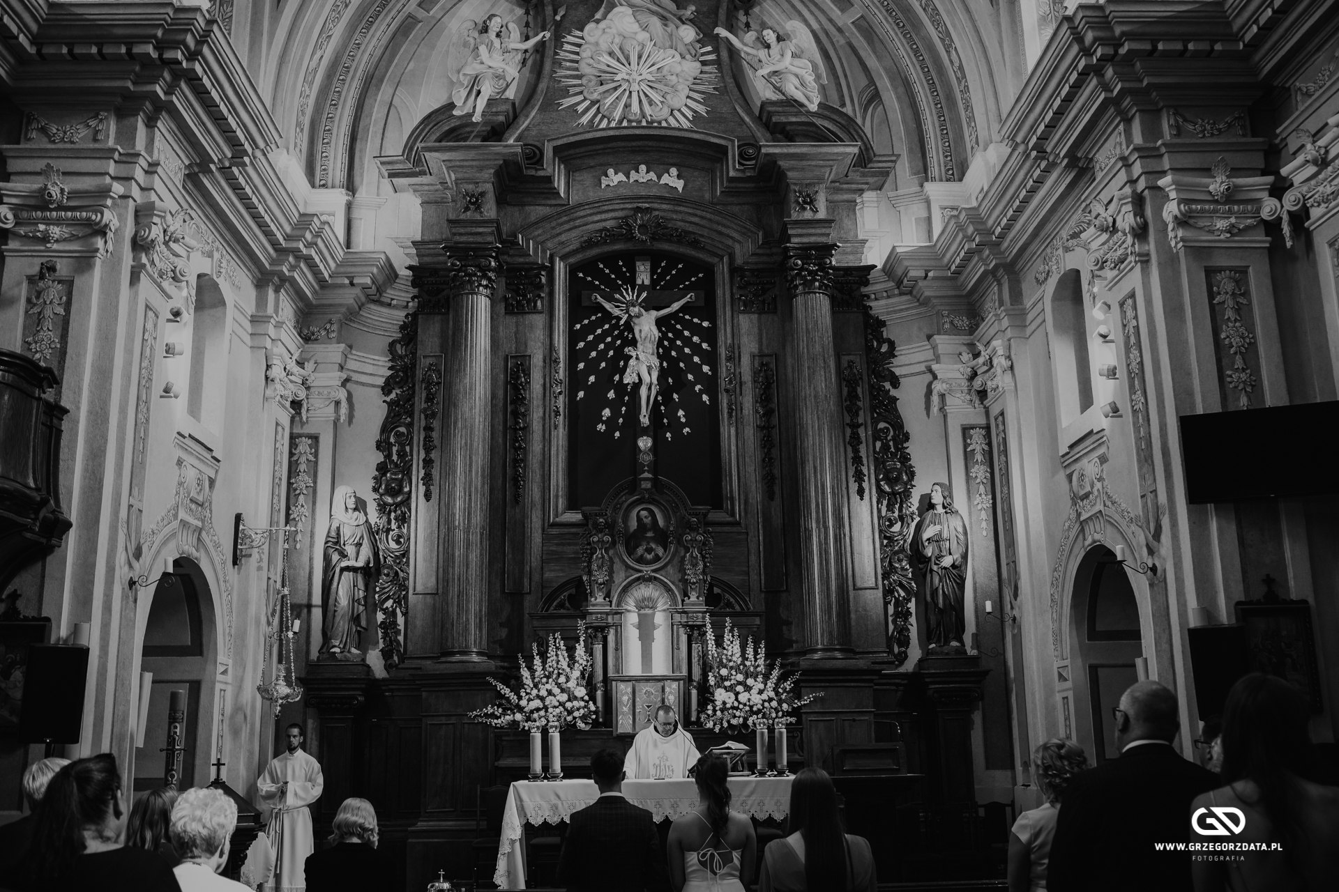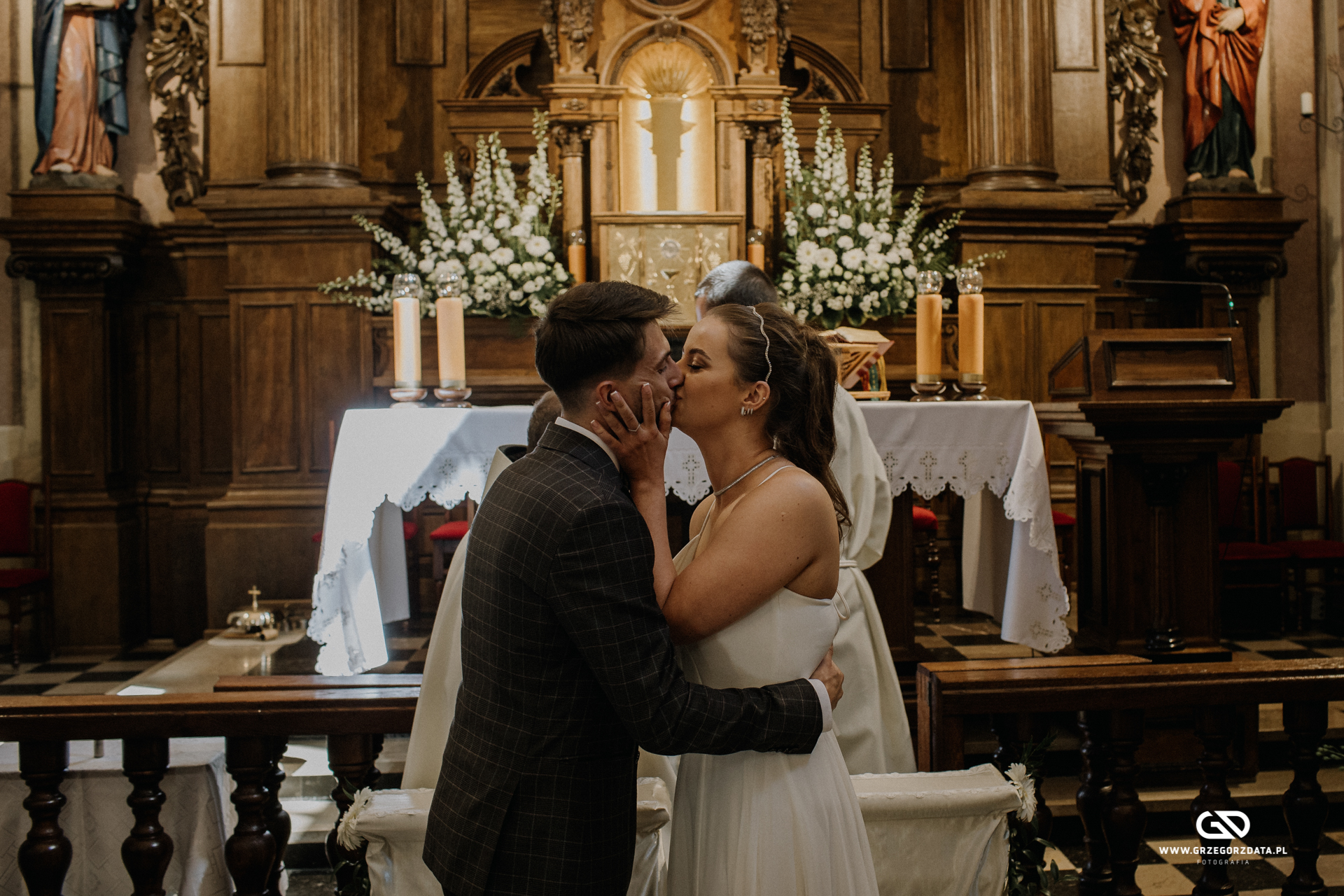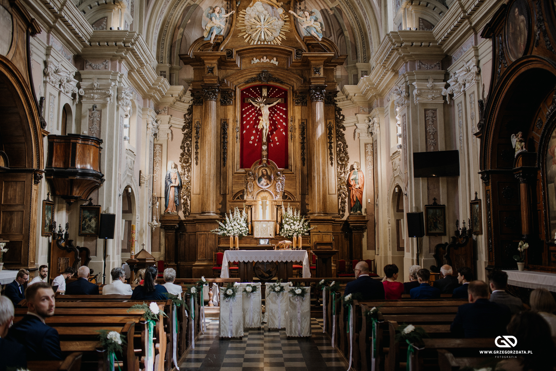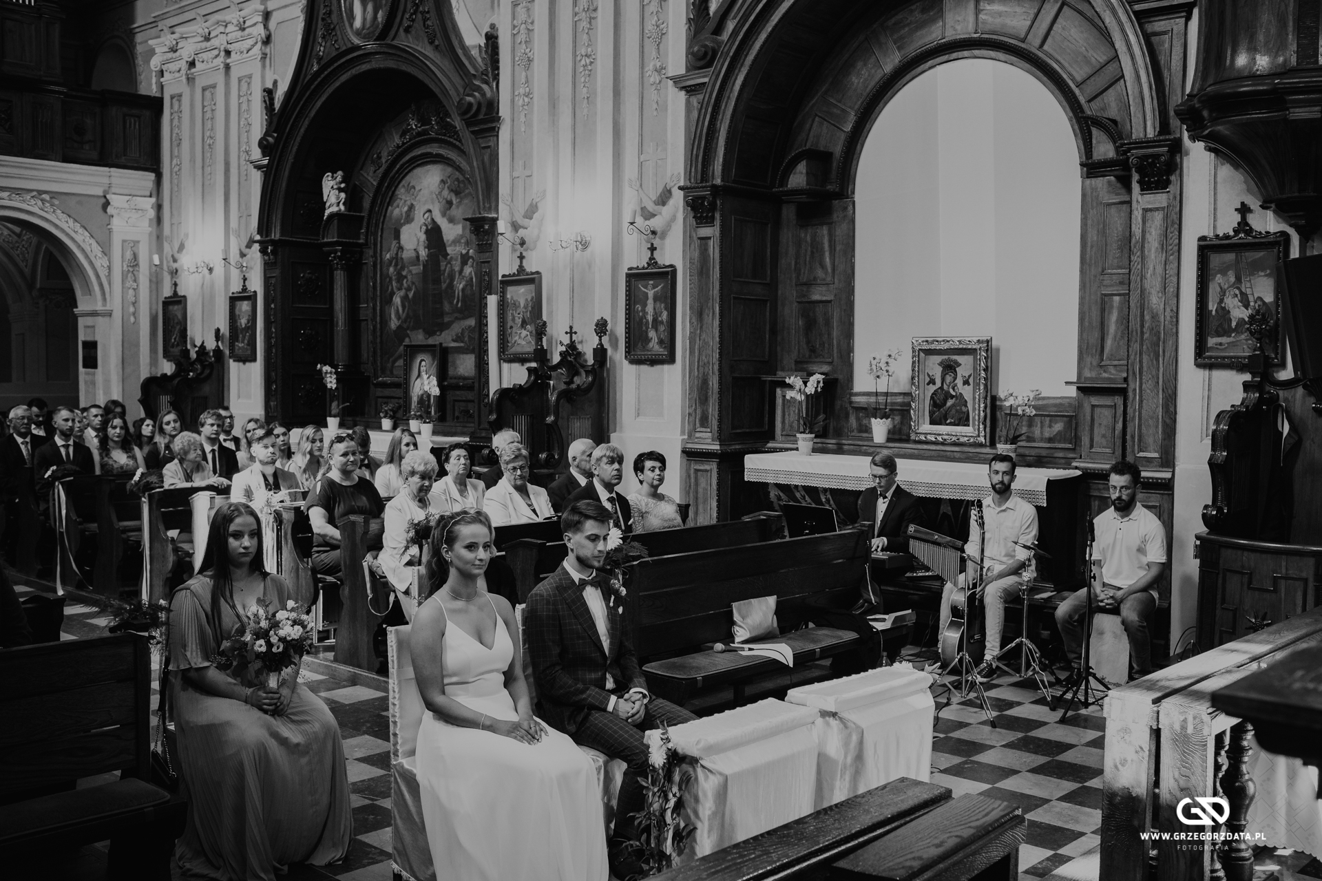 Chwilę później jechaliśmy już do kościoła. Prowadziła Zuzanna, a sama droga dostarczyła nam widoków pięknej panoramy Krosna. Na miejscu wszyscy w poruszeniu czekali na młodych. Dużo emocji, szczególnie u rodziców. Tutaj wszystko grało – światło, kameralność, a wreszcie i muzyka. Ta było wyjątkowa, bo w kościelnym zespole udzielały się siostry pana młodego. Miałem ciarki - fajnie kiedy po kilkunastu sezonach ślubnych nadal czujesz takie emocje na ślubie!