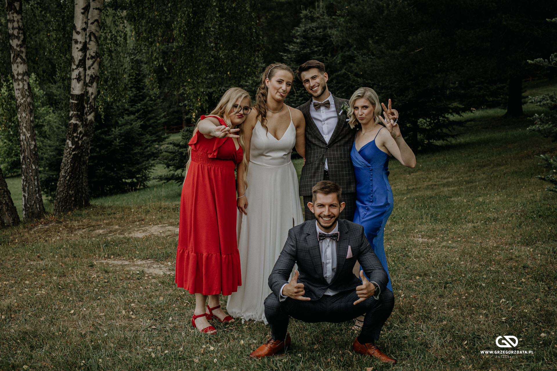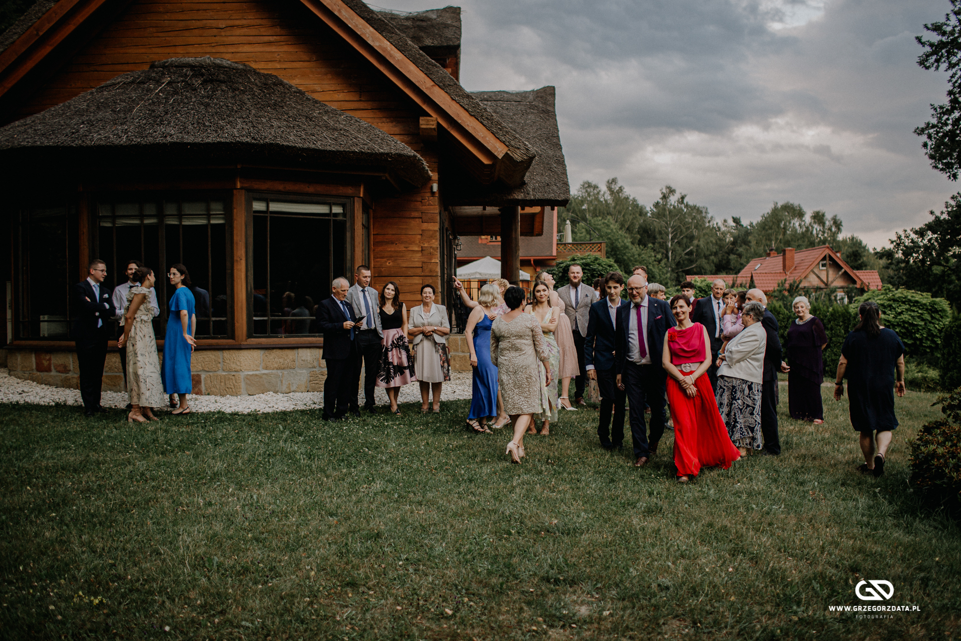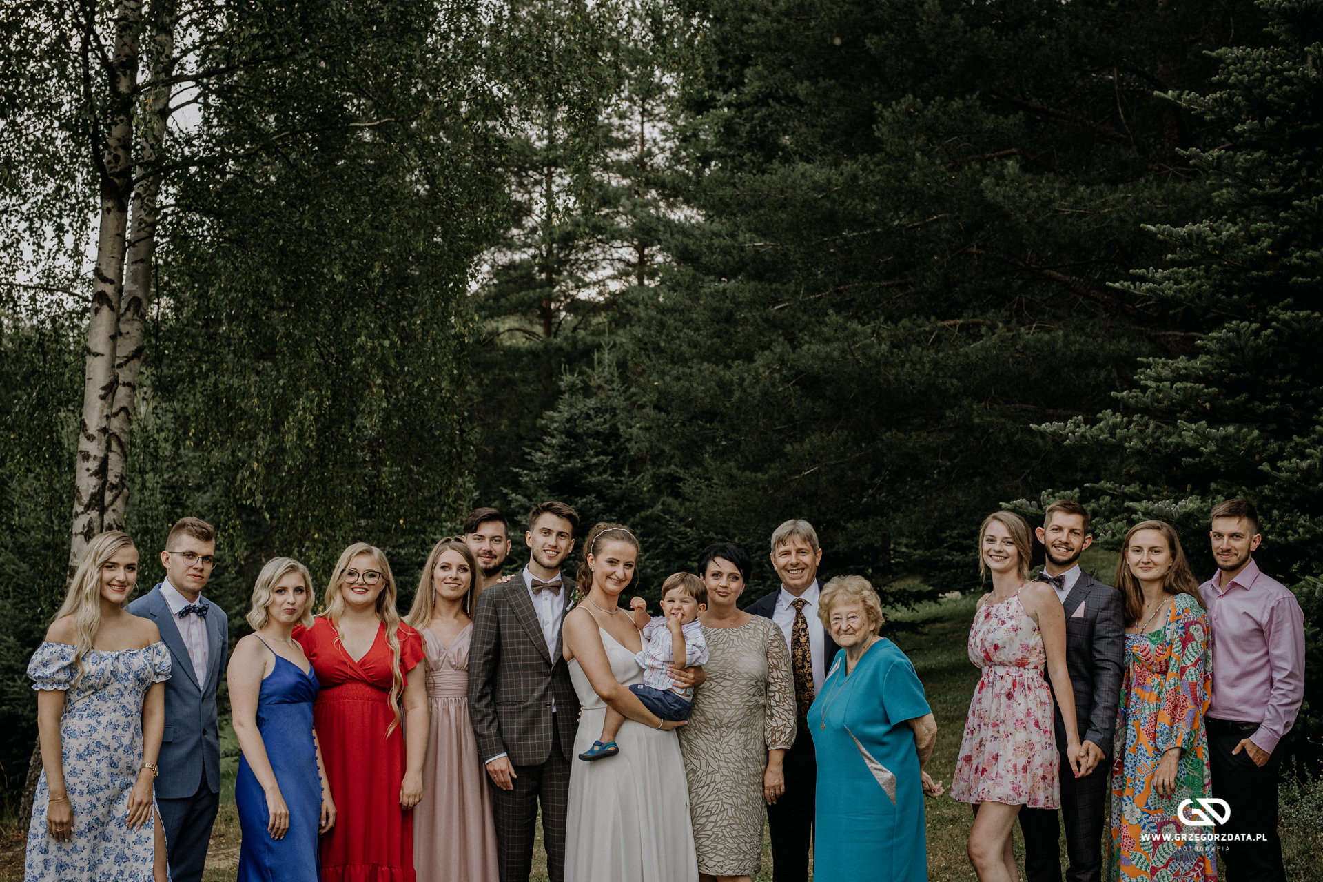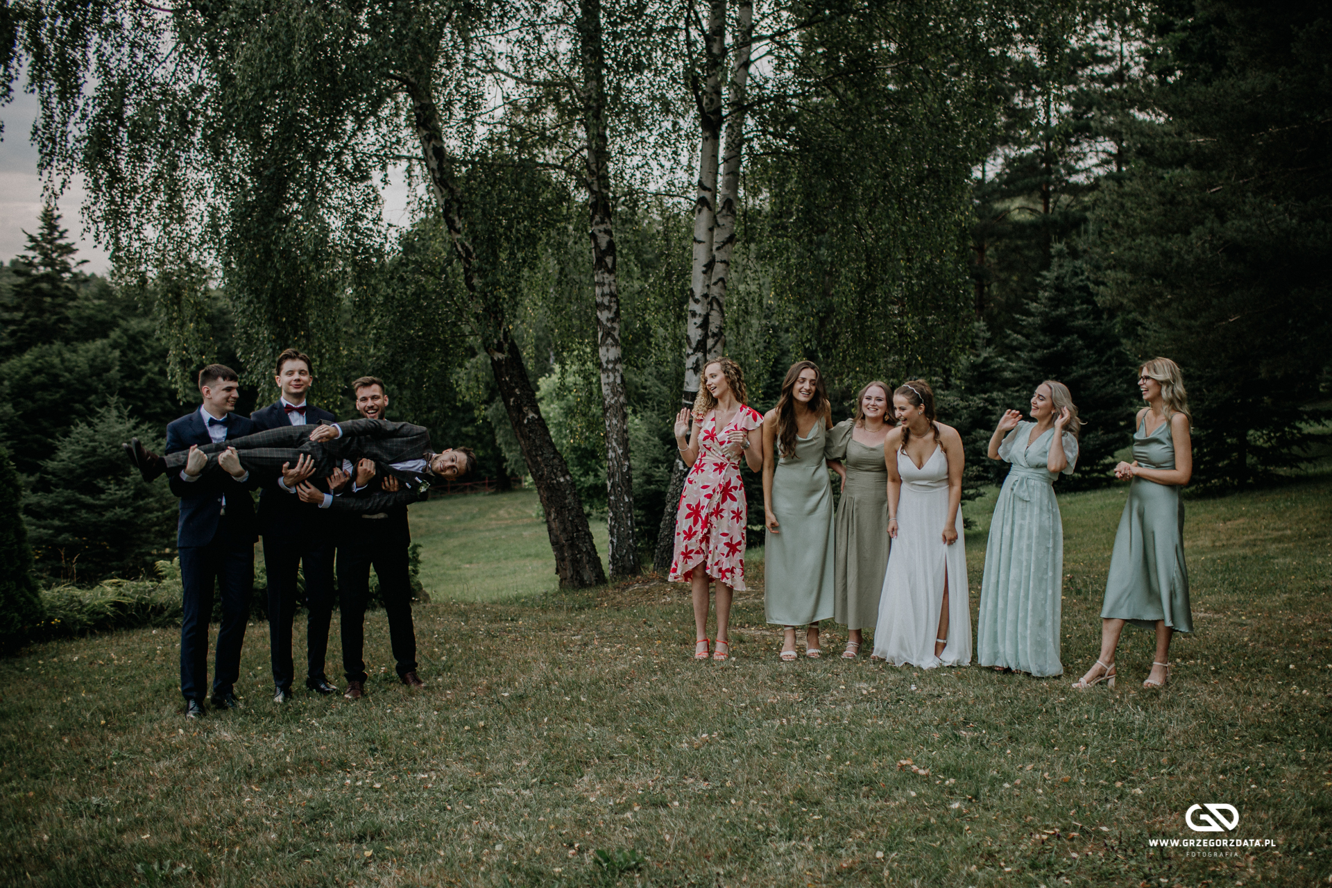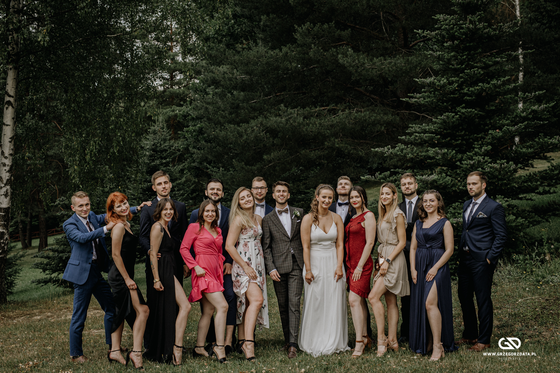 Po ślubie pora na zabawę. Uroczysko dostarczyło luźnej atmosfery – tak potrzebnej na tego typu weselach. Wszystko zgrało się idealnie, a ja dostałem od młodych tak dużą swobodę, że byłem wzruszony. Usłyszałem: “ufamy Ci w stu procentach, rób zdjęcia tak, jak czujesz” i niesionym tymi słowami postawiłem na uwiecznienie magii chwili. Bez nudnych, typowych kadrów, za to m.in. ze zdjęciami grupowymi w pięknym, zielonym otoczeniu w plenerze.