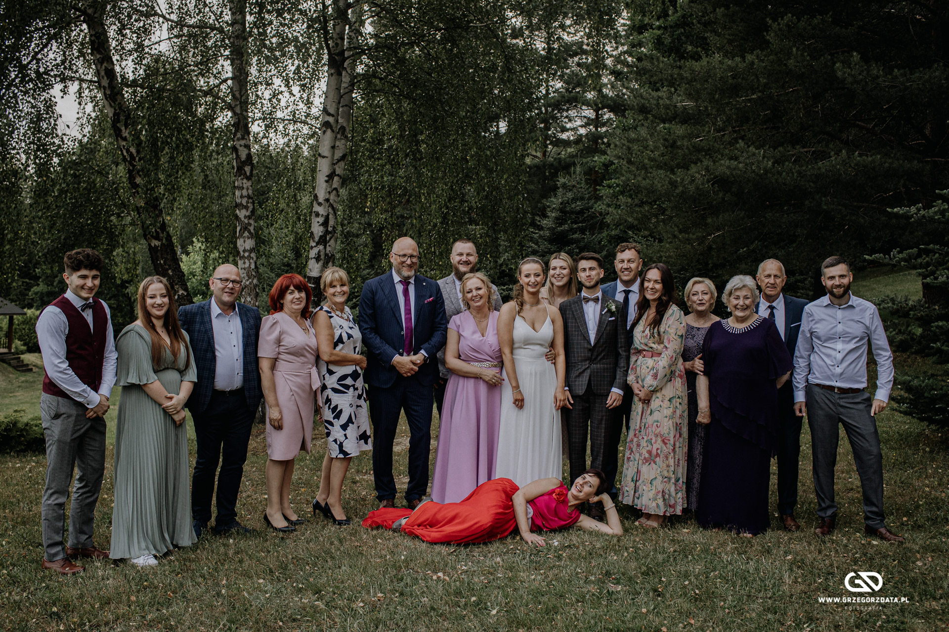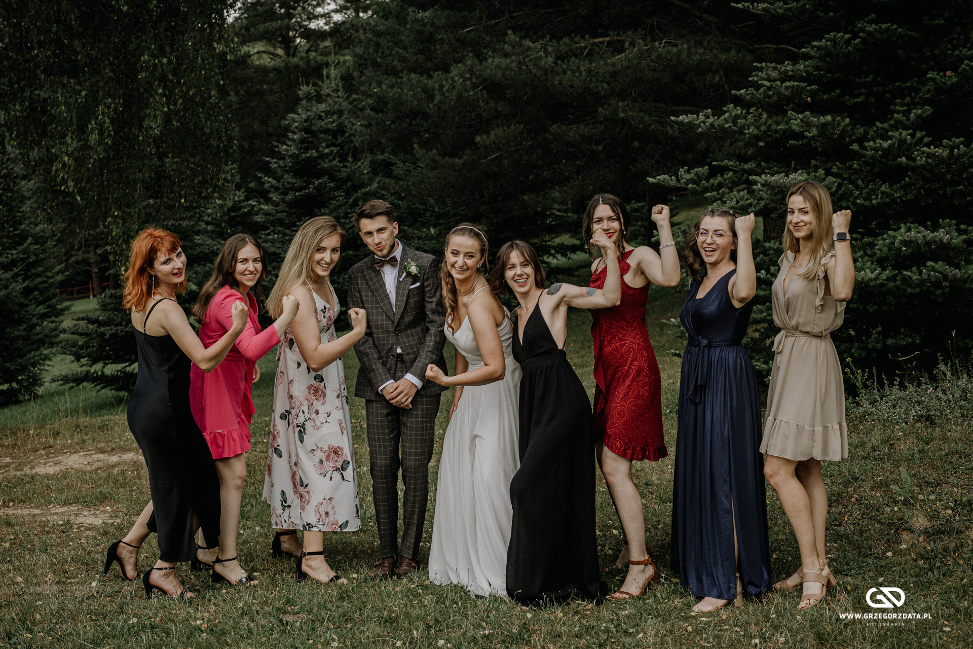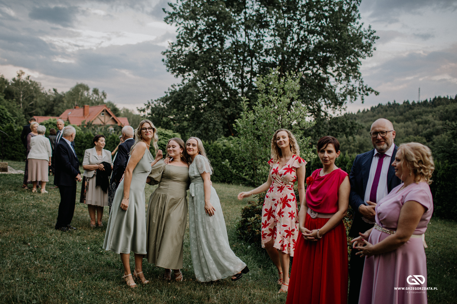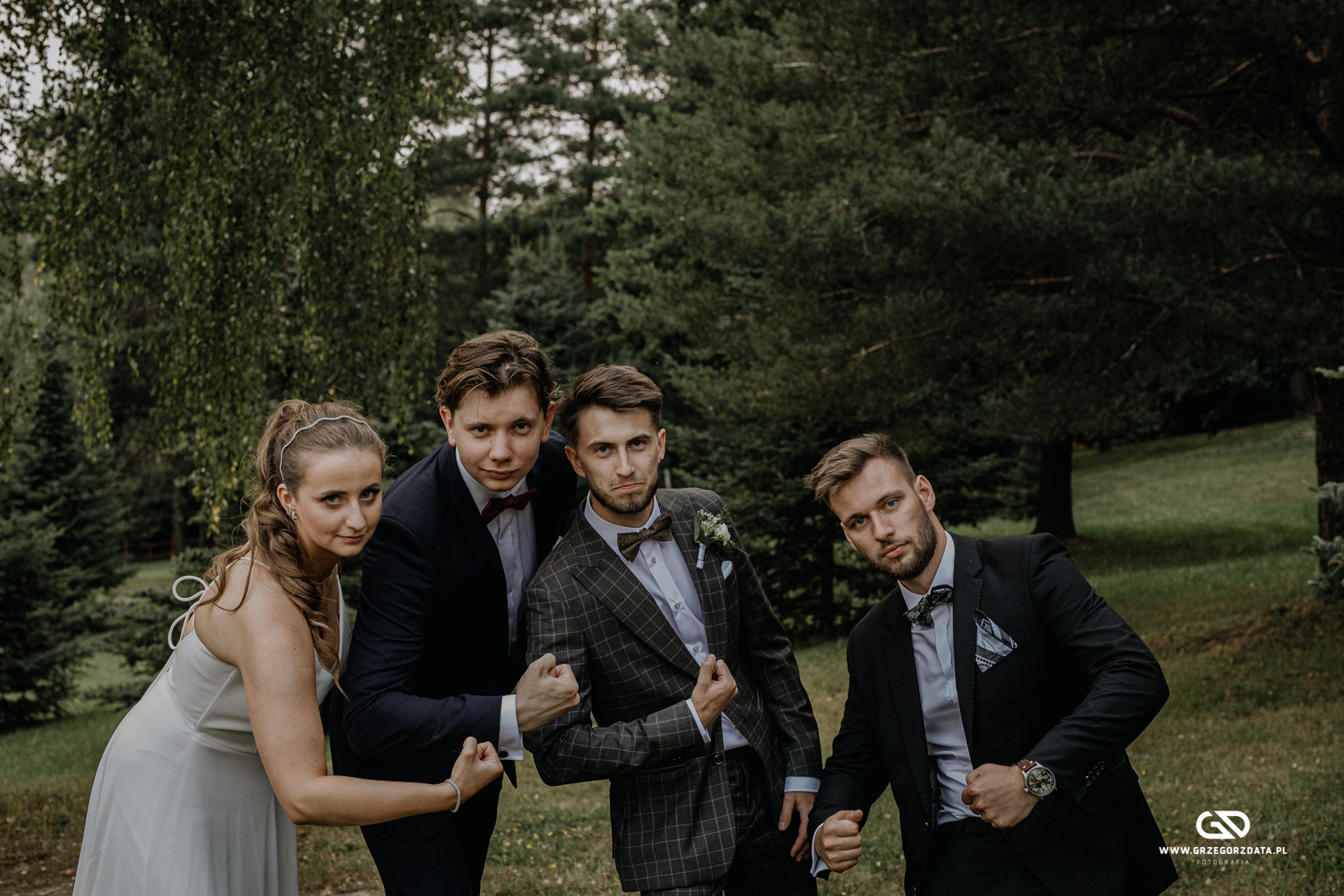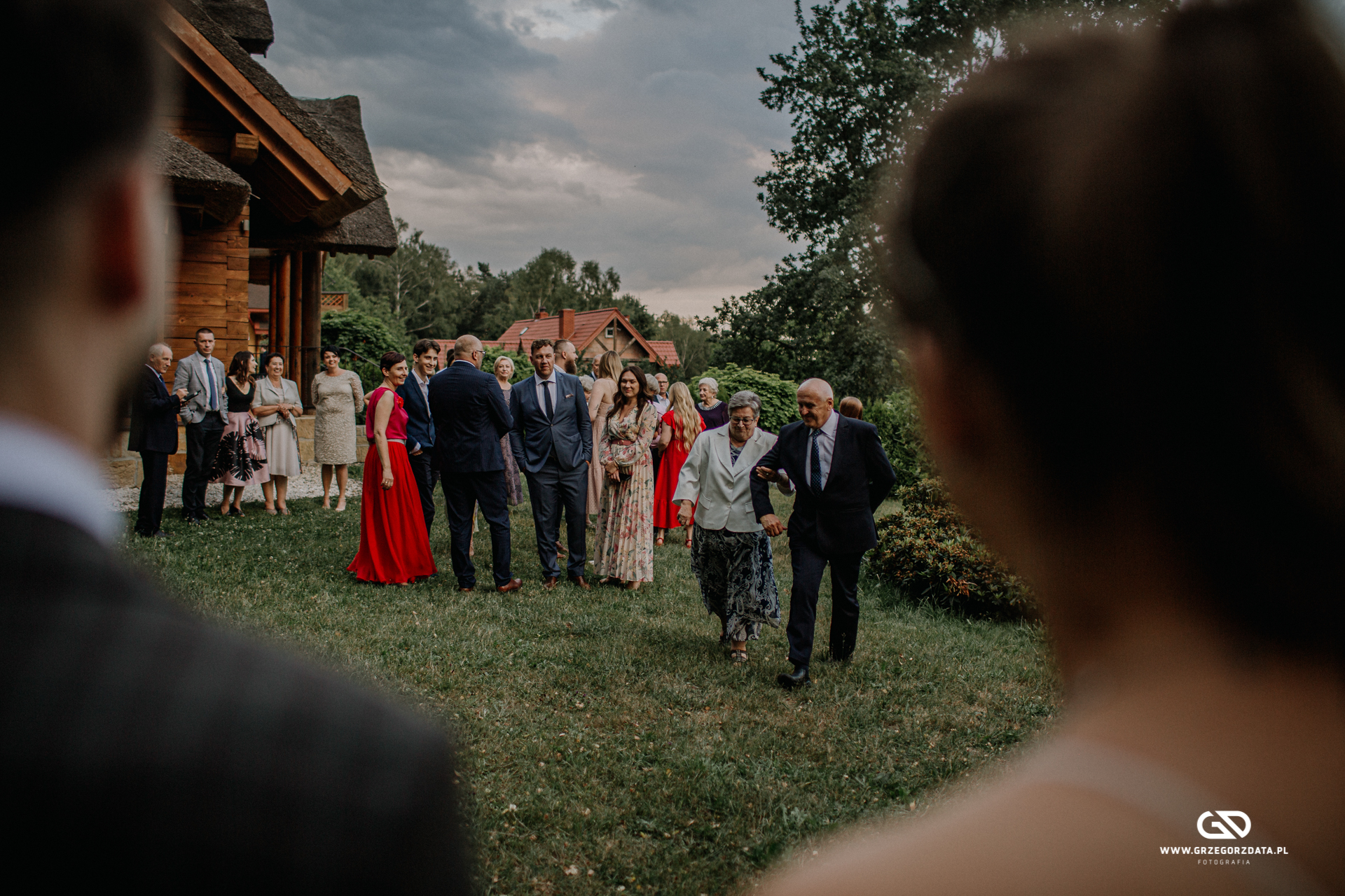 Po ślubie pora na zabawę. Uroczysko dostarczyło luźnej atmosfery – tak potrzebnej na tego typu weselach. Wszystko zgrało się idealnie, a ja dostałem od młodych tak dużą swobodę, że byłem wzruszony. Usłyszałem: “ufamy Ci w stu procentach, rób zdjęcia tak, jak czujesz” i niesionym tymi słowami postawiłem na uwiecznienie magii chwili. Bez nudnych, typowych kadrów, za to m.in. ze zdjęciami grupowymi w pięknym, zielonym otoczeniu w plenerze.