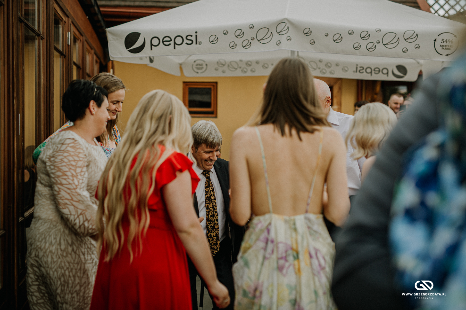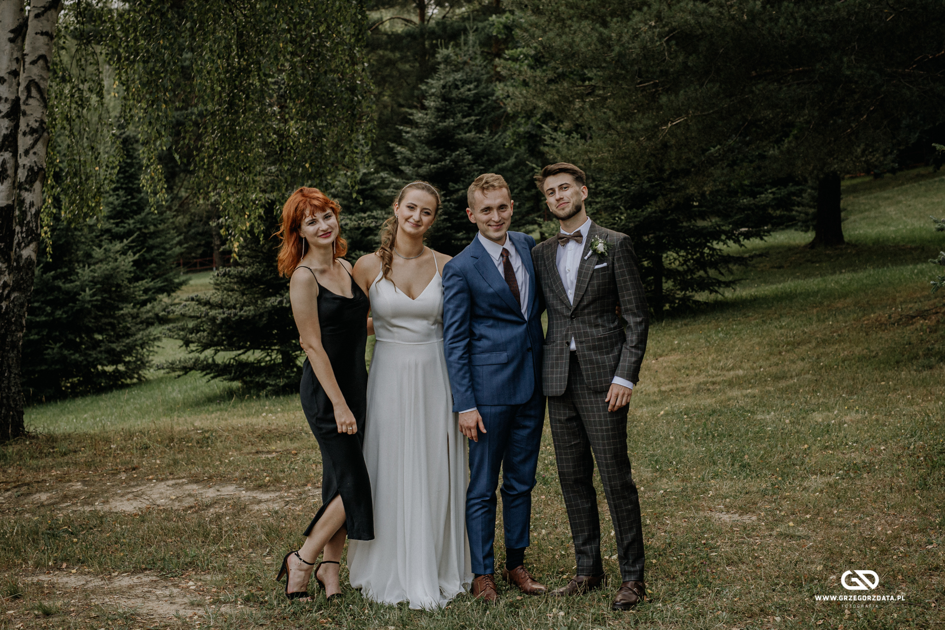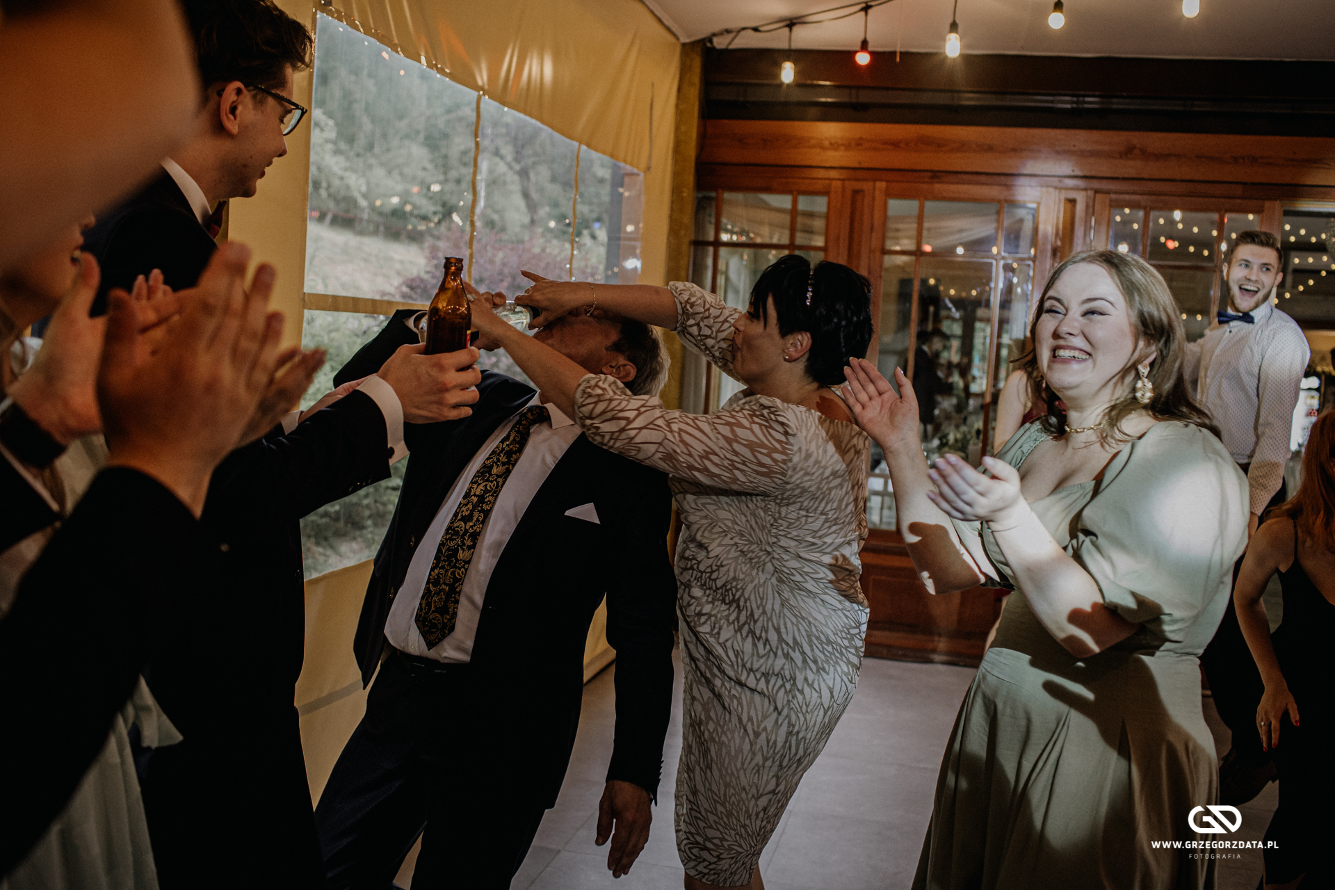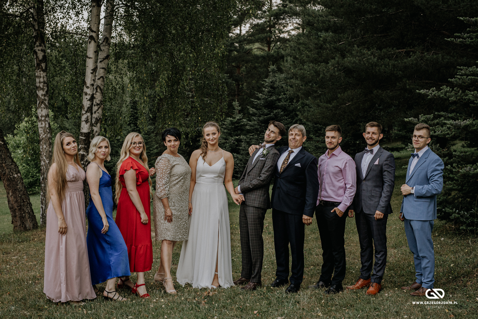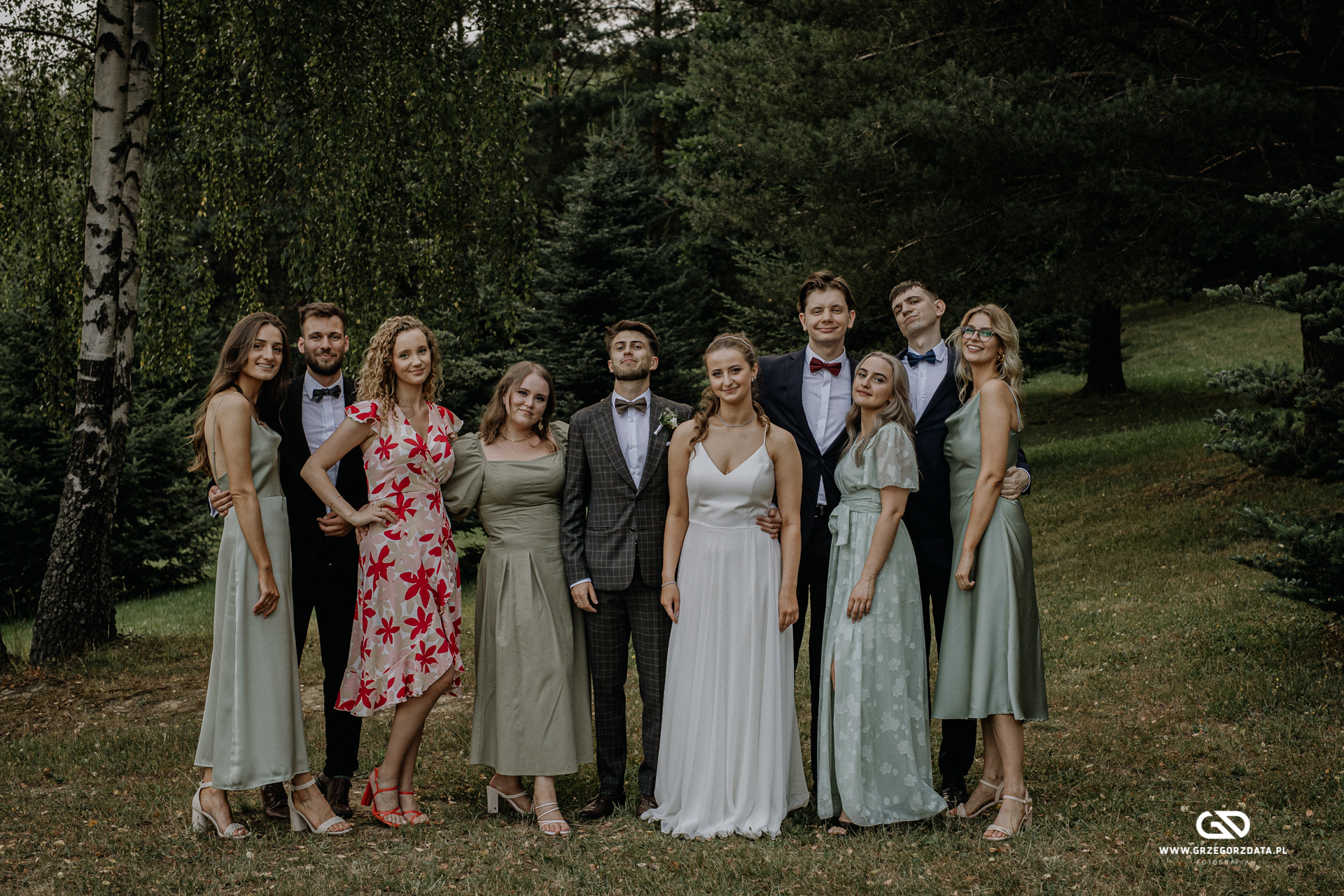 Po ślubie pora na zabawę. Uroczysko dostarczyło luźnej atmosfery – tak potrzebnej na tego typu weselach. Wszystko zgrało się idealnie, a ja dostałem od młodych tak dużą swobodę, że byłem wzruszony. Usłyszałem: “ufamy Ci w stu procentach, rób zdjęcia tak, jak czujesz” i niesionym tymi słowami postawiłem na uwiecznienie magii chwili. Bez nudnych, typowych kadrów, za to m.in. ze zdjęciami grupowymi w pięknym, zielonym otoczeniu w plenerze.