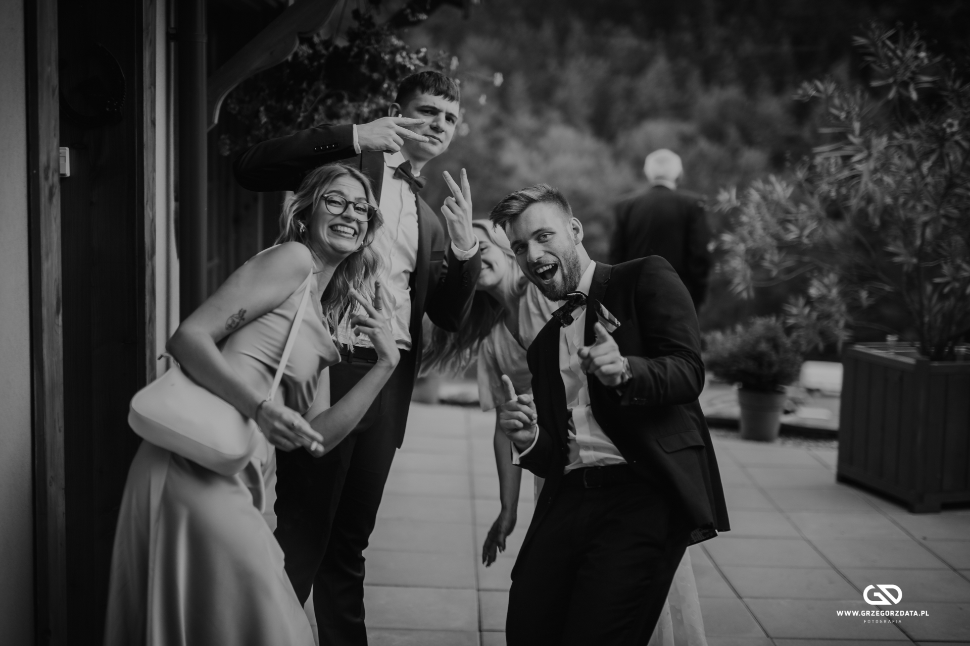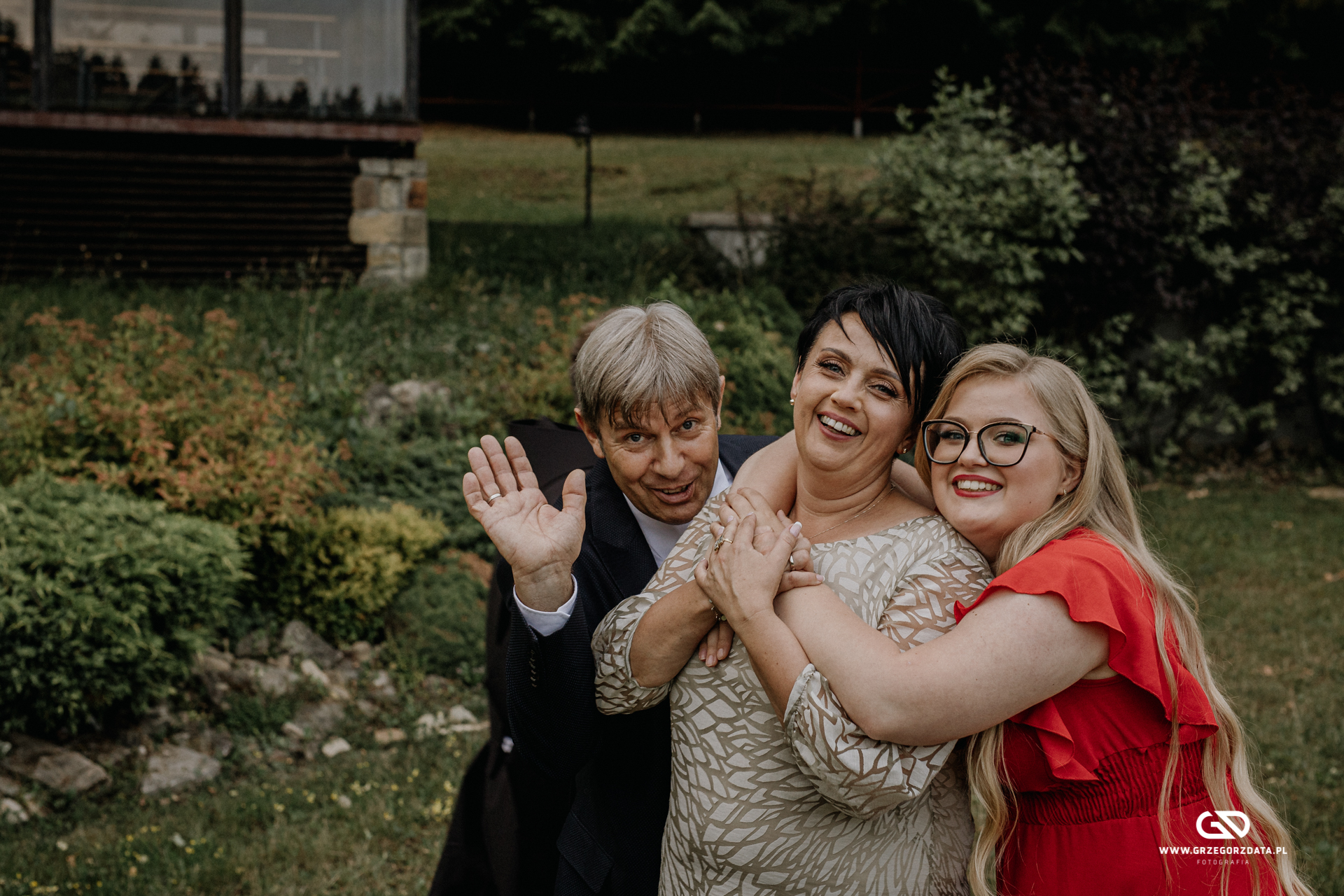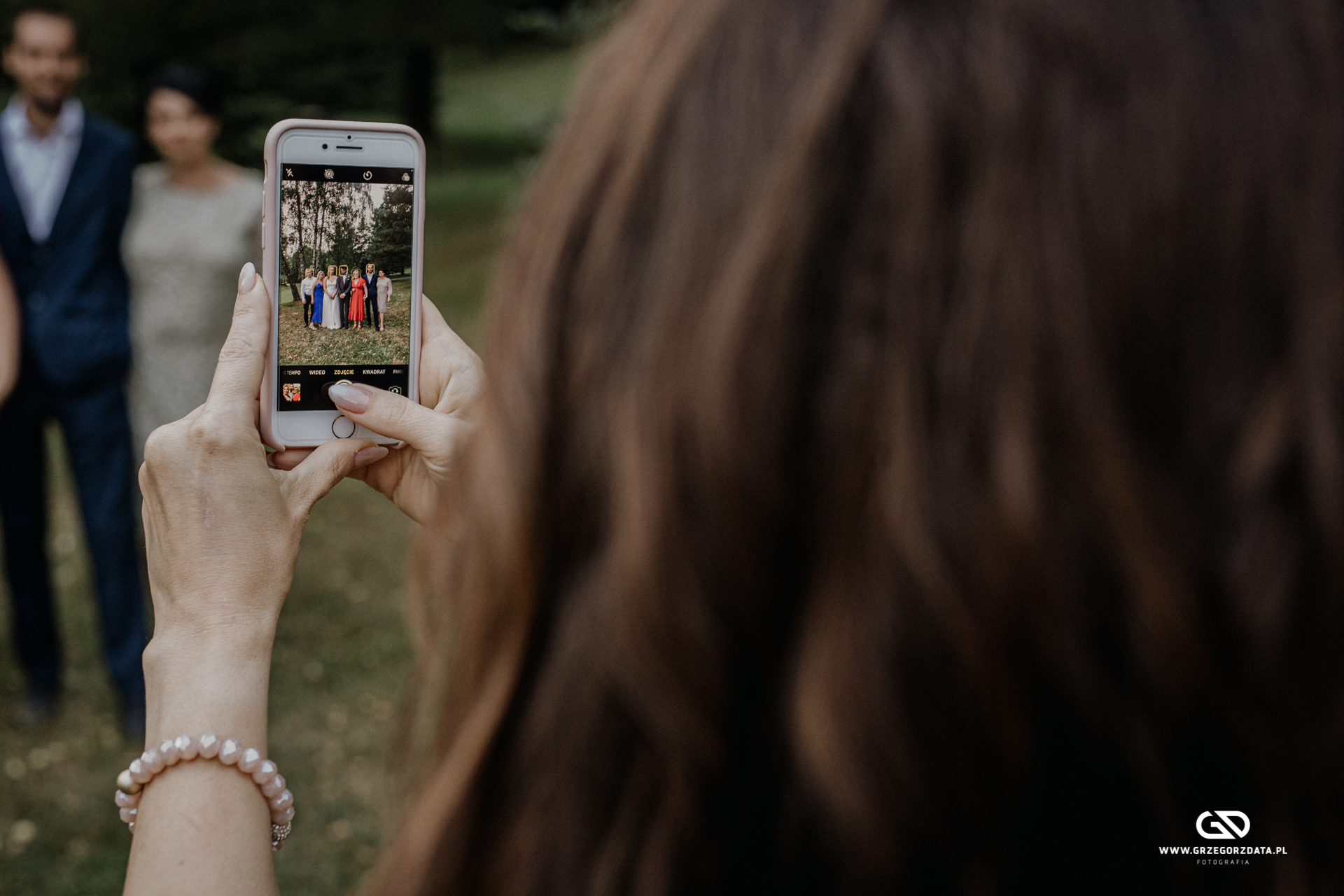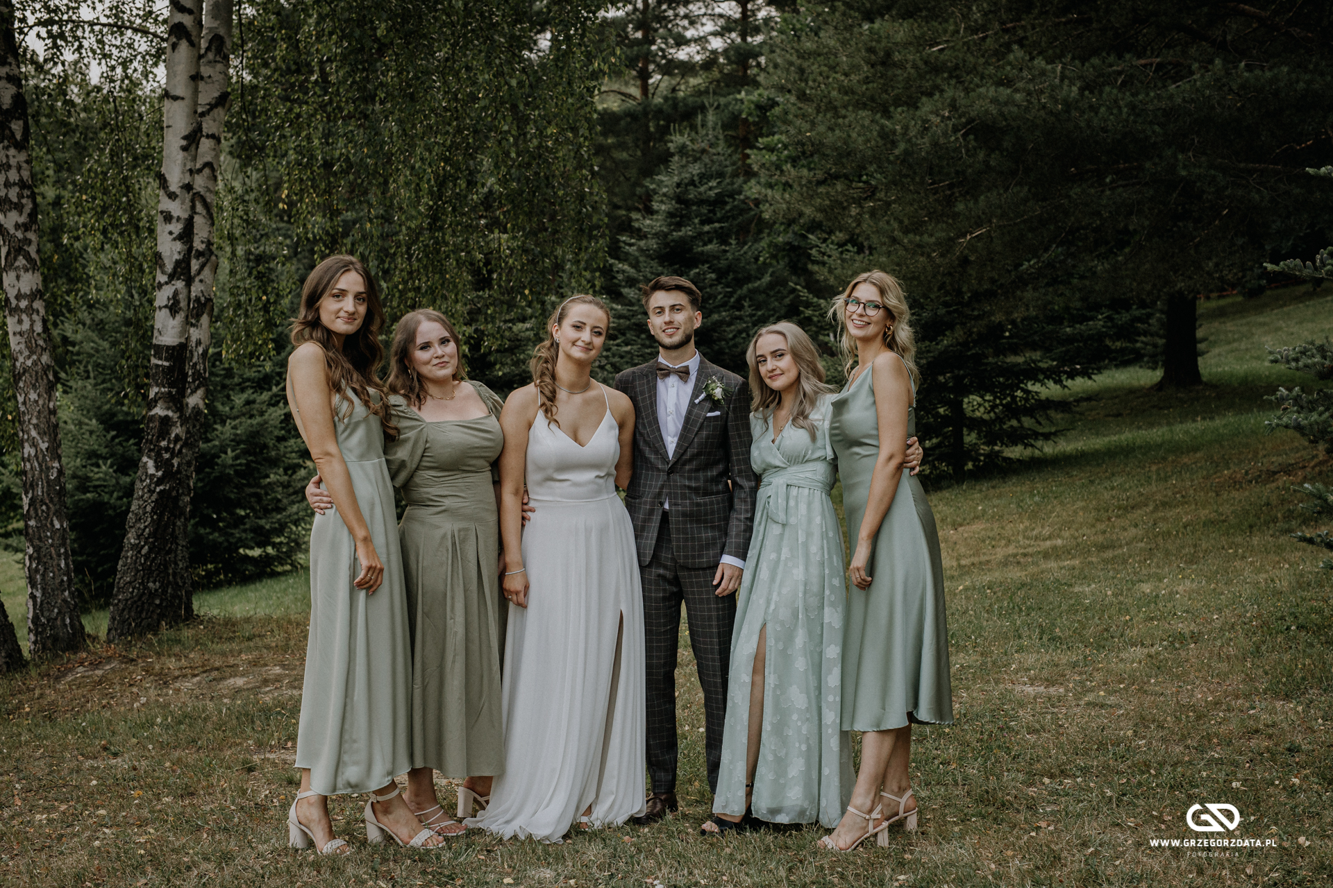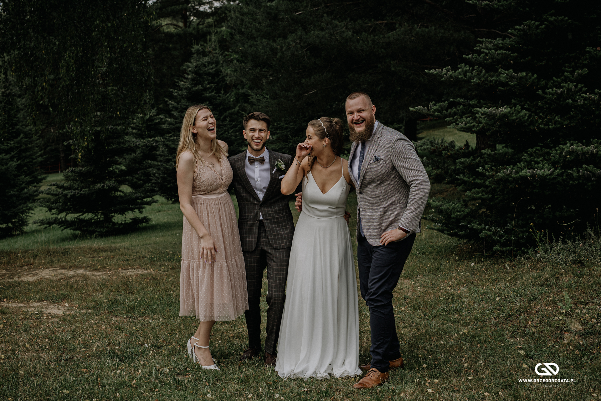 Po ślubie pora na zabawę. Uroczysko dostarczyło luźnej atmosfery – tak potrzebnej na tego typu weselach. Wszystko zgrało się idealnie, a ja dostałem od młodych tak dużą swobodę, że byłem wzruszony. Usłyszałem: “ufamy Ci w stu procentach, rób zdjęcia tak, jak czujesz” i niesionym tymi słowami postawiłem na uwiecznienie magii chwili. Bez nudnych, typowych kadrów, za to m.in. ze zdjęciami grupowymi w pięknym, zielonym otoczeniu w plenerze.