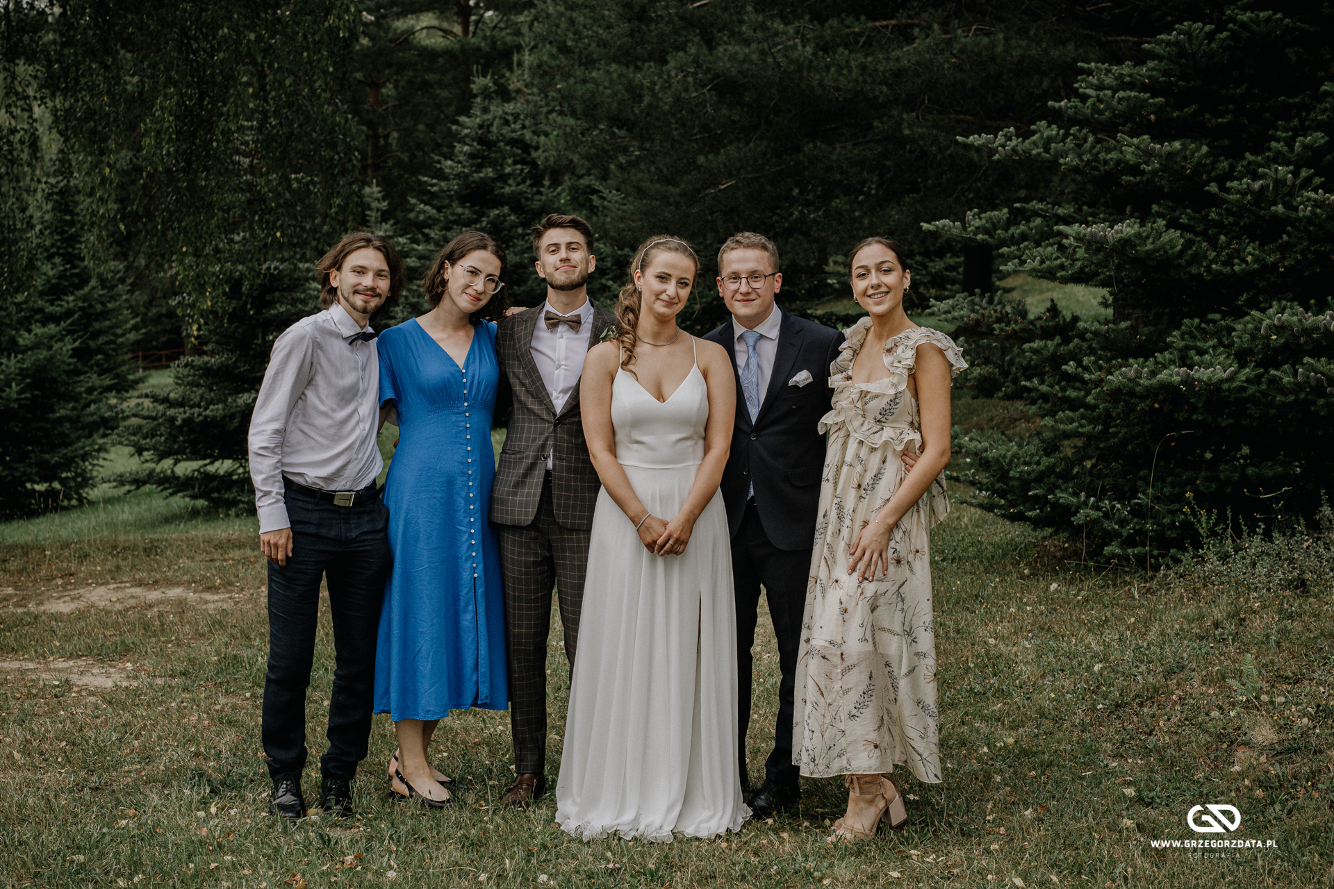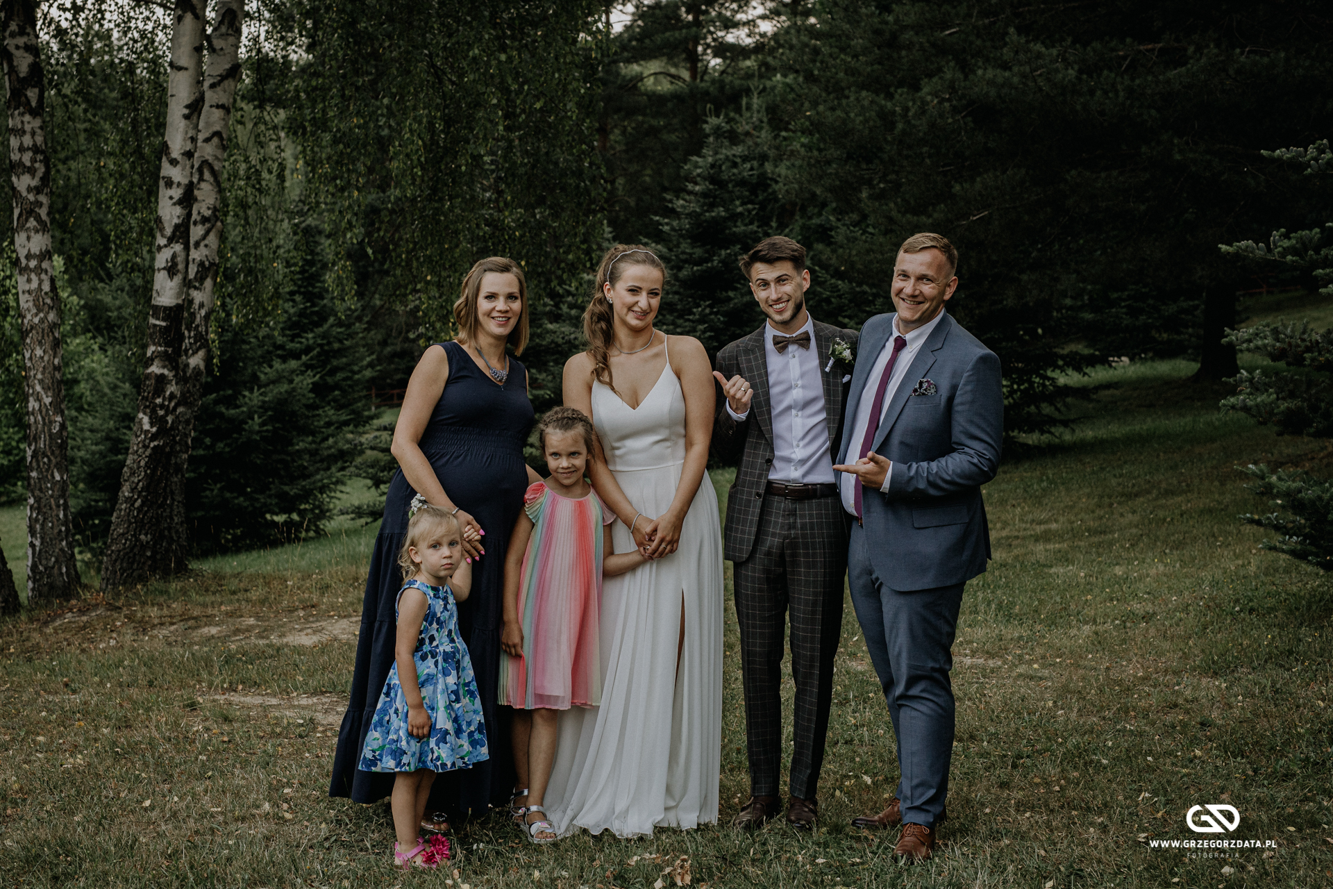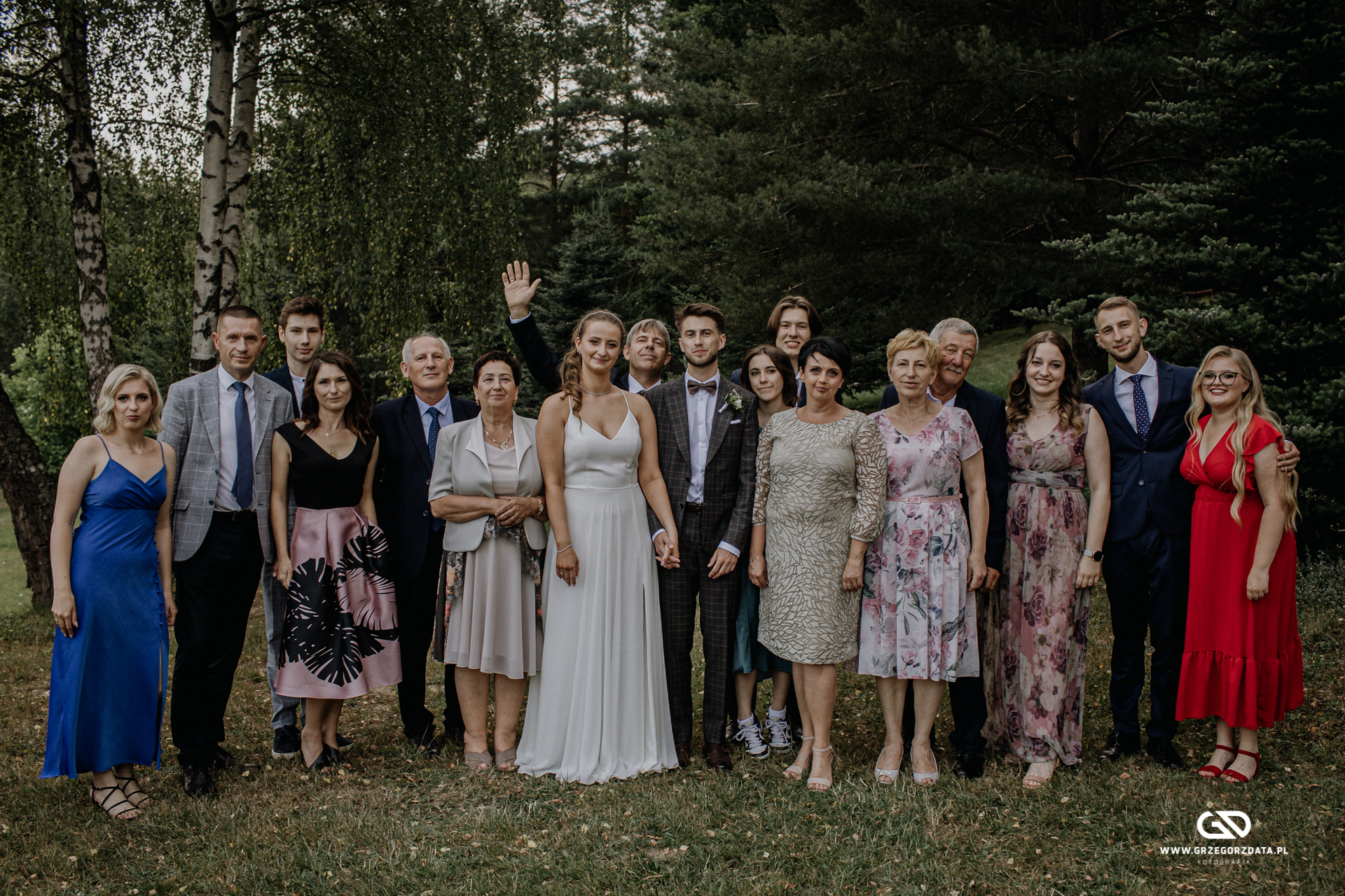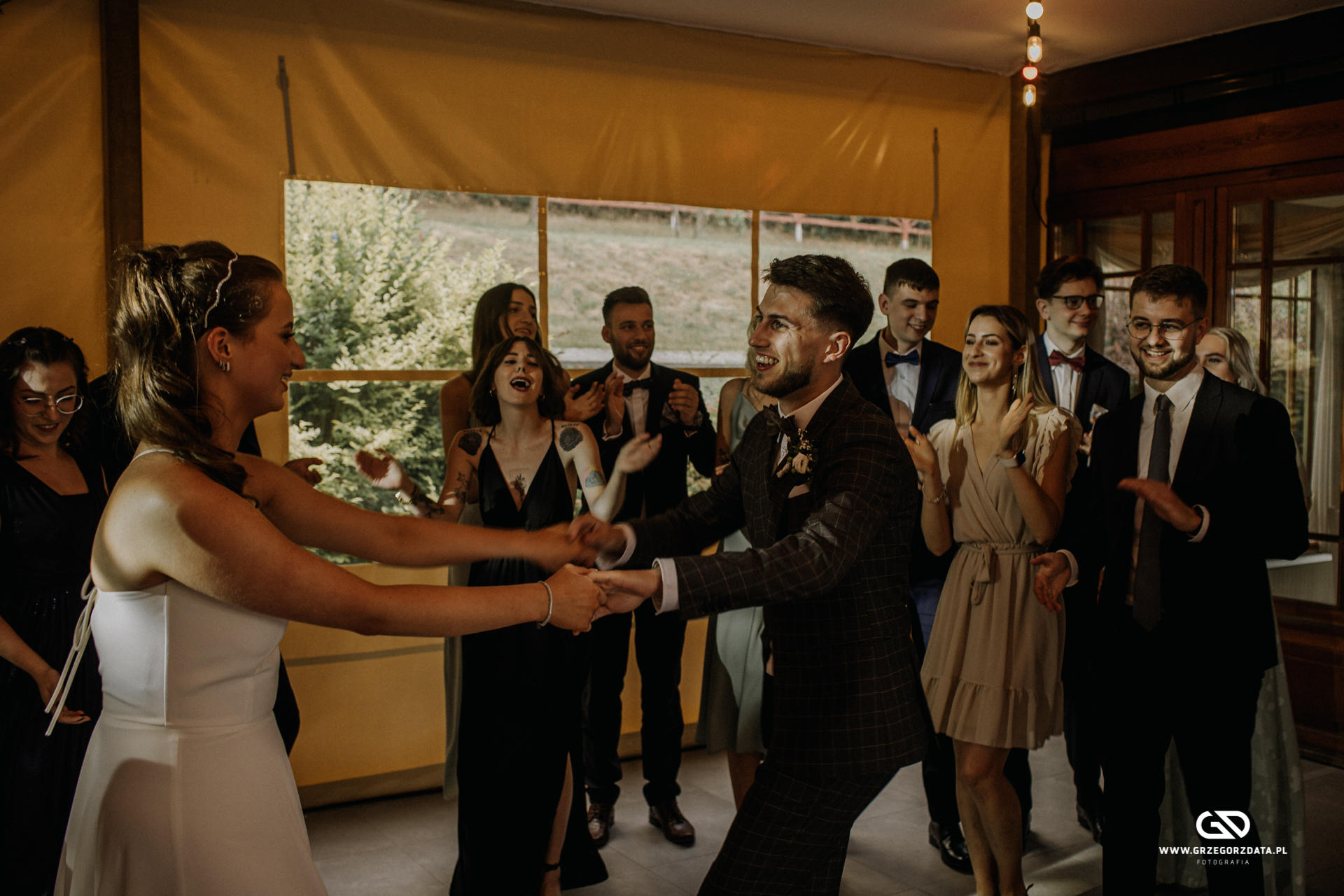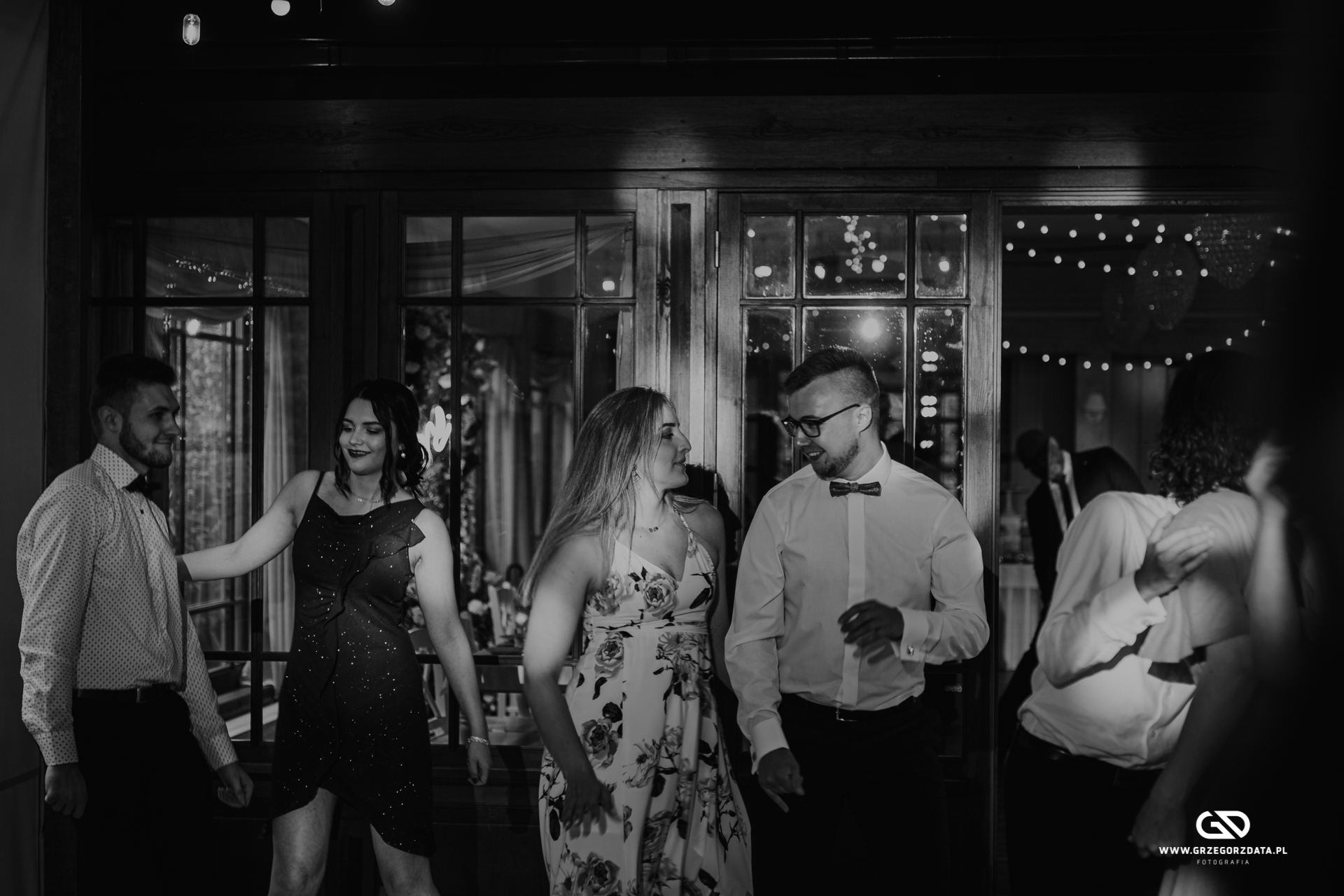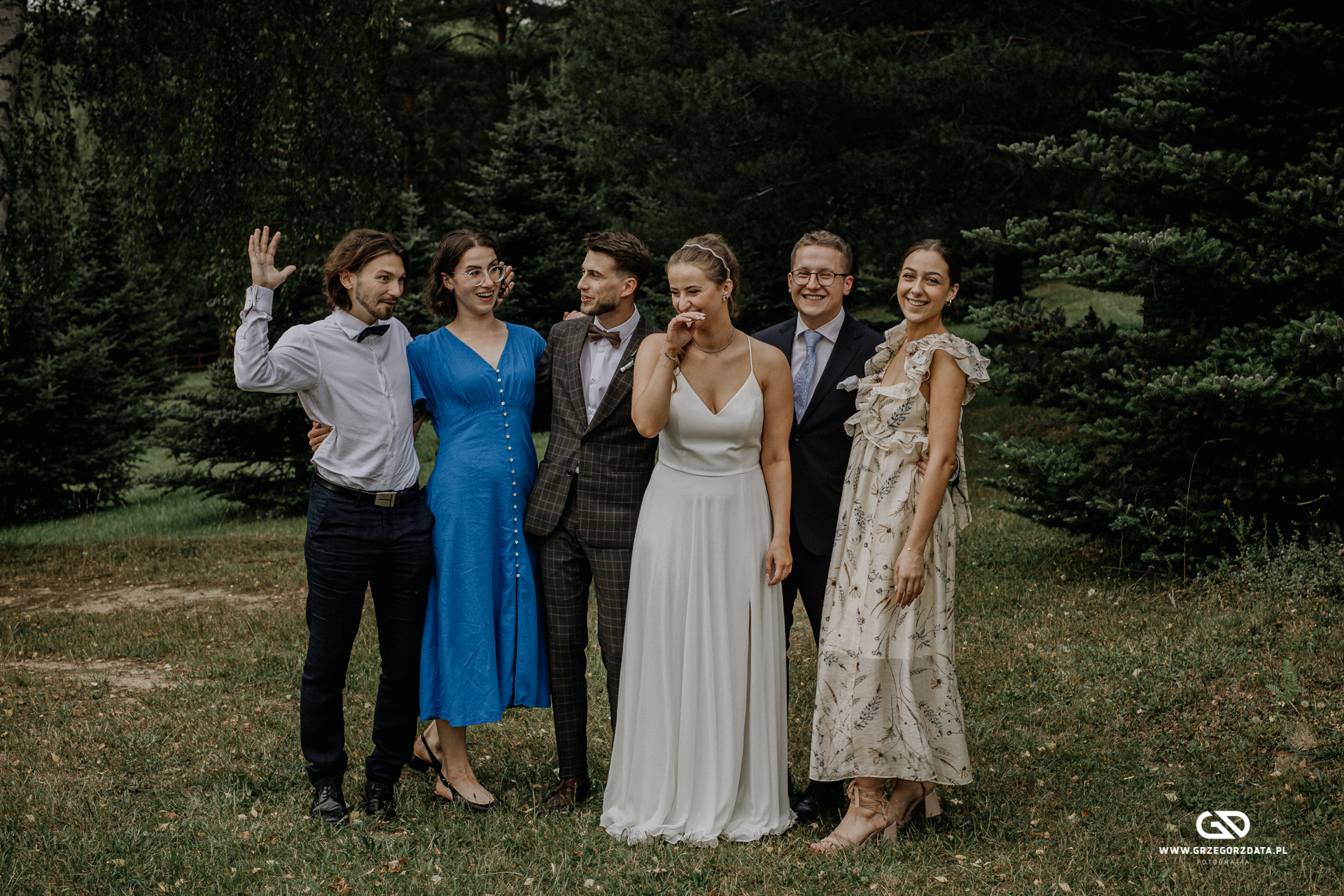 Po ślubie pora na zabawę. Uroczysko dostarczyło luźnej atmosfery – tak potrzebnej na tego typu weselach. Wszystko zgrało się idealnie, a ja dostałem od młodych tak dużą swobodę, że byłem wzruszony. Usłyszałem: “ufamy Ci w stu procentach, rób zdjęcia tak, jak czujesz” i niesionym tymi słowami postawiłem na uwiecznienie magii chwili. Bez nudnych, typowych kadrów, za to m.in. ze zdjęciami grupowymi w pięknym, zielonym otoczeniu w plenerze.