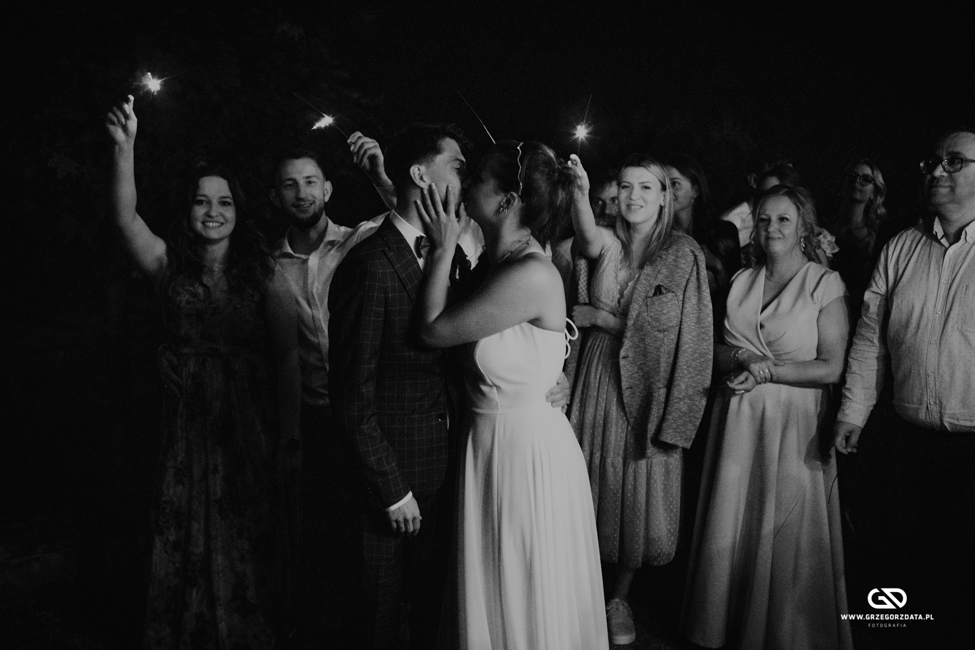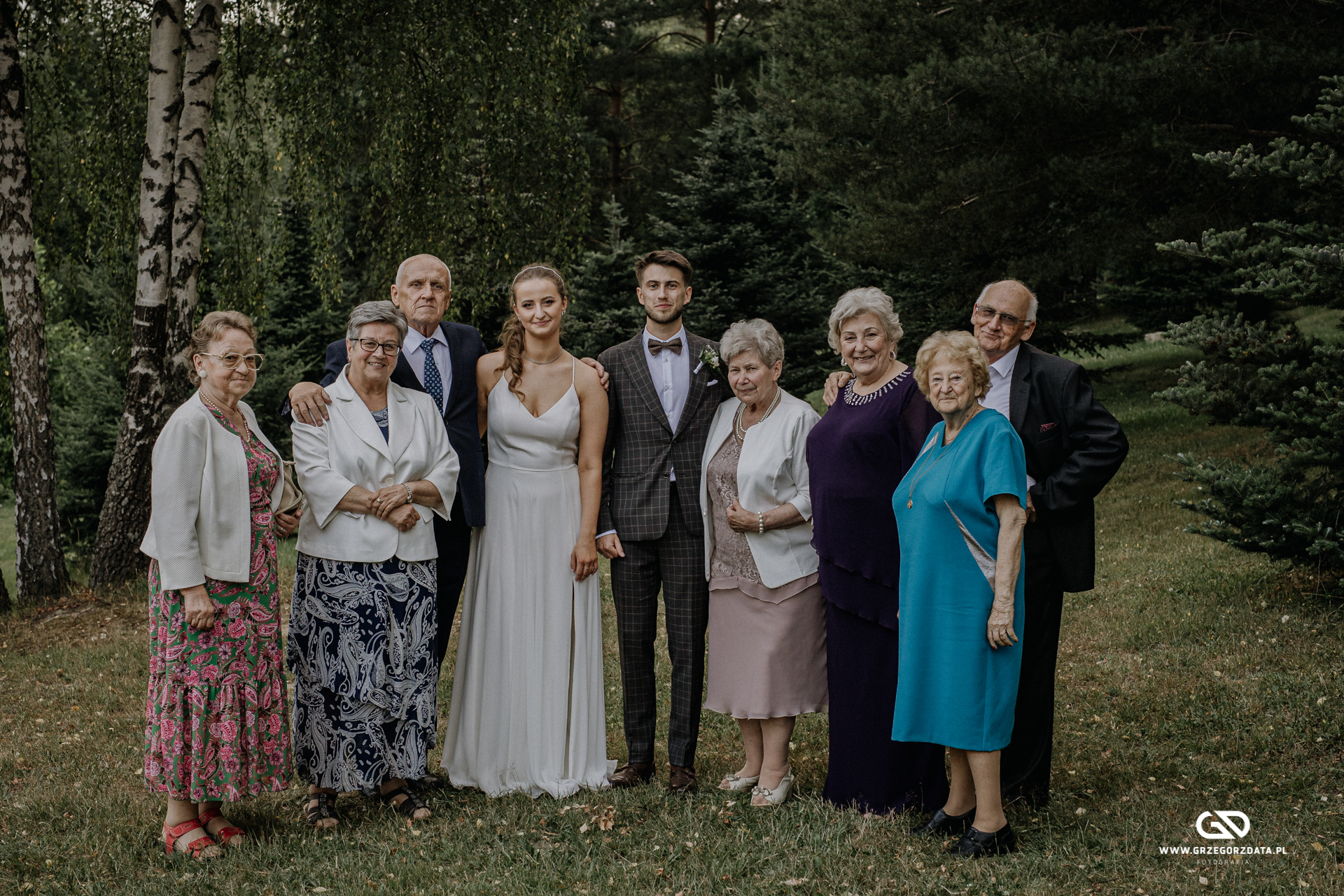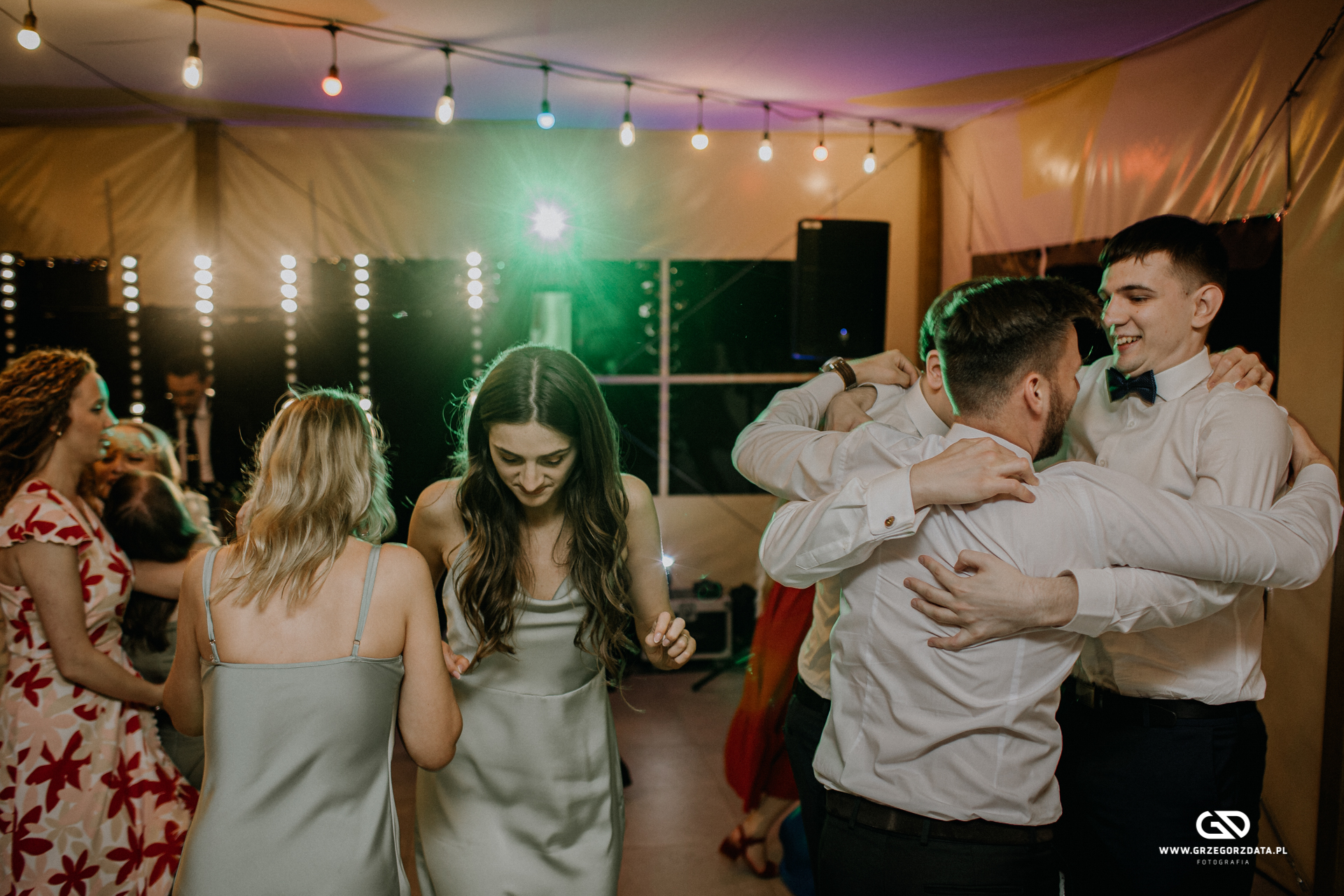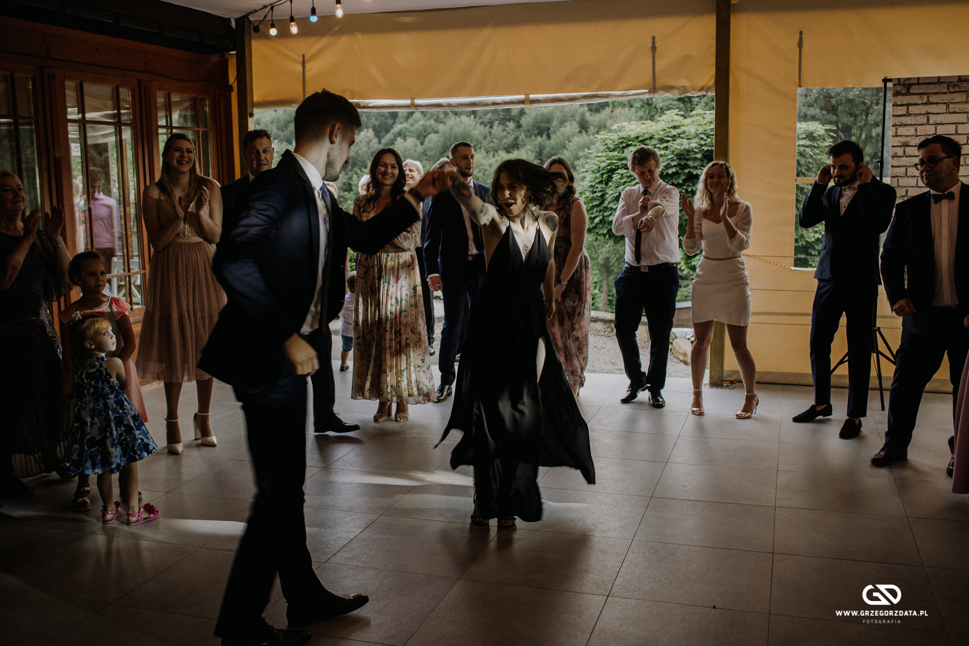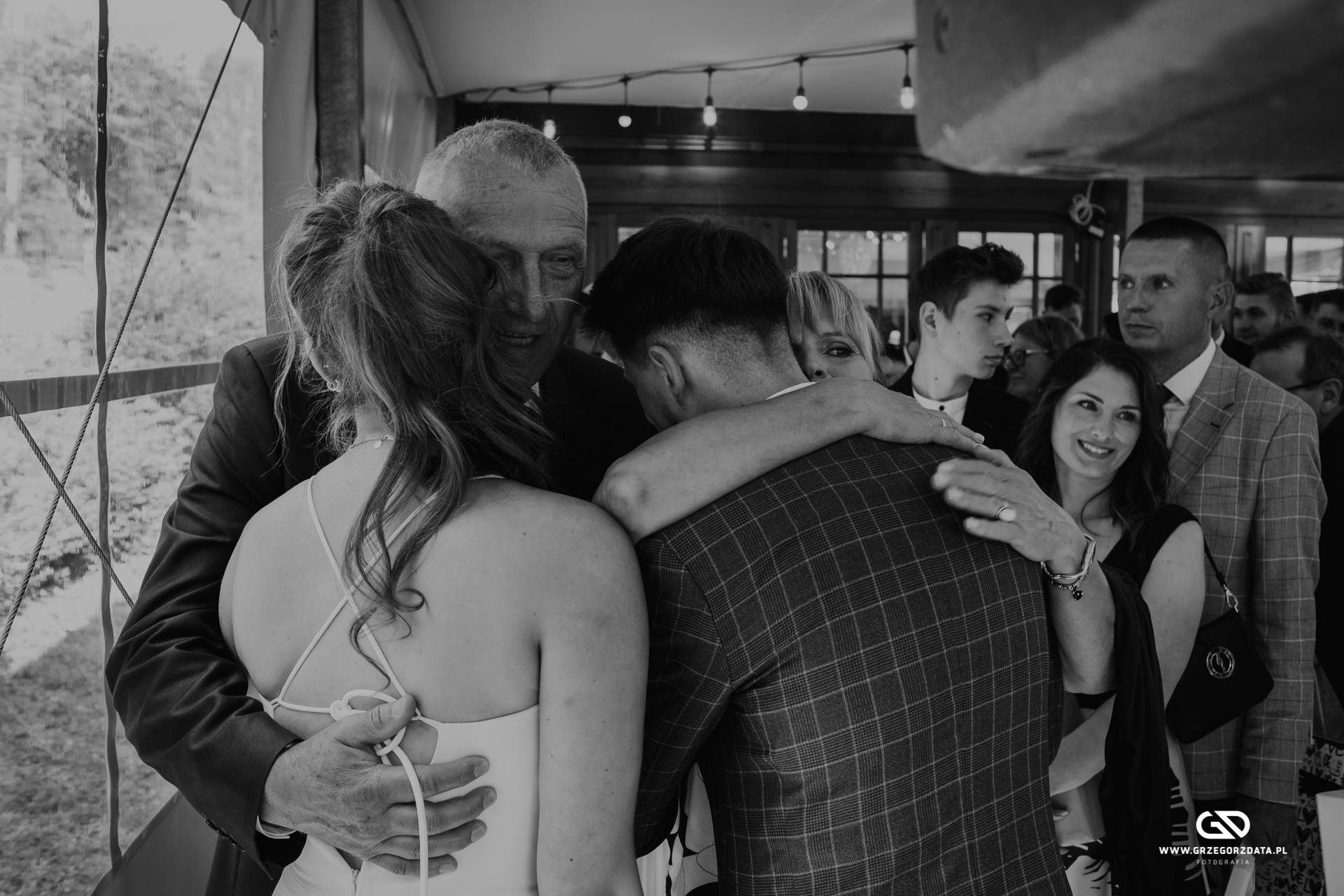Po ślubie pora na zabawę. Uroczysko dostarczyło luźnej atmosfery – tak potrzebnej na tego typu weselach. Wszystko zgrało się idealnie, a ja dostałem od młodych tak dużą swobodę, że byłem wzruszony. Usłyszałem: “ufamy Ci w stu procentach, rób zdjęcia tak, jak czujesz” i niesionym tymi słowami postawiłem na uwiecznienie magii chwili. Bez nudnych, typowych kadrów, za to m.in. ze zdjęciami grupowymi w pięknym, zielonym otoczeniu w plenerze.