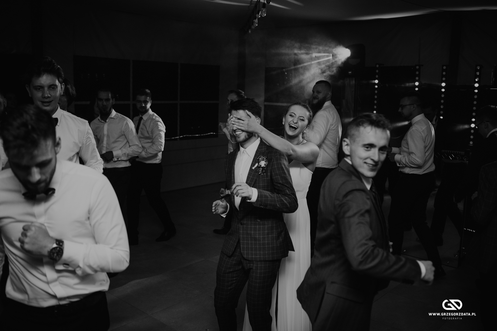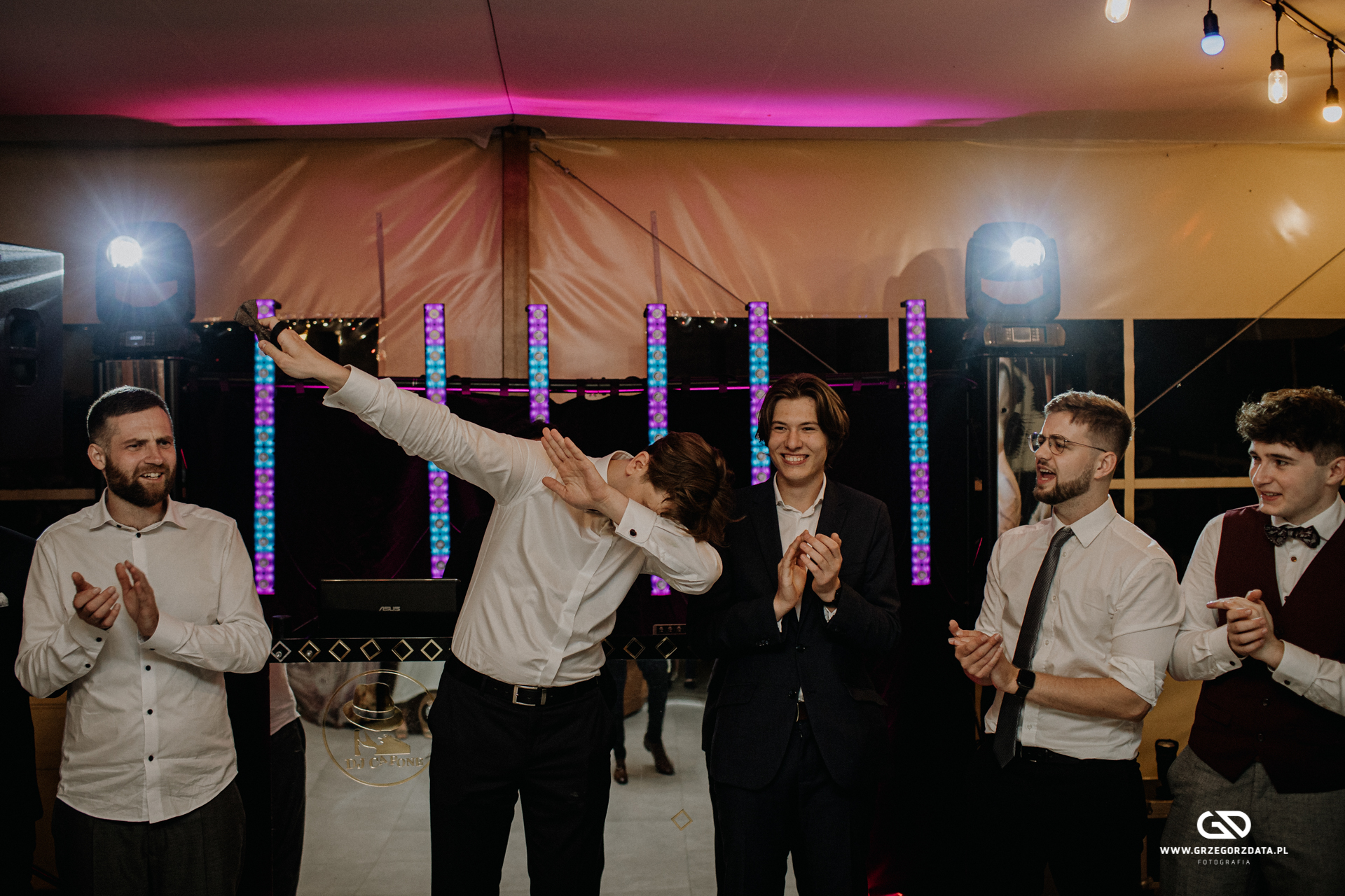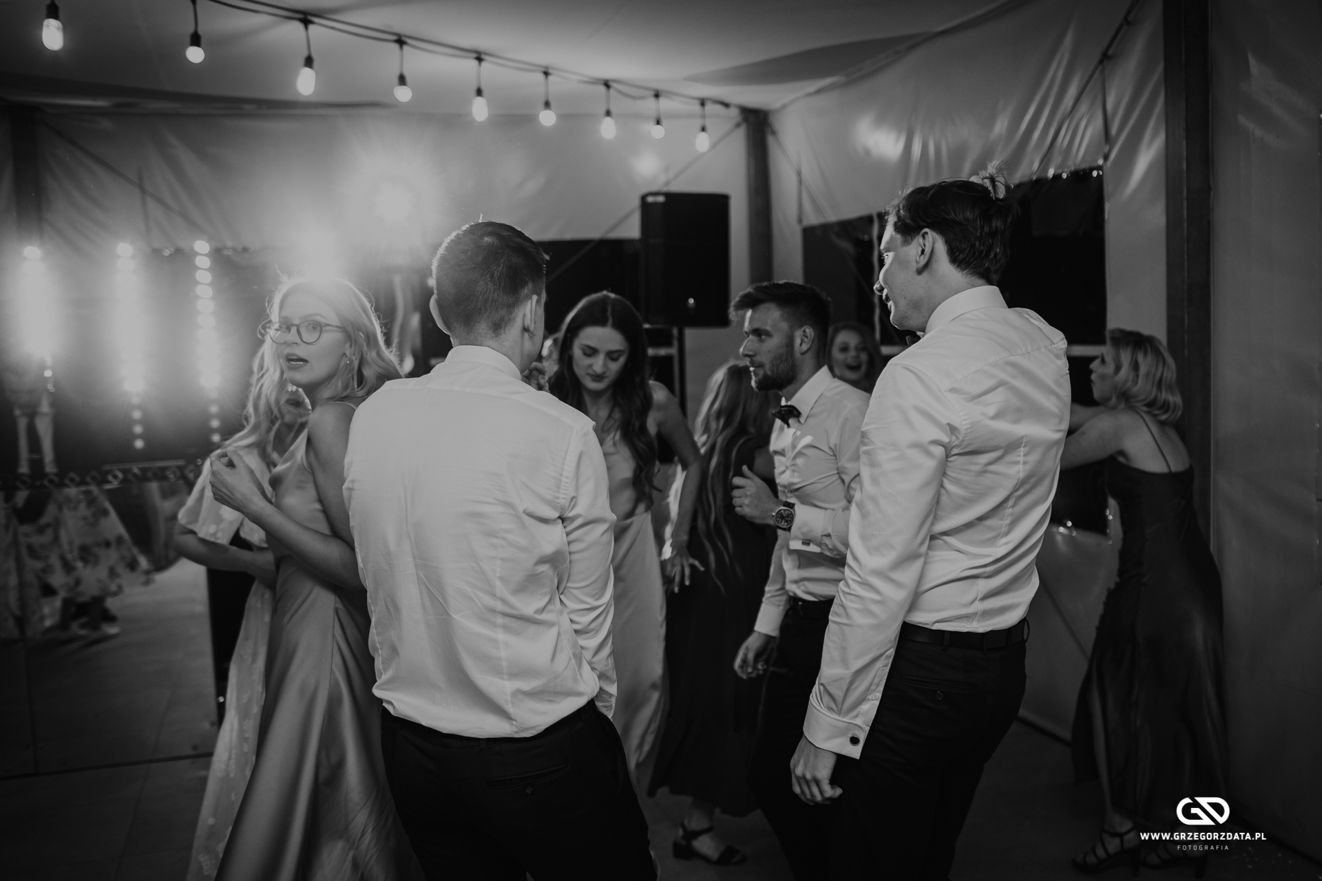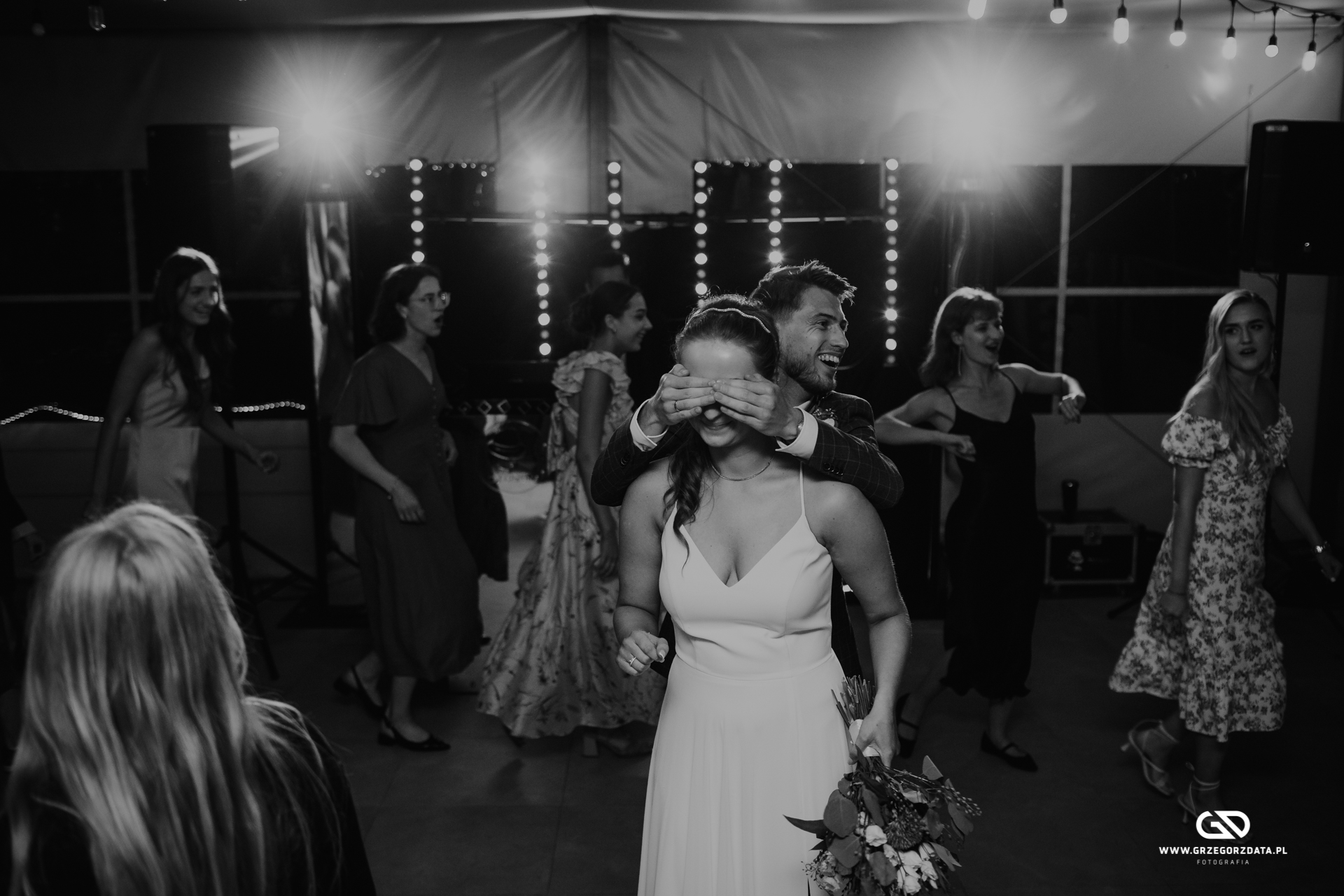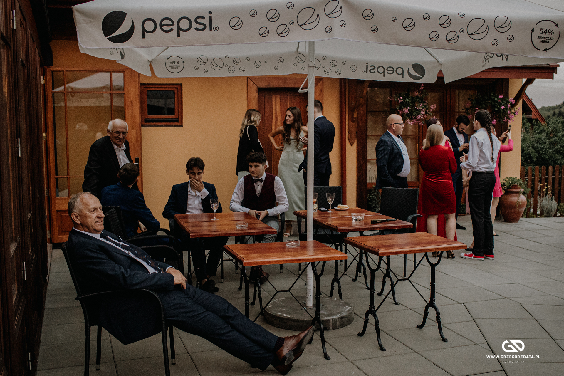 Po ślubie pora na zabawę. Uroczysko dostarczyło luźnej atmosfery – tak potrzebnej na tego typu weselach. Wszystko zgrało się idealnie, a ja dostałem od młodych tak dużą swobodę, że byłem wzruszony. Usłyszałem: “ufamy Ci w stu procentach, rób zdjęcia tak, jak czujesz” i niesionym tymi słowami postawiłem na uwiecznienie magii chwili. Bez nudnych, typowych kadrów, za to m.in. ze zdjęciami grupowymi w pięknym, zielonym otoczeniu w plenerze.