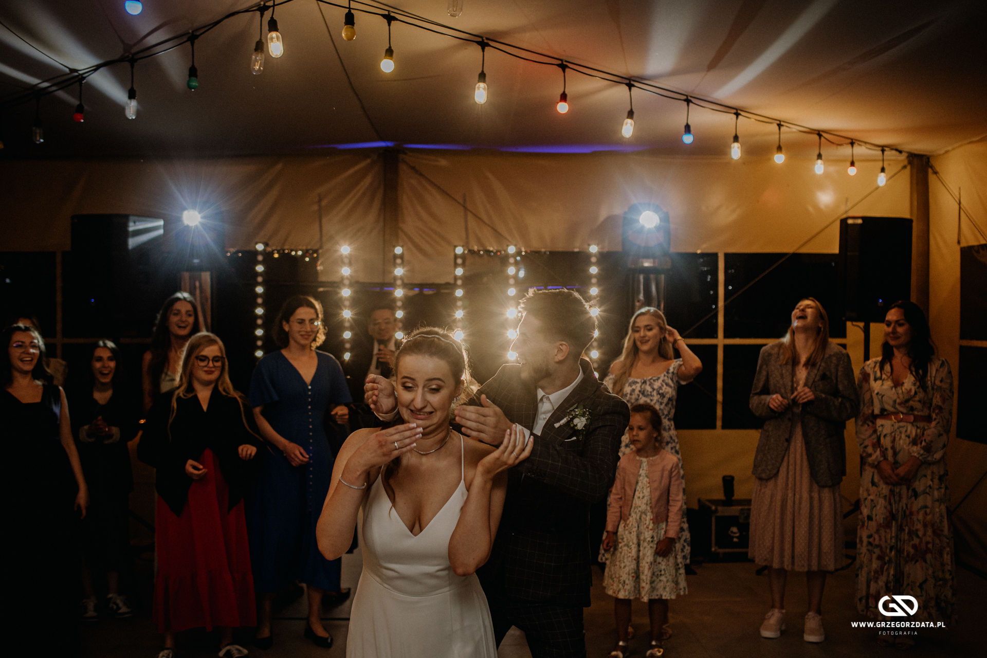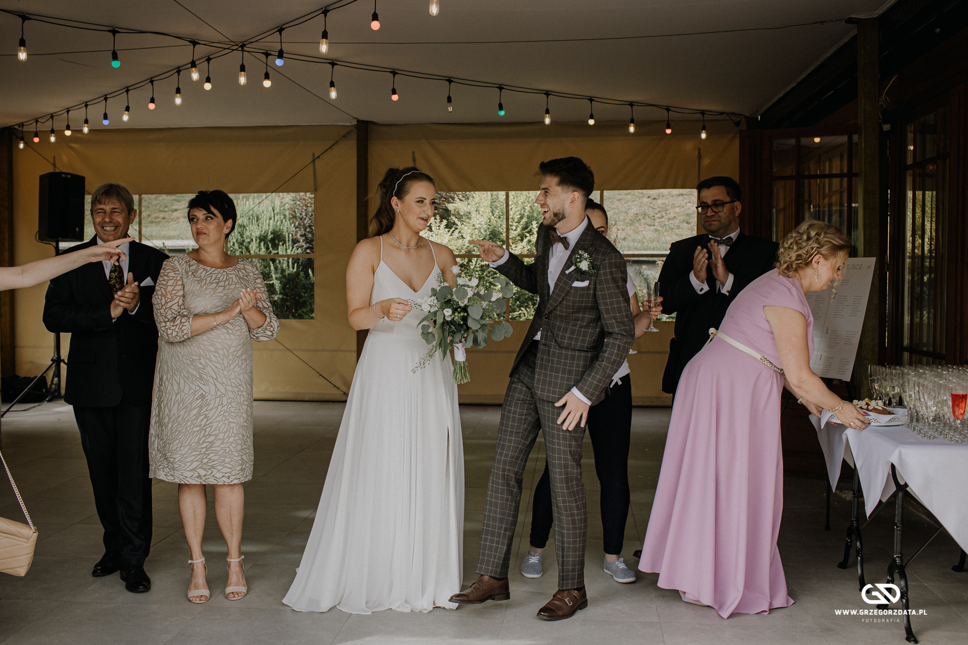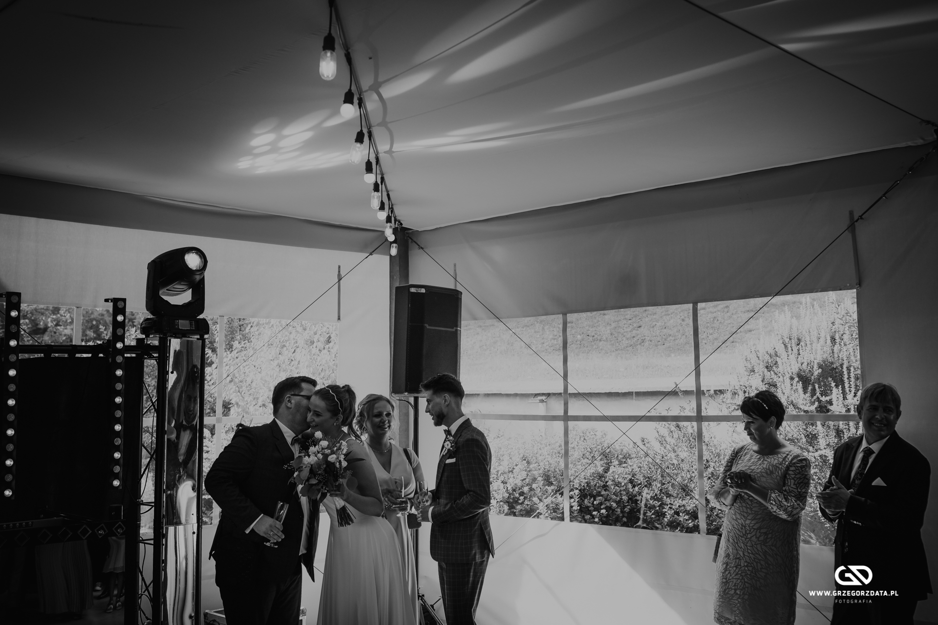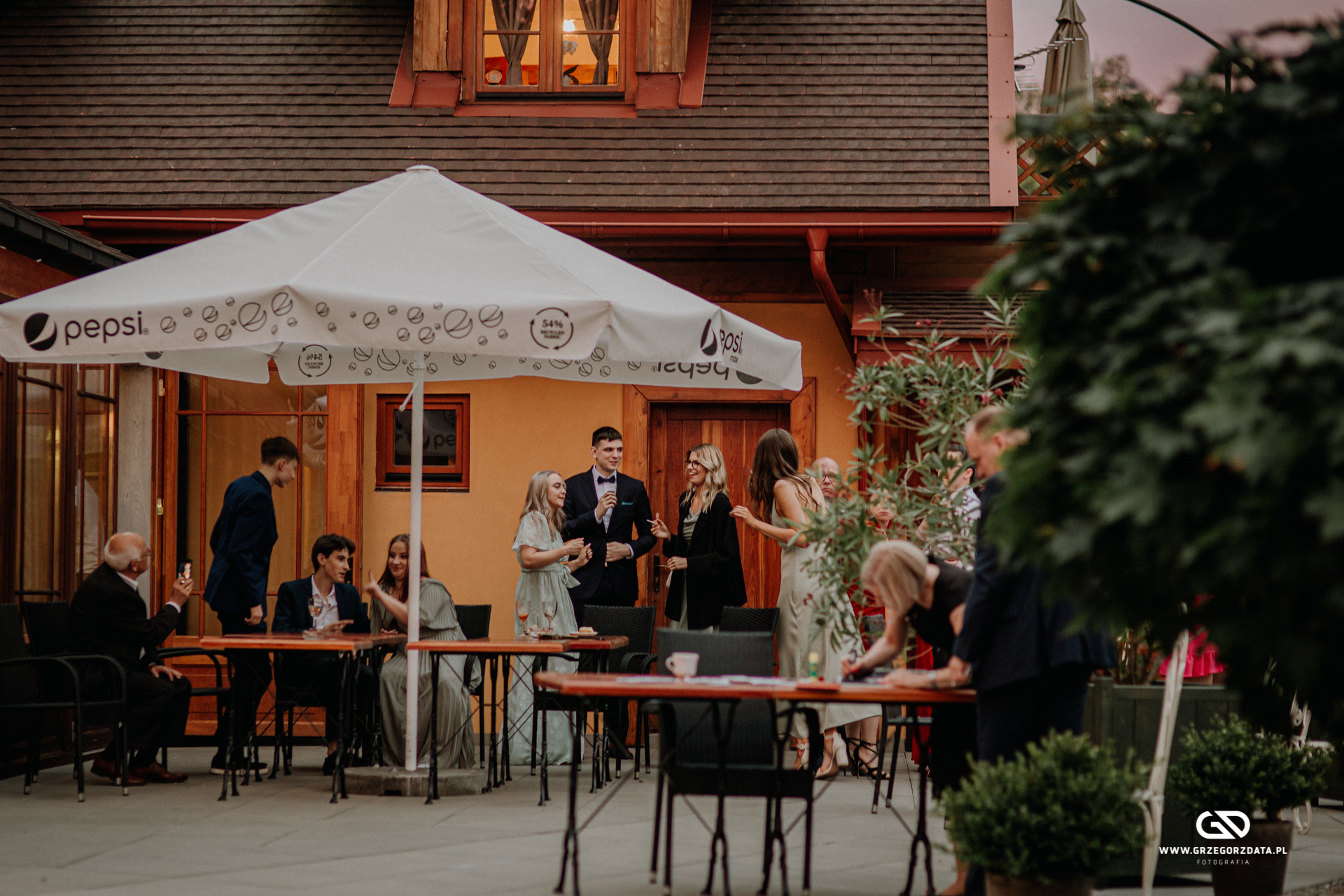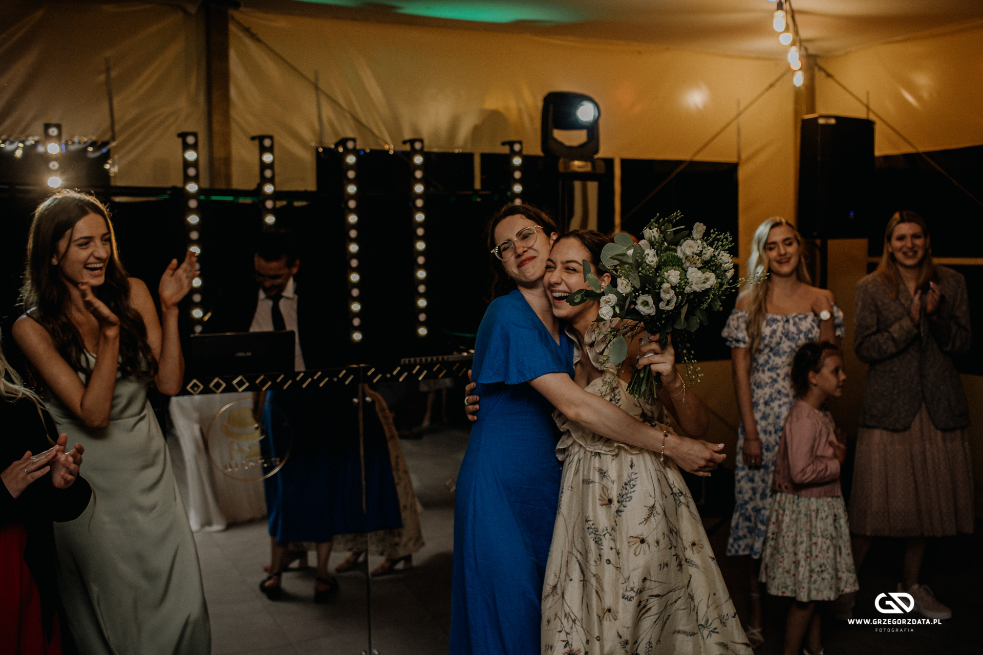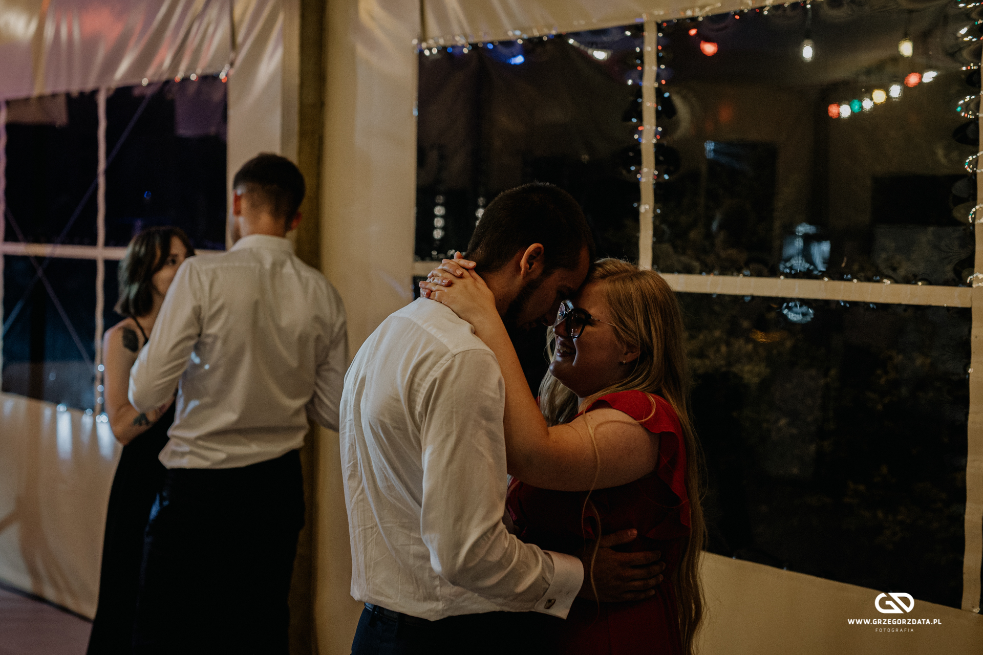 Po ślubie pora na zabawę. Uroczysko dostarczyło luźnej atmosfery – tak potrzebnej na tego typu weselach. Wszystko zgrało się idealnie, a ja dostałem od młodych tak dużą swobodę, że byłem wzruszony. Usłyszałem: “ufamy Ci w stu procentach, rób zdjęcia tak, jak czujesz” i niesionym tymi słowami postawiłem na uwiecznienie magii chwili. Bez nudnych, typowych kadrów, za to m.in. ze zdjęciami grupowymi w pięknym, zielonym otoczeniu w plenerze.