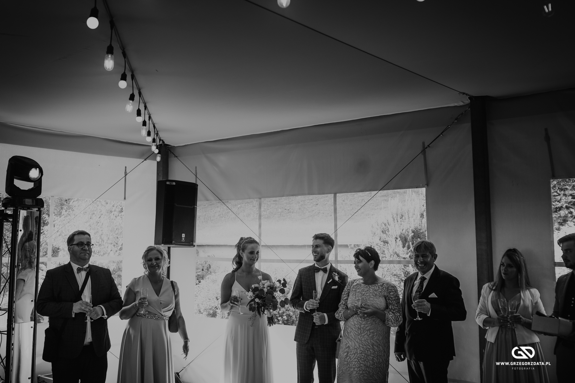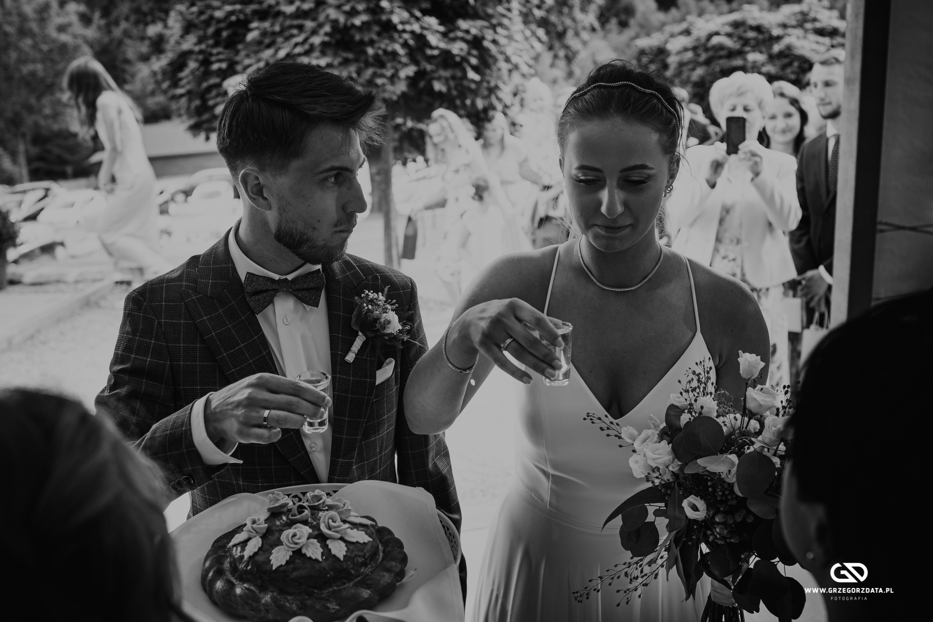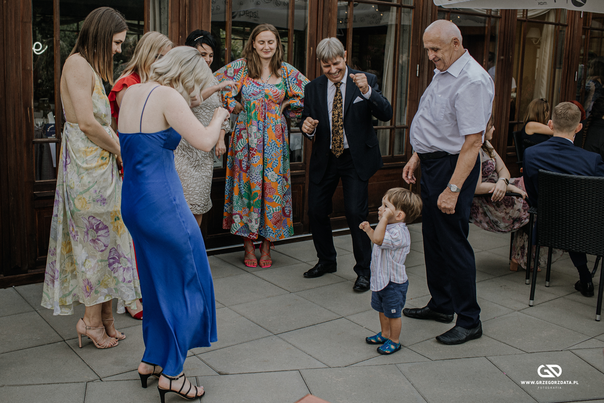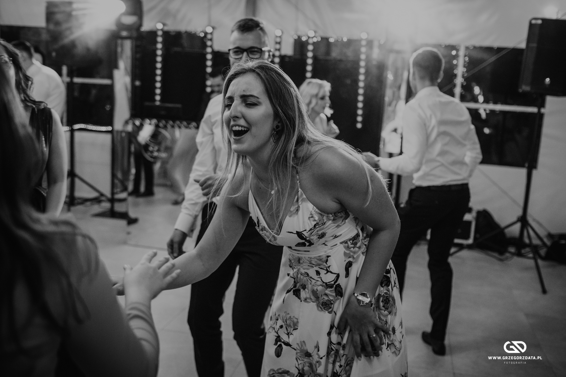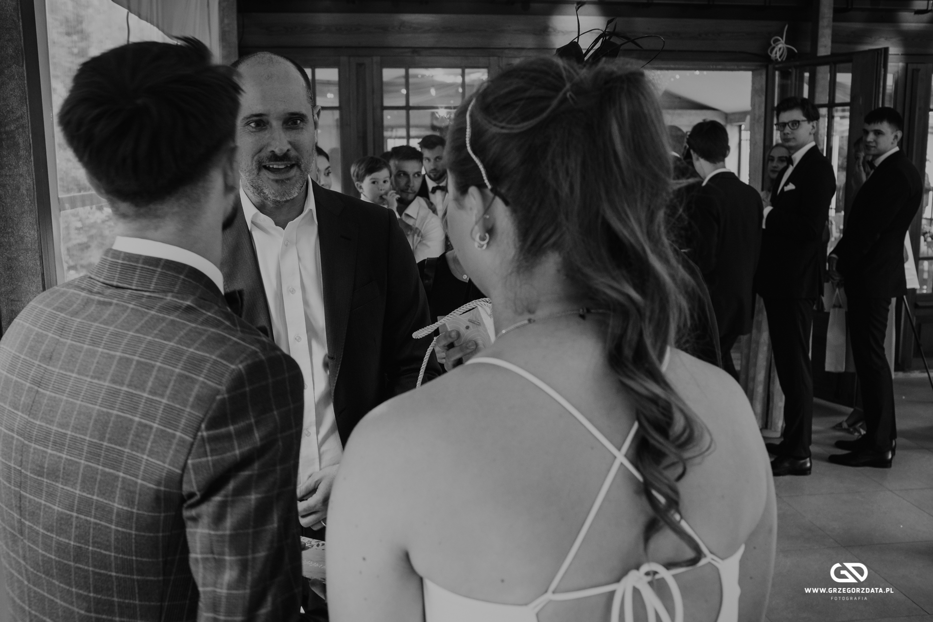 Po ślubie pora na zabawę. Uroczysko dostarczyło luźnej atmosfery – tak potrzebnej na tego typu weselach. Wszystko zgrało się idealnie, a ja dostałem od młodych tak dużą swobodę, że byłem wzruszony. Usłyszałem: “ufamy Ci w stu procentach, rób zdjęcia tak, jak czujesz” i niesionym tymi słowami postawiłem na uwiecznienie magii chwili. Bez nudnych, typowych kadrów, za to m.in. ze zdjęciami grupowymi w pięknym, zielonym otoczeniu w plenerze.