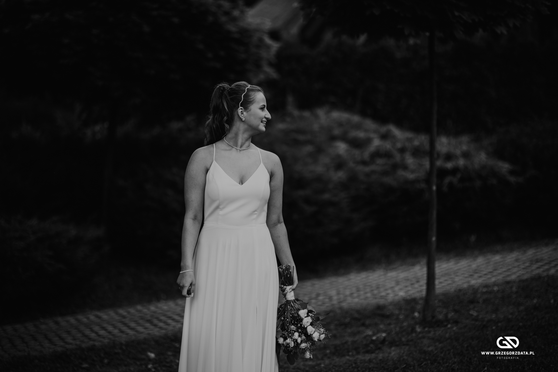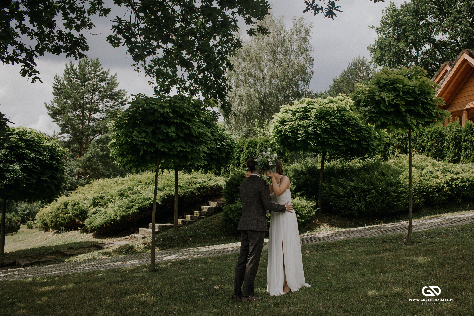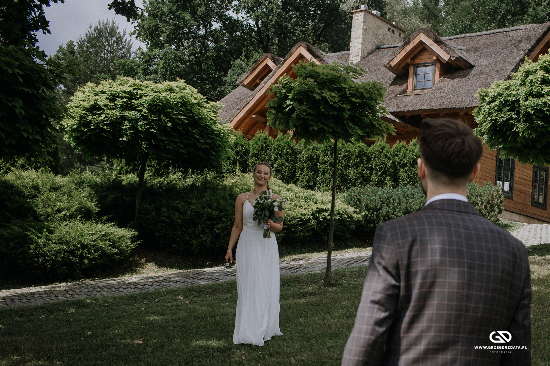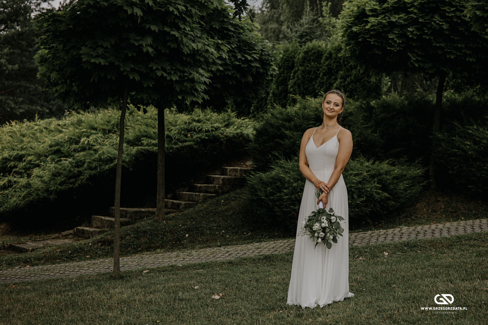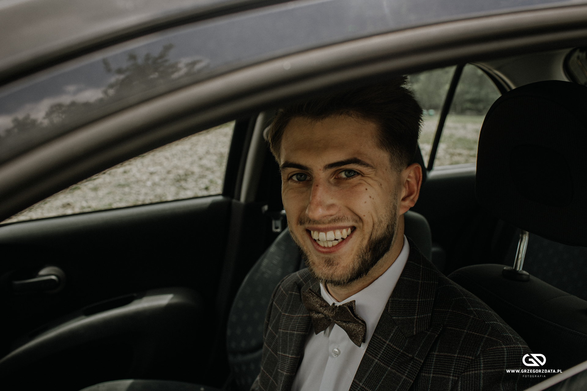 Młodzi spotkali się chwilę wcześniej, w Uroczysku, gdzie później świętowaliśmy. Tzw. First look miał miejsce w otoczeniu zieleni, pod kilkusetletnim dębem. Bez kamer, świadków, niepotrzebnego tej chwili blichtru. Było intymnie, a więc i szczególnie prawdziwie. Starałem się nie wchodzić w ten moment, a jedynie być jego niezauważalnym rejestratorem.