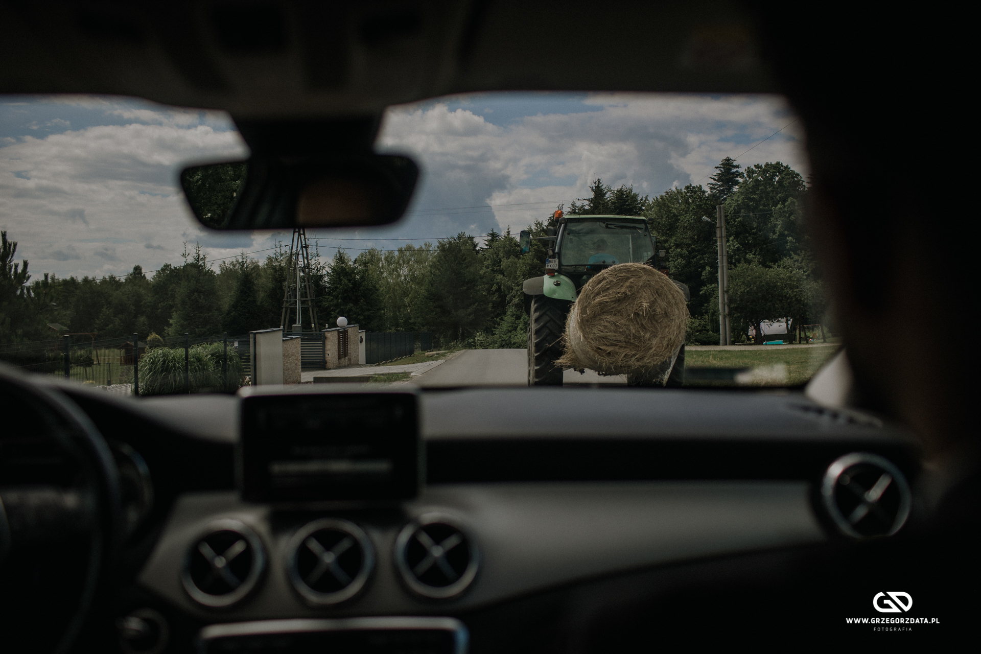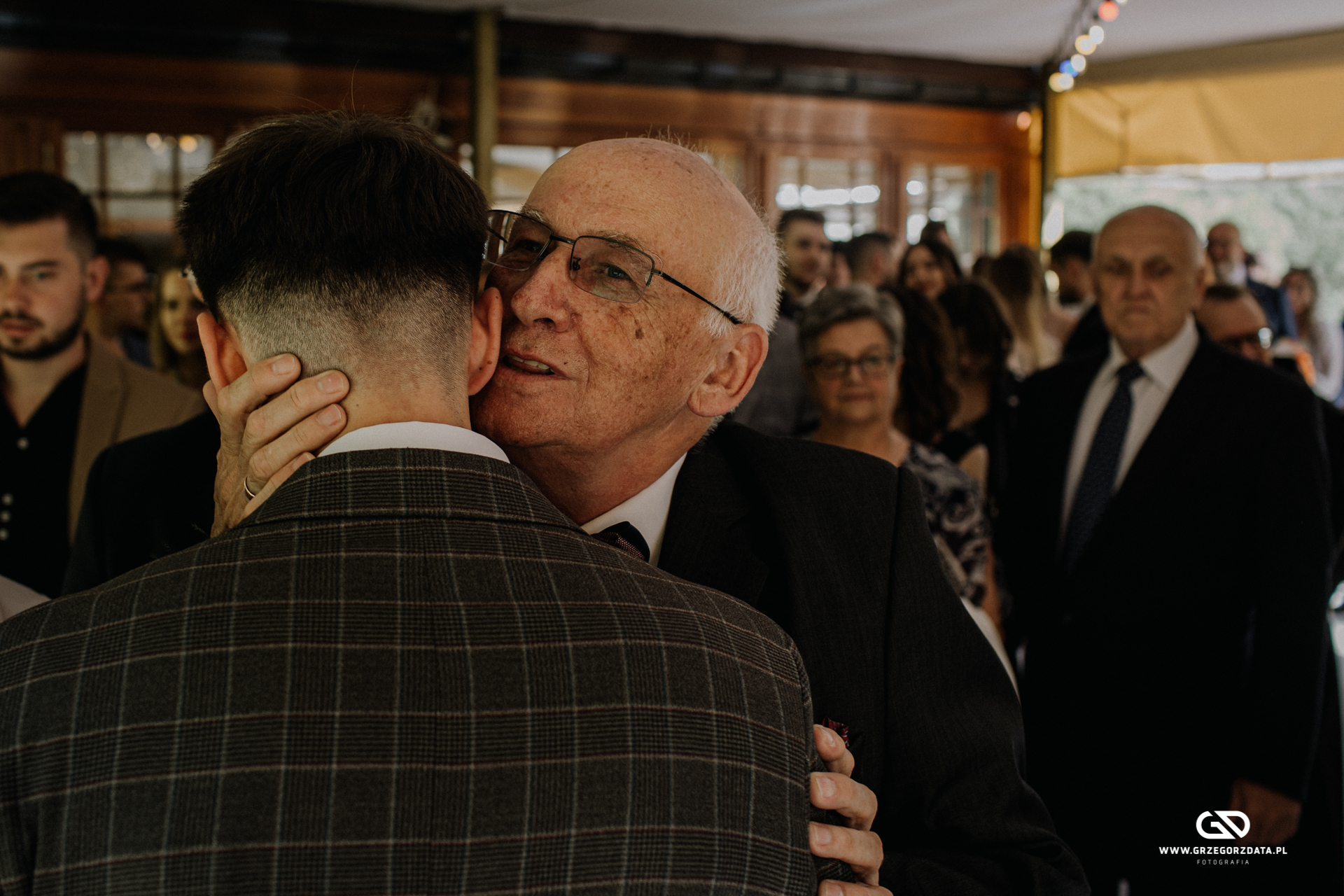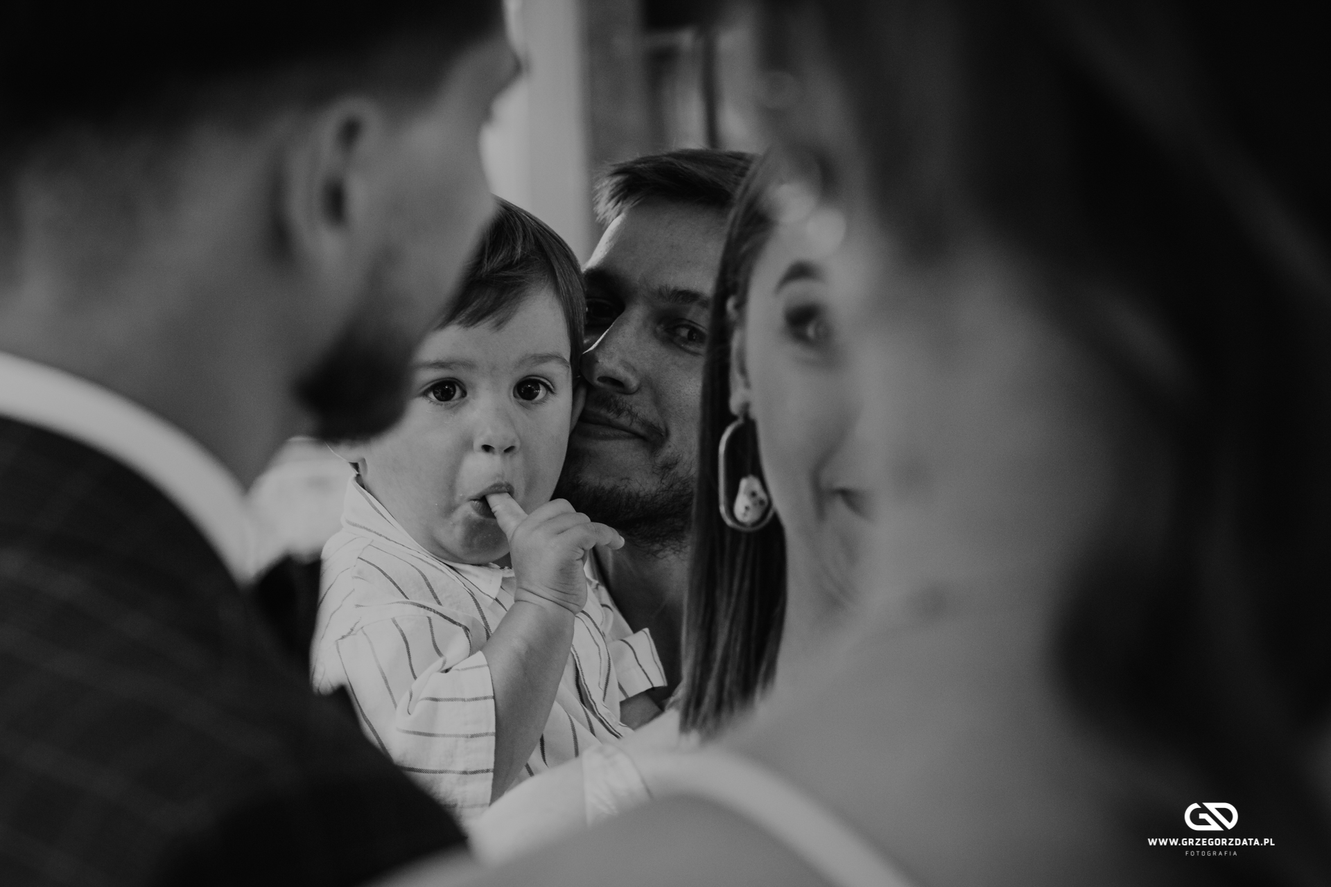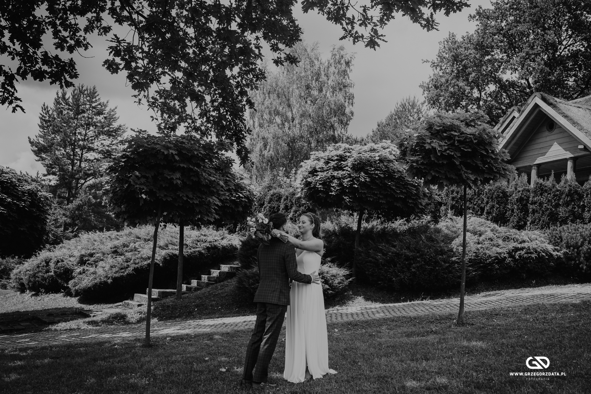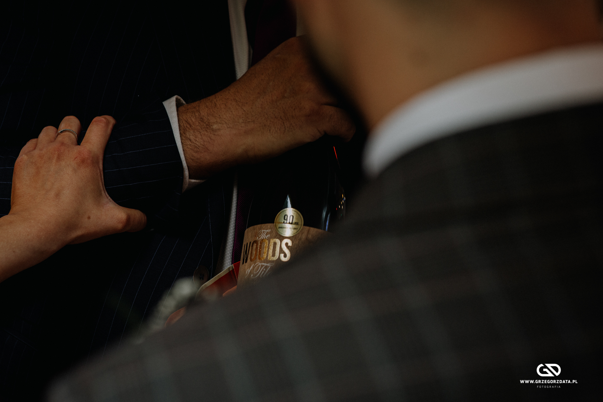 Młodzi spotkali się chwilę wcześniej, w Uroczysku, gdzie później świętowaliśmy. Tzw. First look miał miejsce w otoczeniu zieleni, pod kilkusetletnim dębem. Bez kamer, świadków, niepotrzebnego tej chwili blichtru. Było intymnie, a więc i szczególnie prawdziwie. Starałem się nie wchodzić w ten moment, a jedynie być jego niezauważalnym rejestratorem.