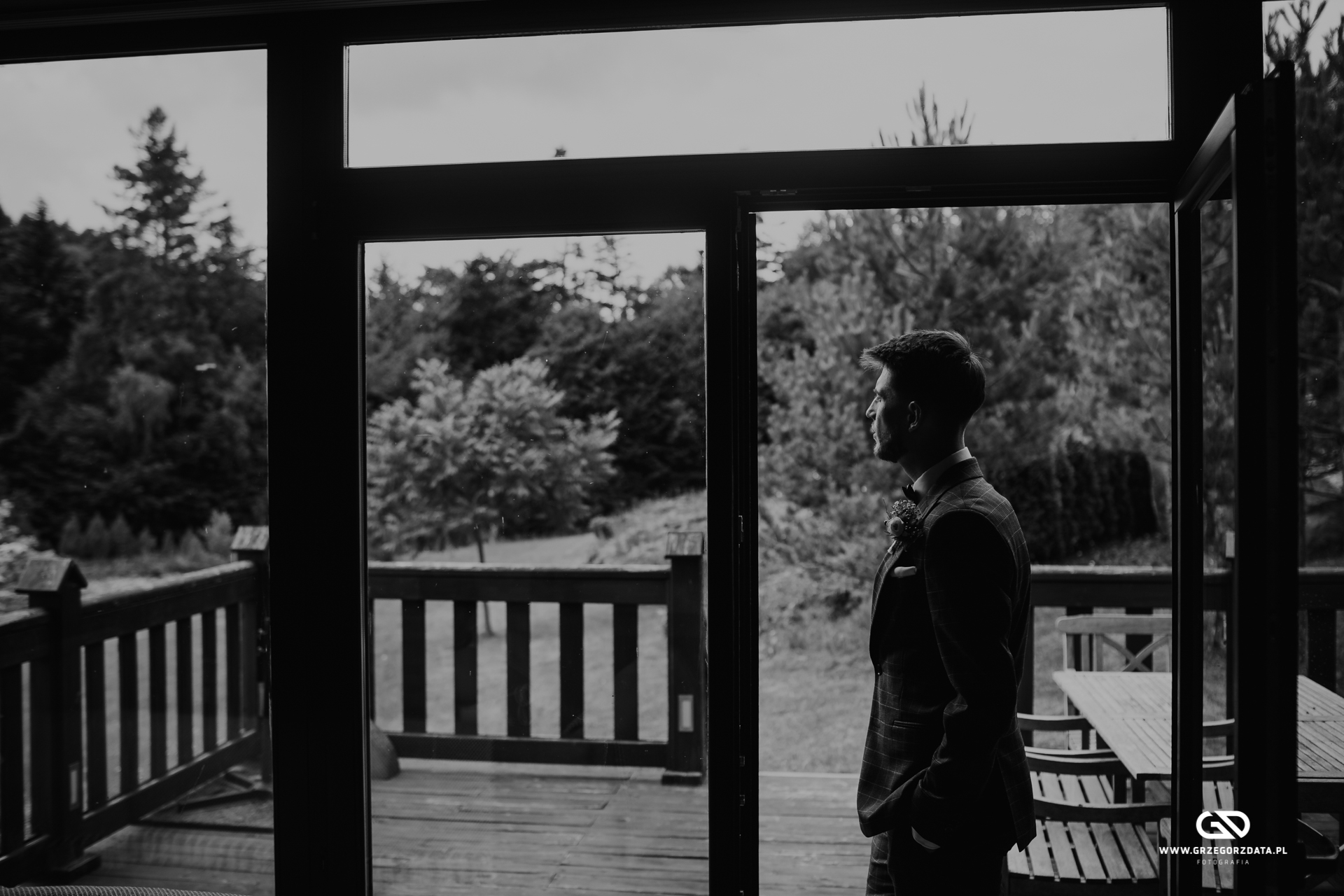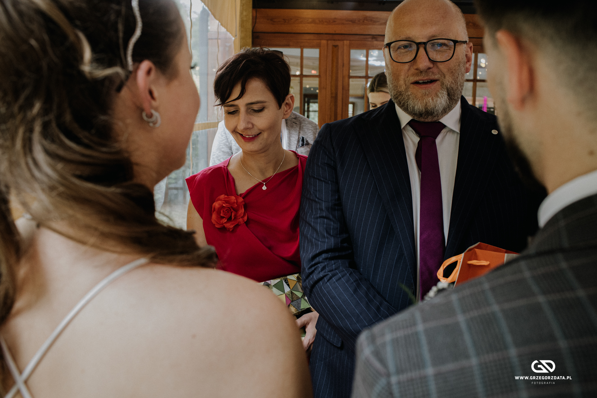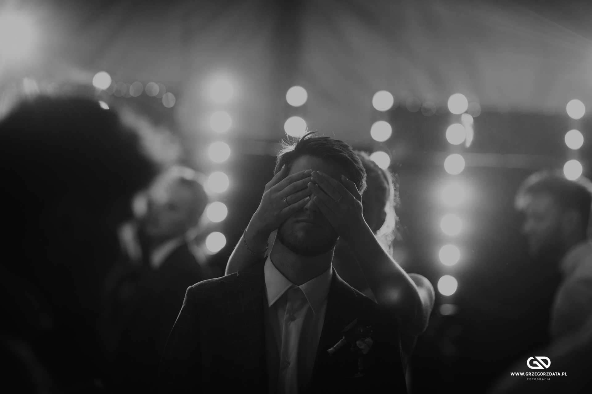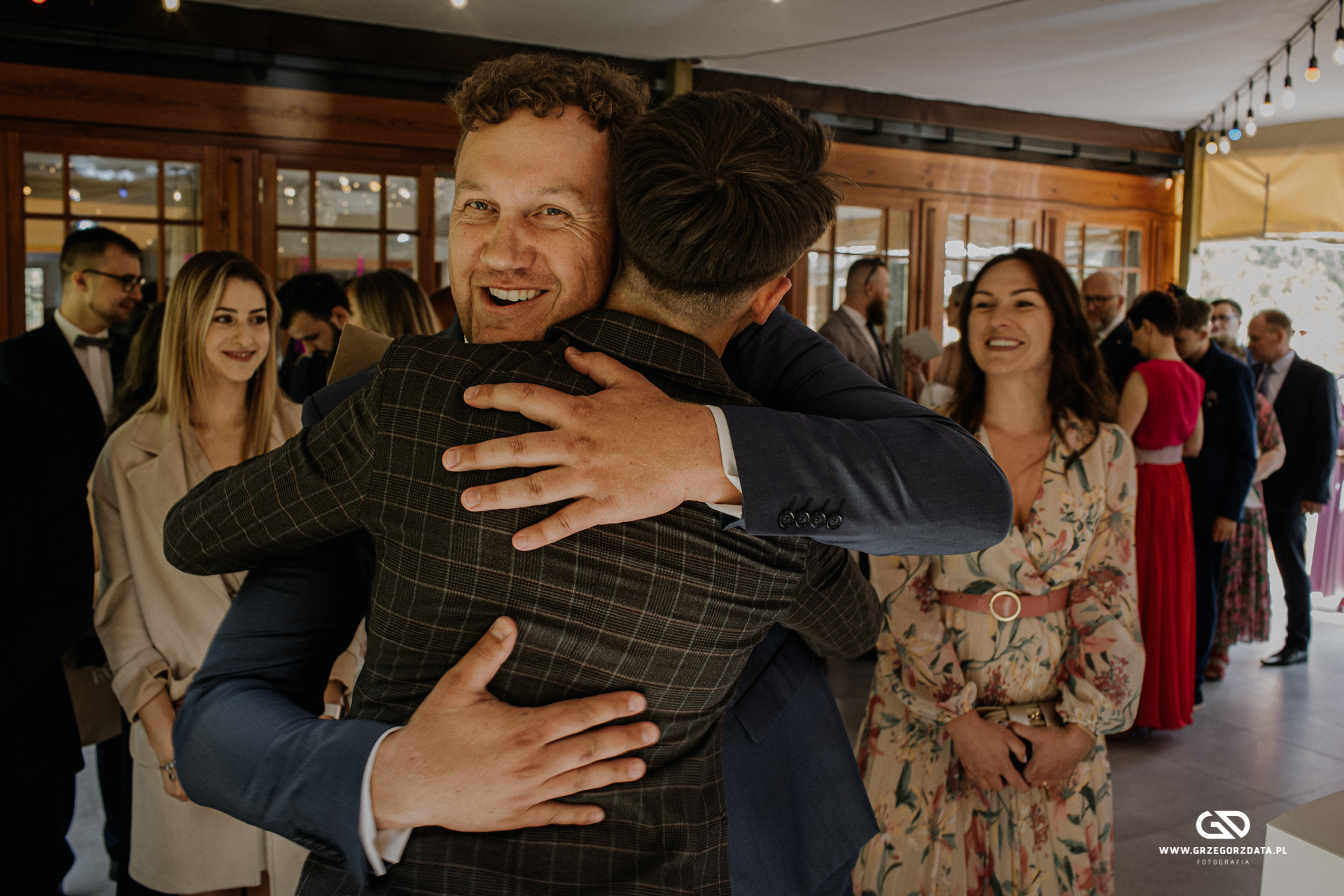 Młodzi spotkali się chwilę wcześniej, w Uroczysku, gdzie później świętowaliśmy. Tzw. First look miał miejsce w otoczeniu zieleni, pod kilkusetletnim dębem. Bez kamer, świadków, niepotrzebnego tej chwili blichtru. Było intymnie, a więc i szczególnie prawdziwie. Starałem się nie wchodzić w ten moment, a jedynie być jego niezauważalnym rejestratorem.