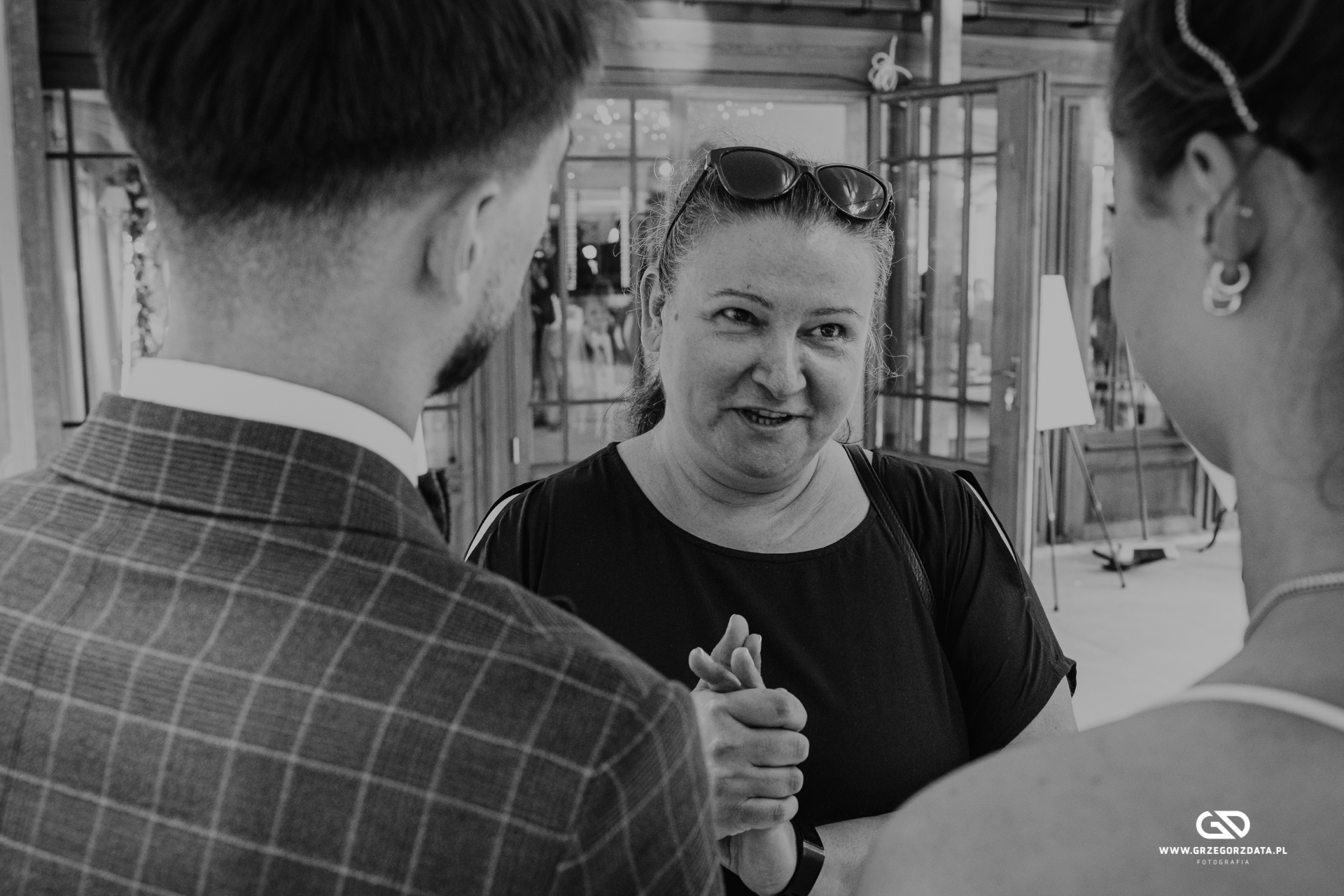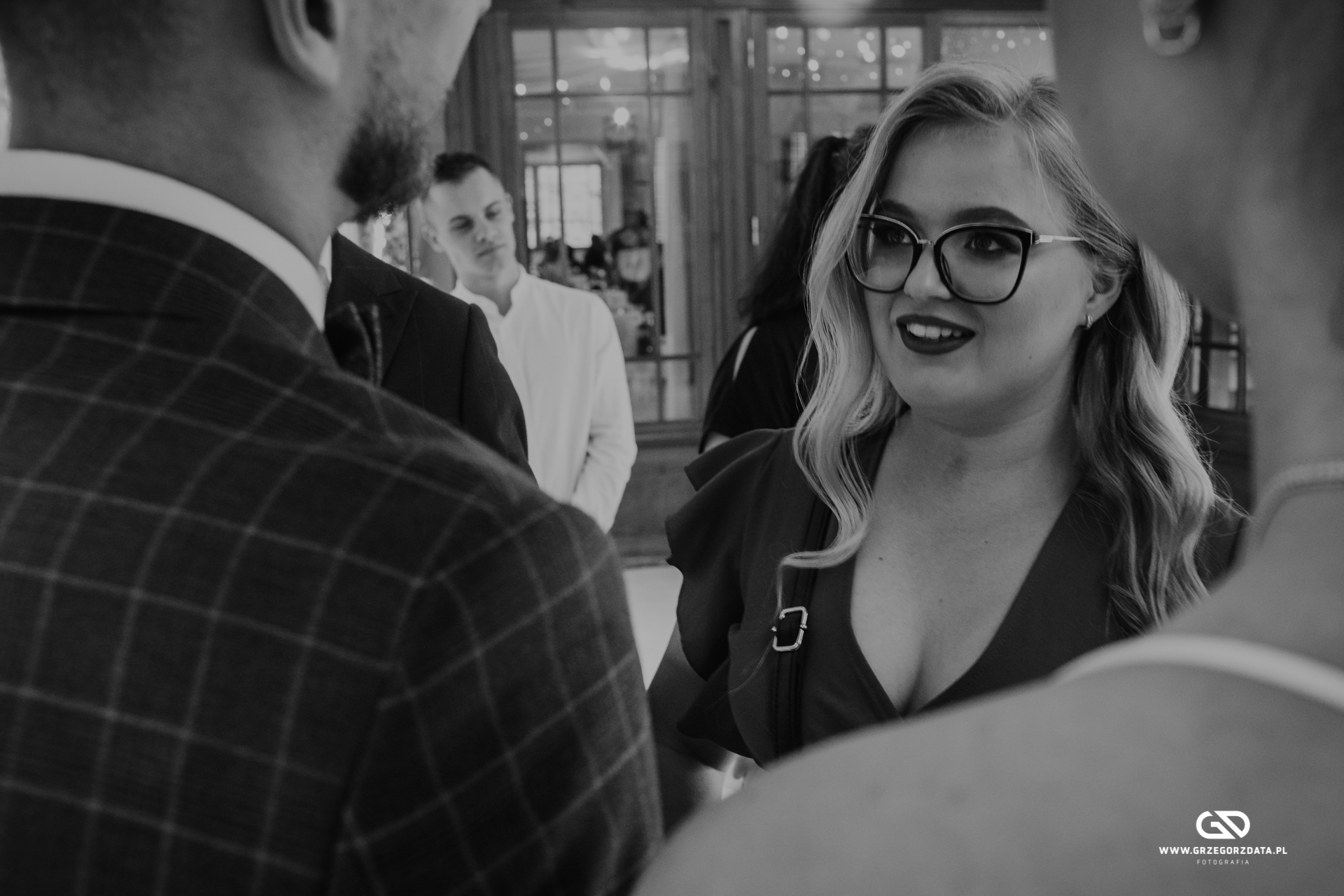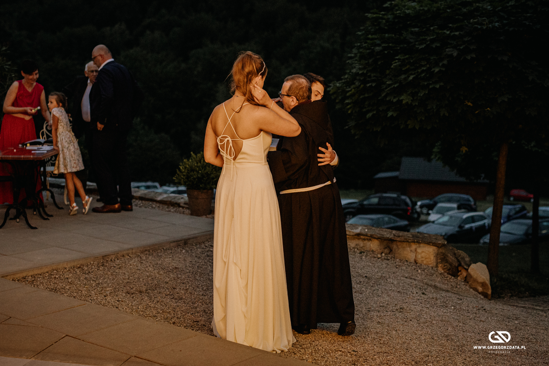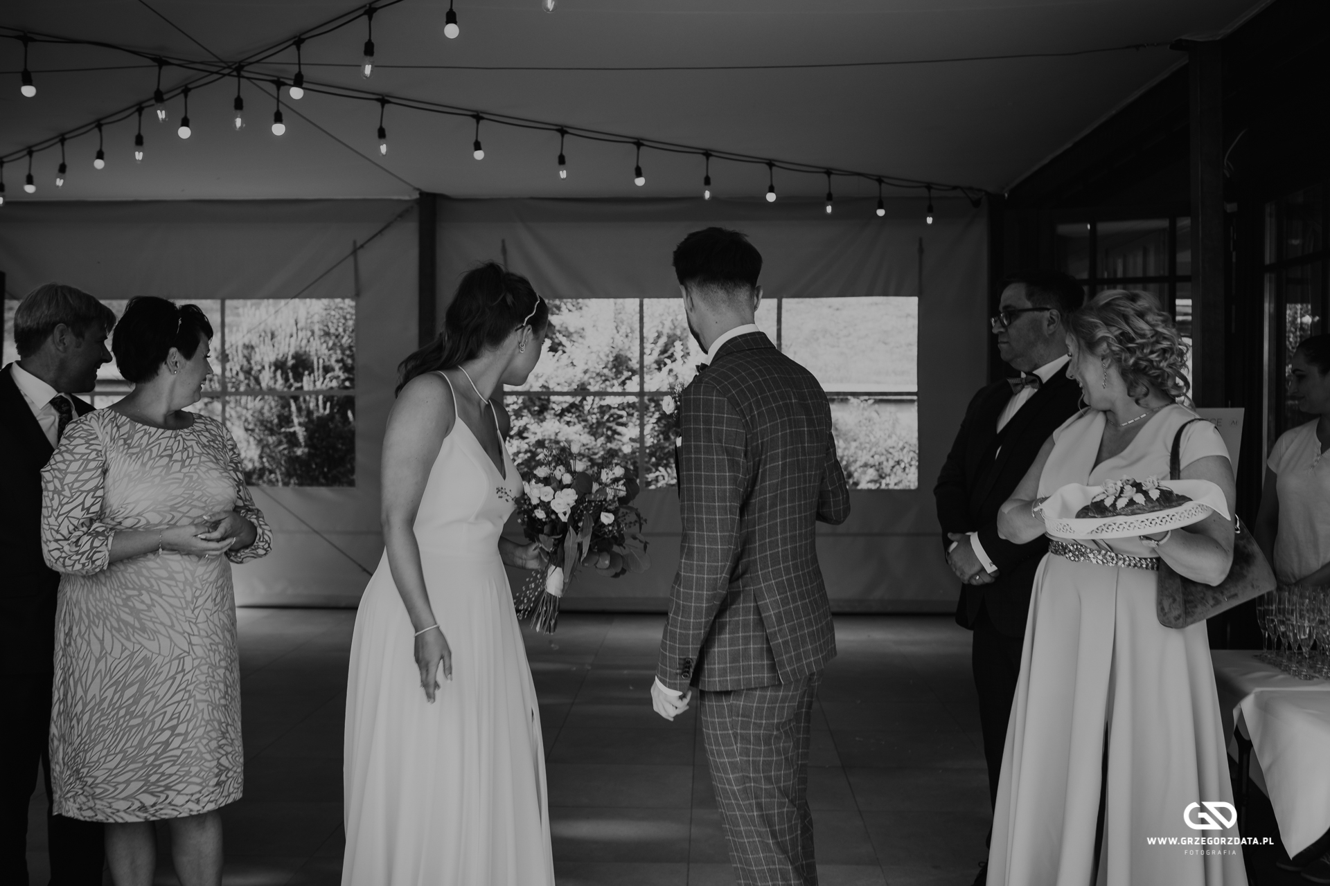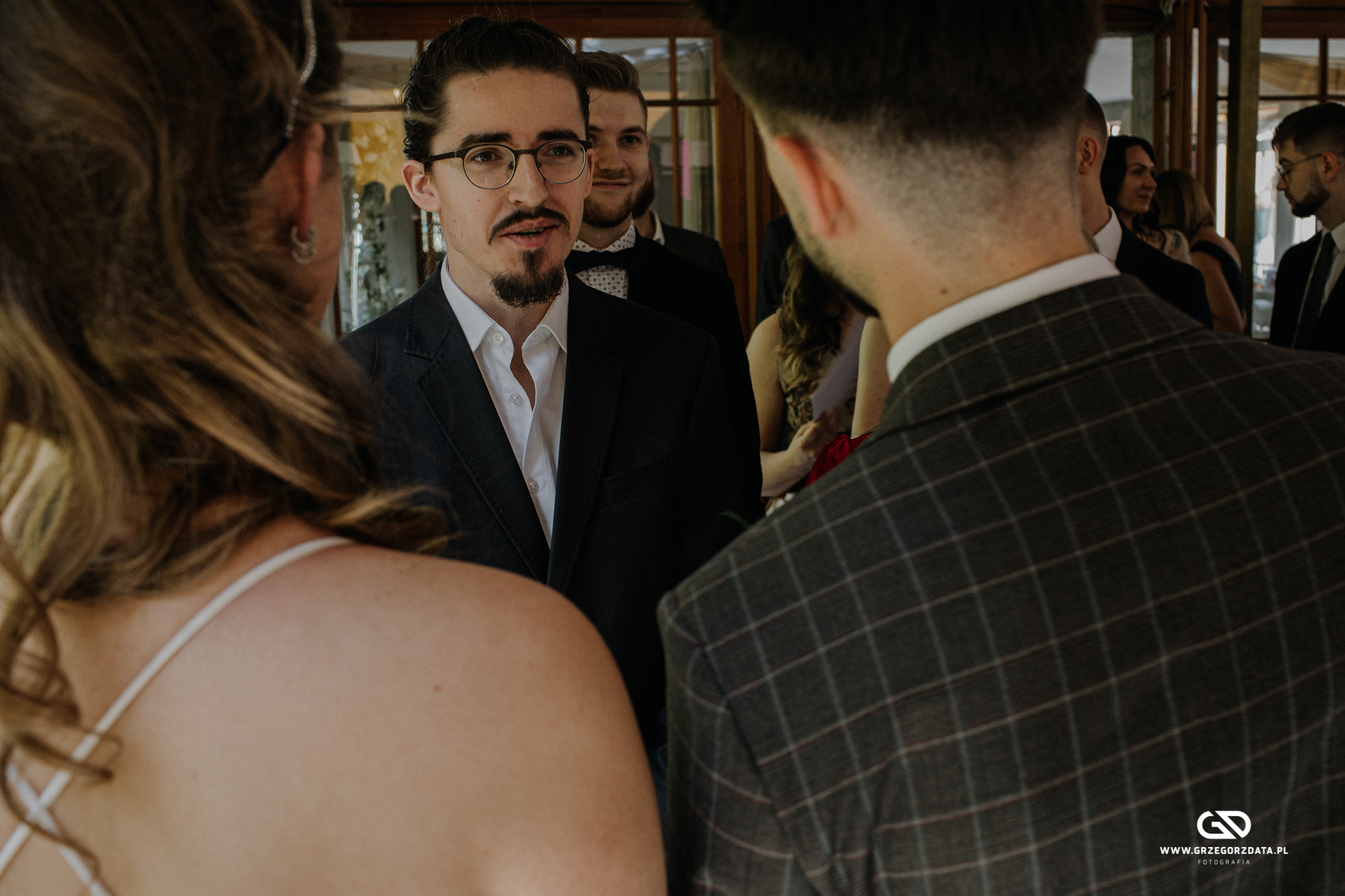 Młodzi spotkali się chwilę wcześniej, w Uroczysku, gdzie później świętowaliśmy. Tzw. First look miał miejsce w otoczeniu zieleni, pod kilkusetletnim dębem. Bez kamer, świadków, niepotrzebnego tej chwili blichtru. Było intymnie, a więc i szczególnie prawdziwie. Starałem się nie wchodzić w ten moment, a jedynie być jego niezauważalnym rejestratorem.