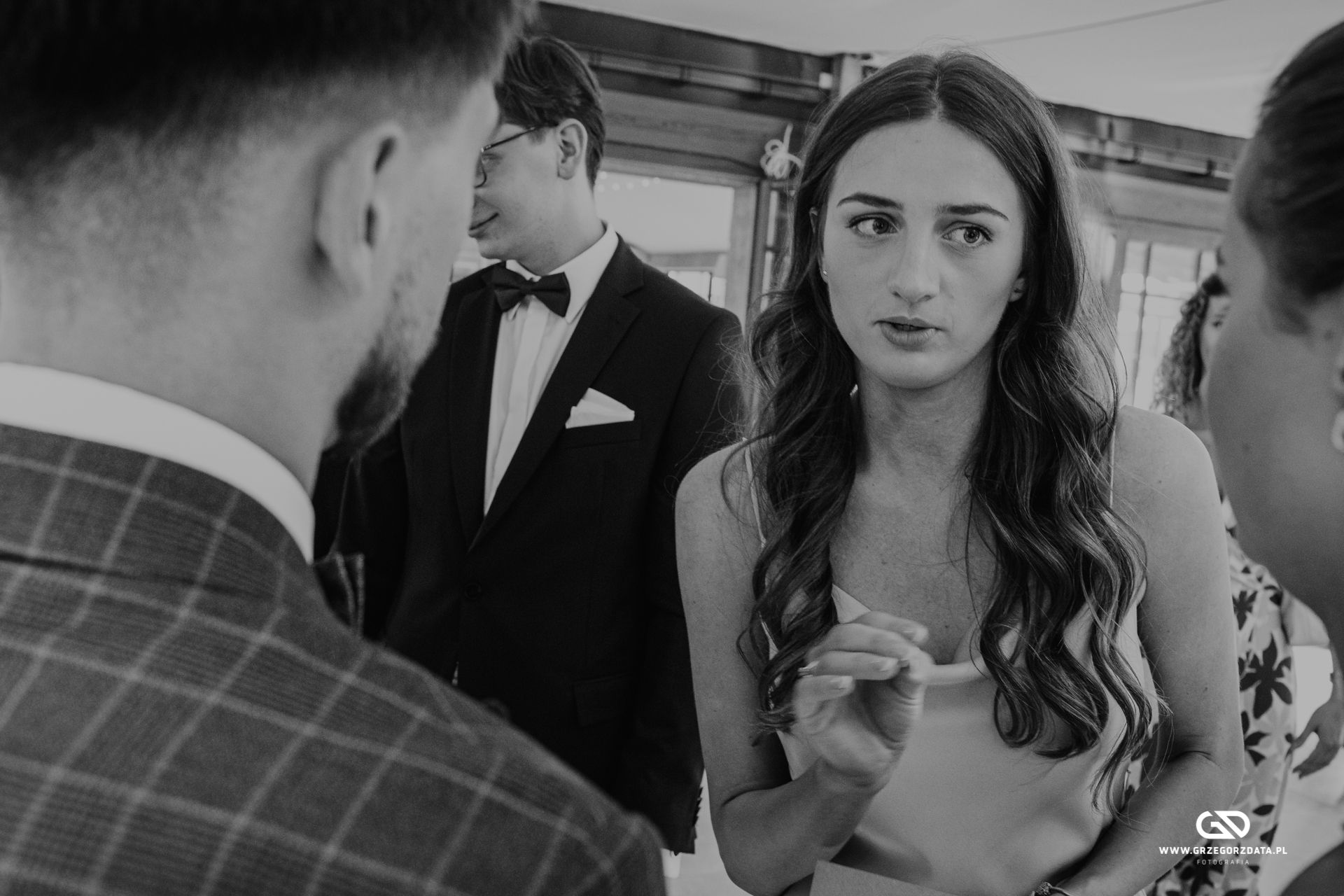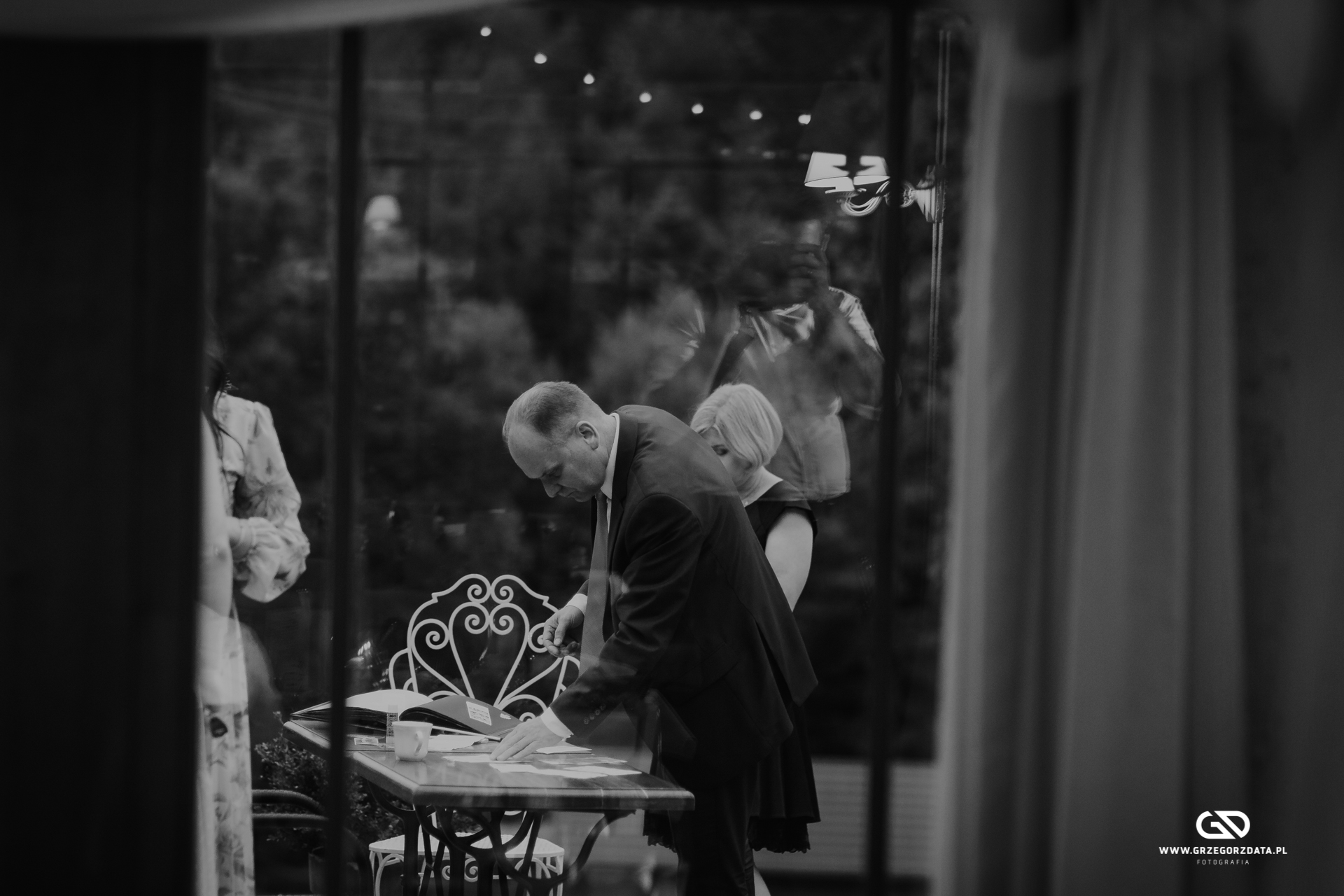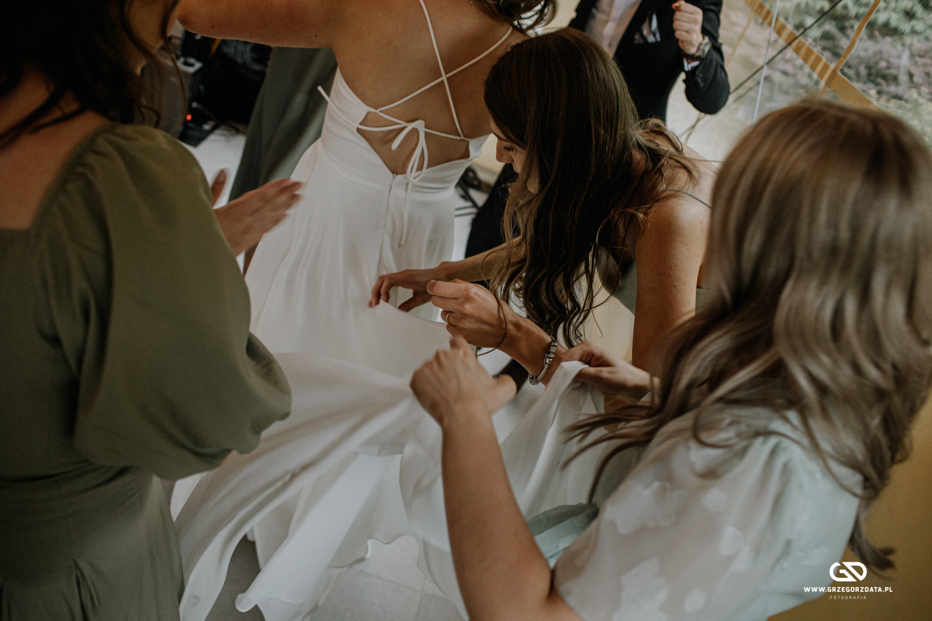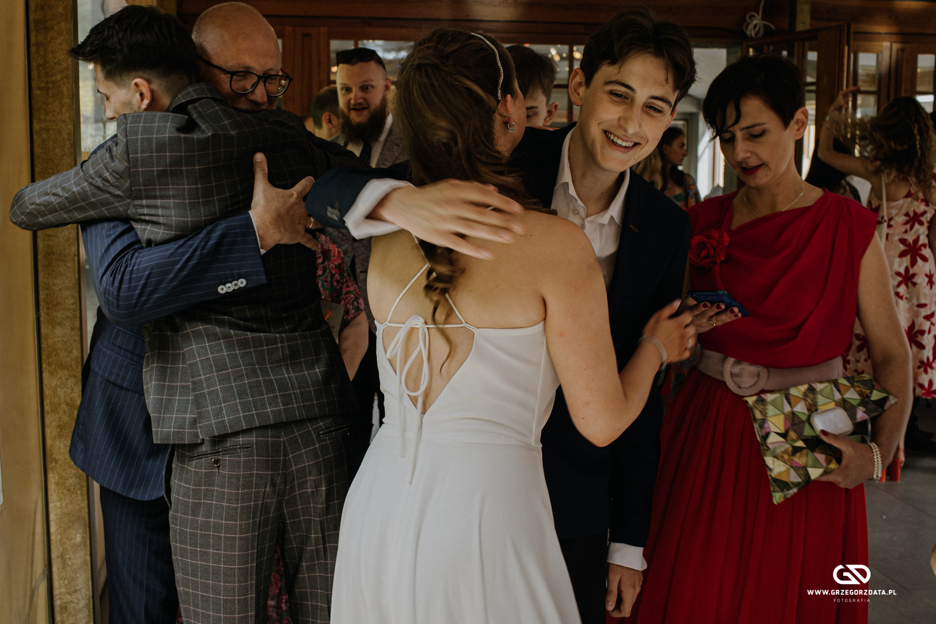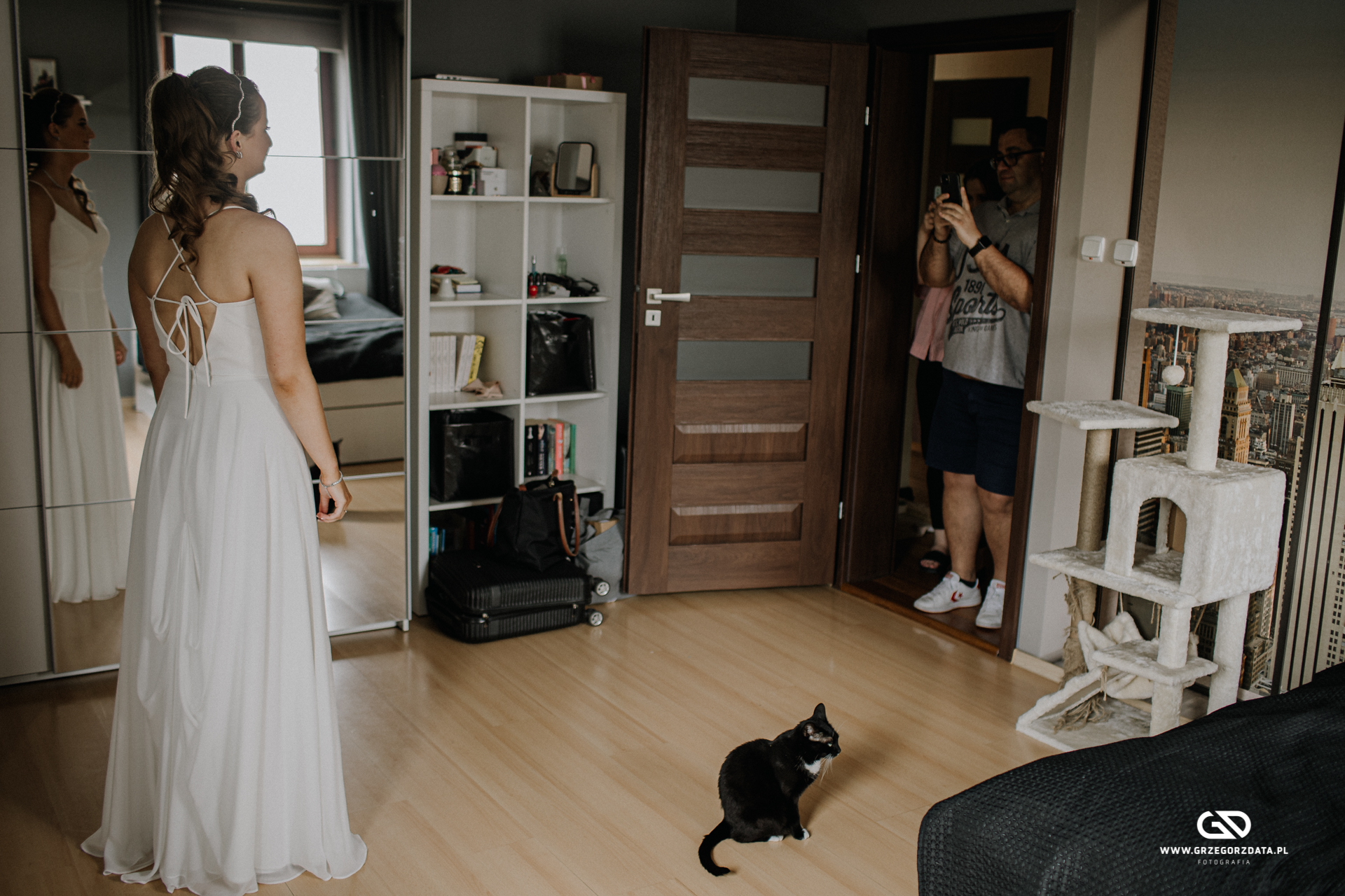 Młodzi spotkali się chwilę wcześniej, w Uroczysku, gdzie później świętowaliśmy. Tzw. First look miał miejsce w otoczeniu zieleni, pod kilkusetletnim dębem. Bez kamer, świadków, niepotrzebnego tej chwili blichtru. Było intymnie, a więc i szczególnie prawdziwie. Starałem się nie wchodzić w ten moment, a jedynie być jego niezauważalnym rejestratorem.