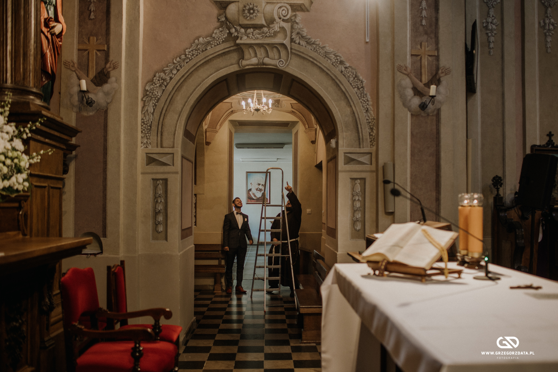 Tym razem reportaż ślubny rozpoczęliśmy nie od przygotowań w domach, ale od kościoła, który już sam w sobie robił ogromne wrażenie. To drewniany kościół pw. Trójcy Przenajświętszej "Na Terlikówce" w Tarnowie, będący okoliczną perełką. Tutaj grało wszystko – kameralny klimat, piękne, subtelne światło, duch szesnastowiecznej historii. Byłem urzeczony!
